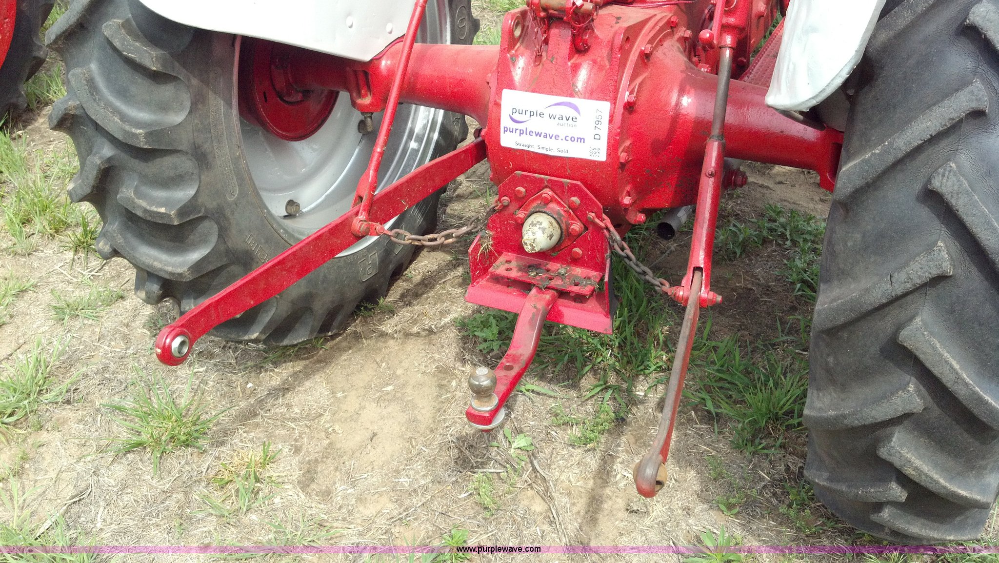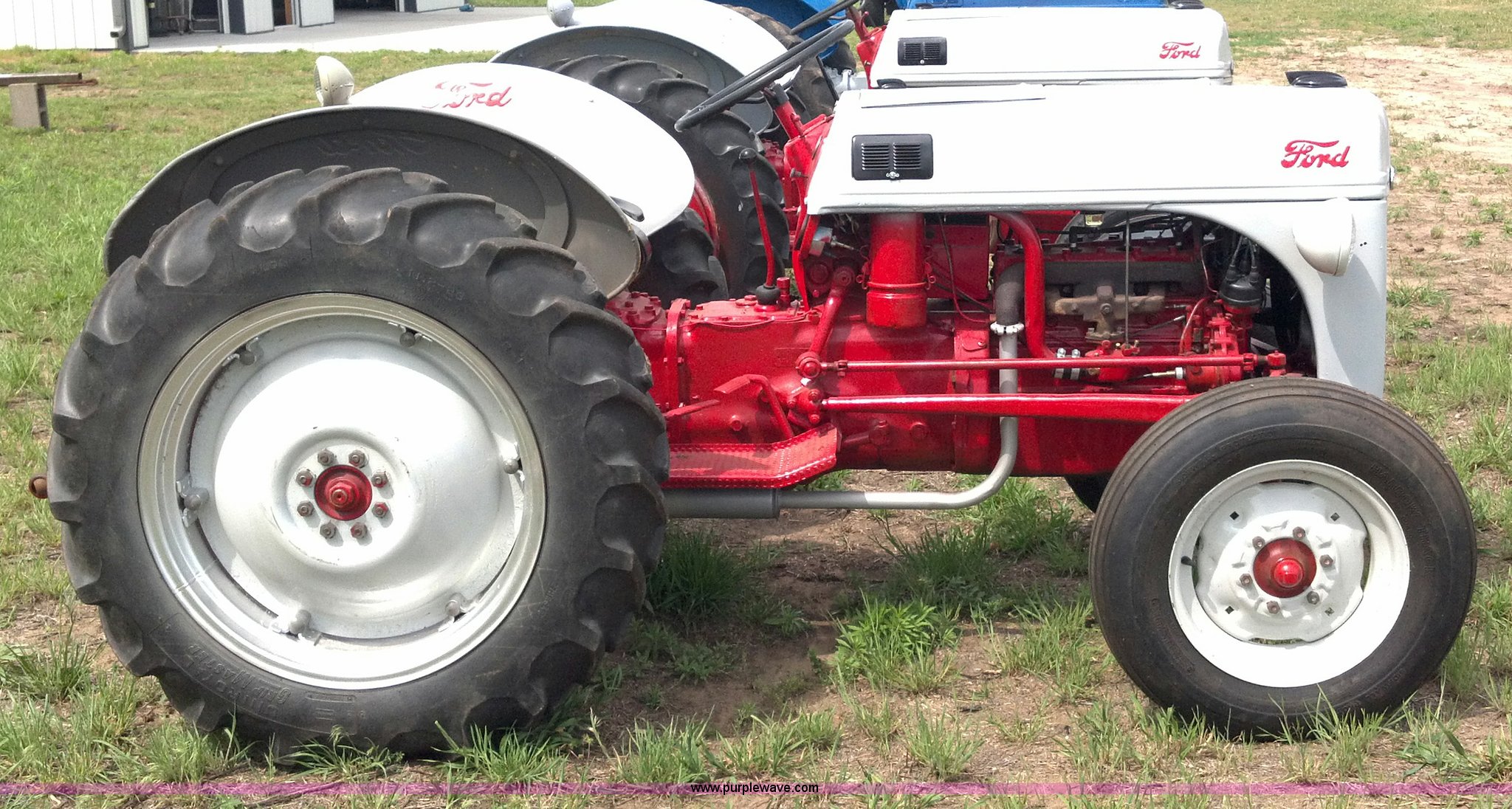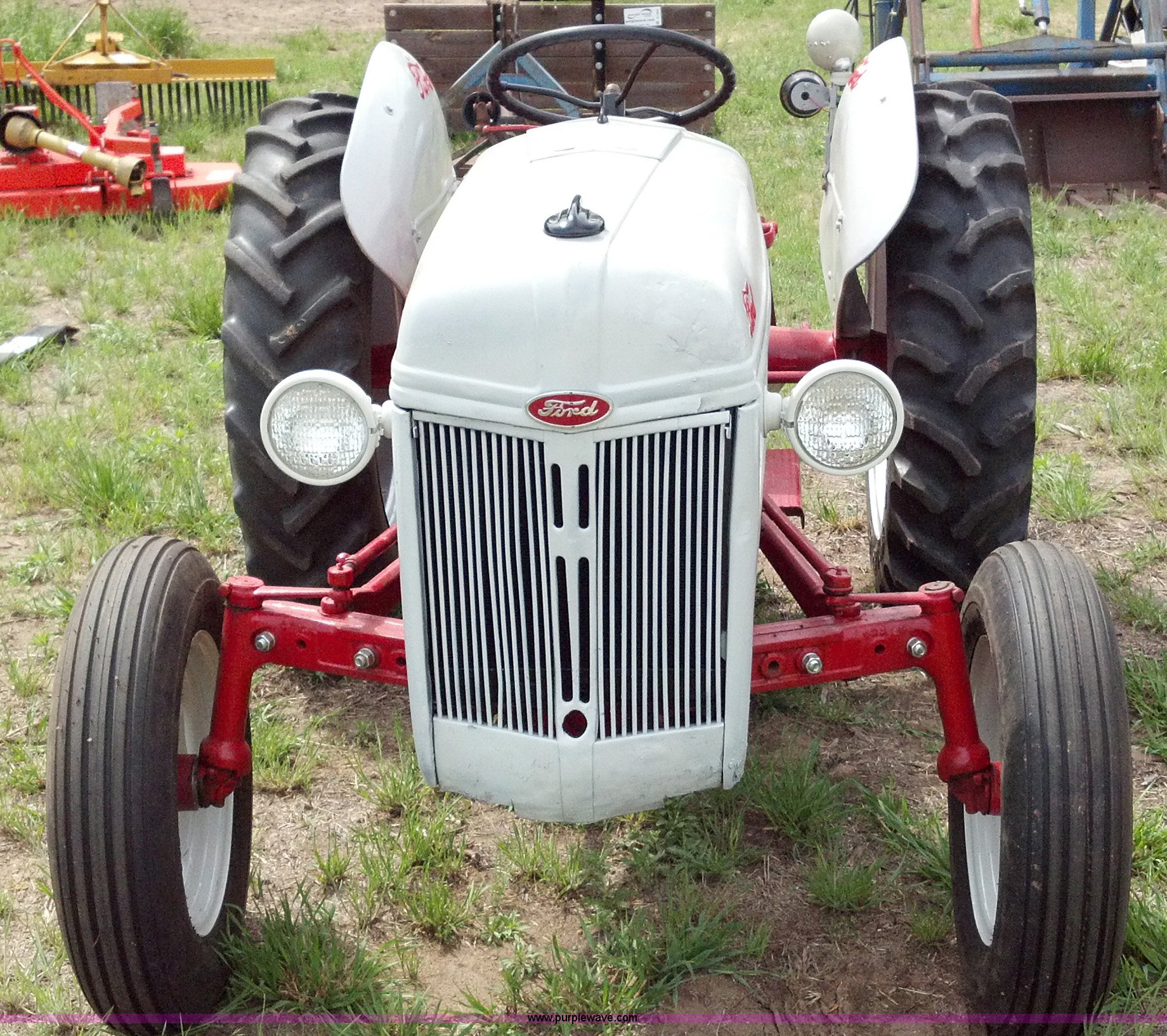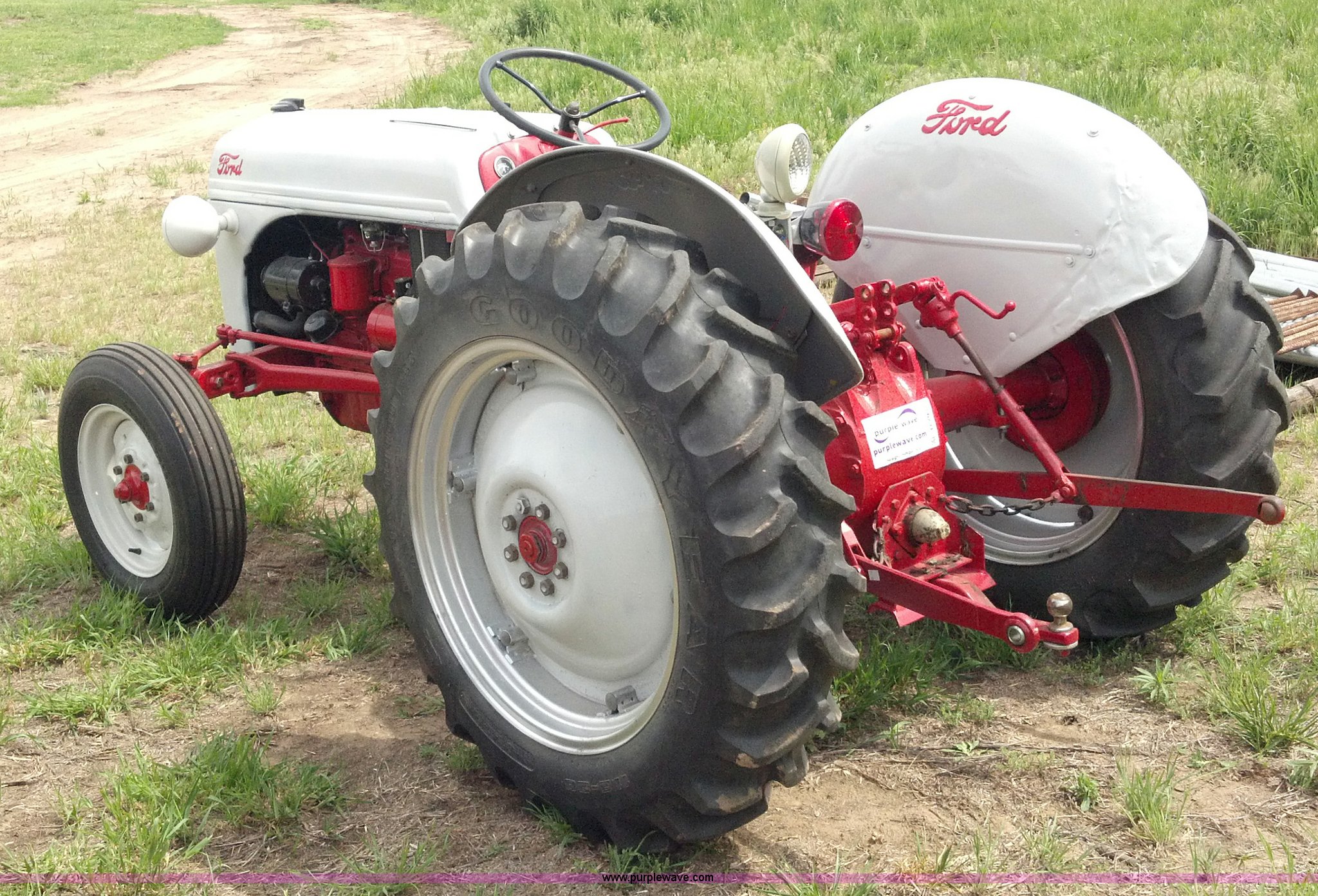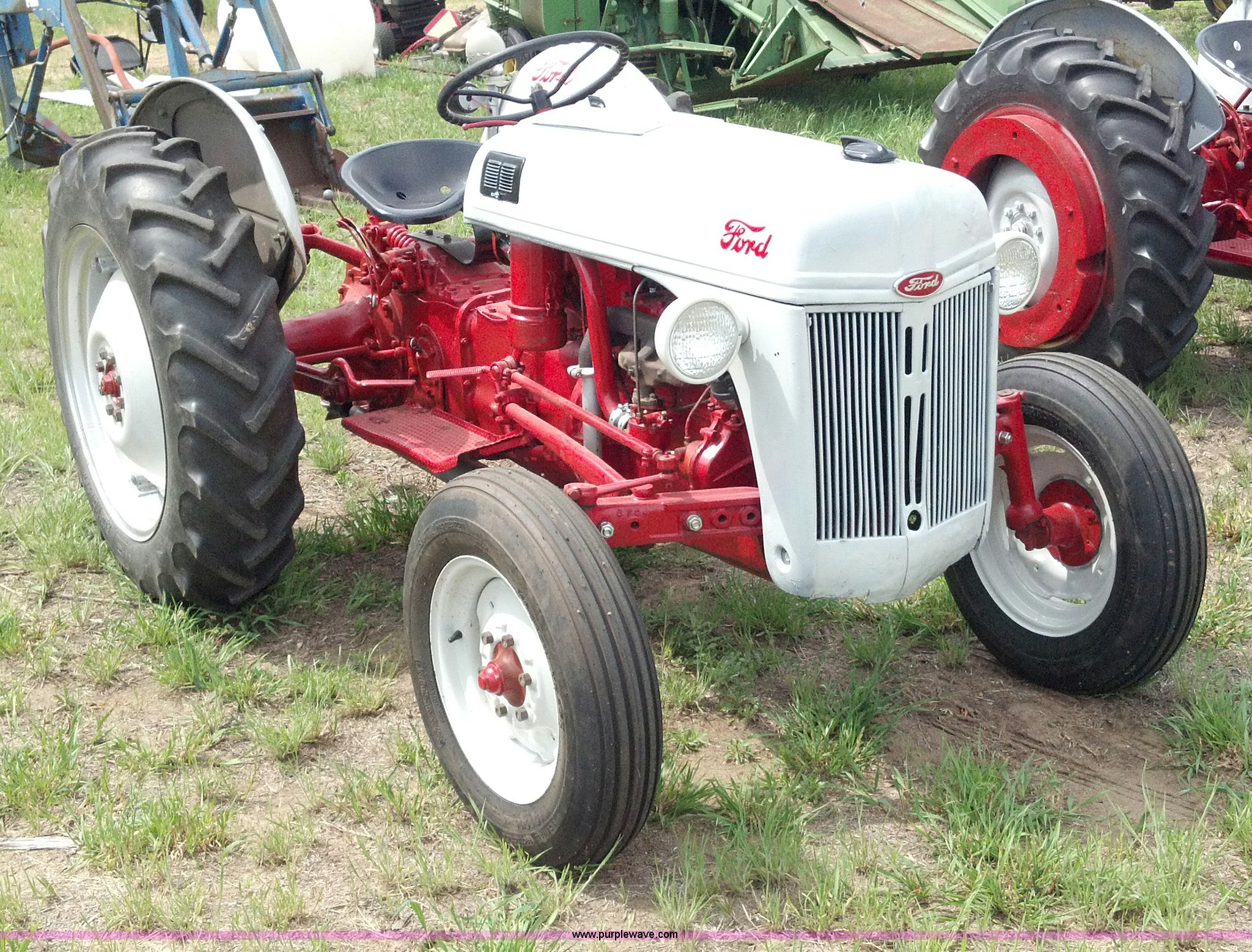 Purple Wave is selling a used Tractor in Kansas. This item is a 1951 Ford 8N tractor with the following: 2 hours on meter, Flathead four cylinder gas engine, Manual transmission, 4F-1R gears, 540 PTO, Three point hitch, Missing top link, Draw bar, Front work lights, Recently replaced 6.00-16 front tires, 11.2-28 rear tires, Recently replaced items, Gauges, Wiring, Battery, Tool box, Battery carrier, Gas tank, Generator, Exhaust, Lights