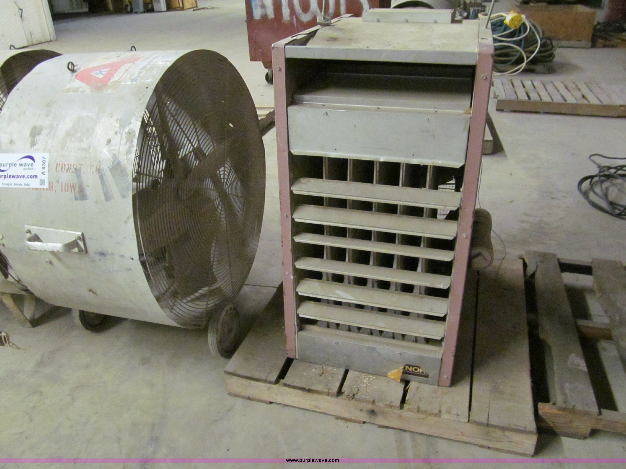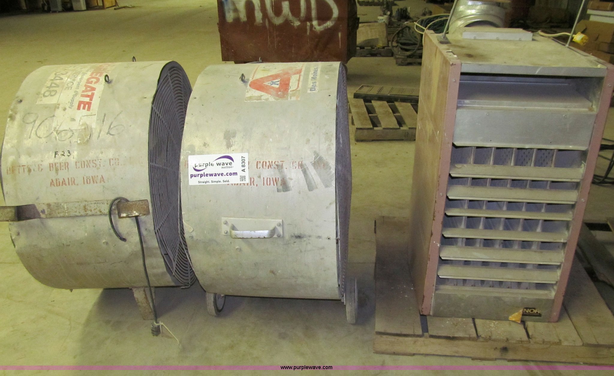 (2) portable shop fans. 35" diameter, 110V. Reznor furnace 110V, Natural gas. Shipping quotes available. Caliber Concrete LLC. 314 East Hillcrest. Adair, IA 50002