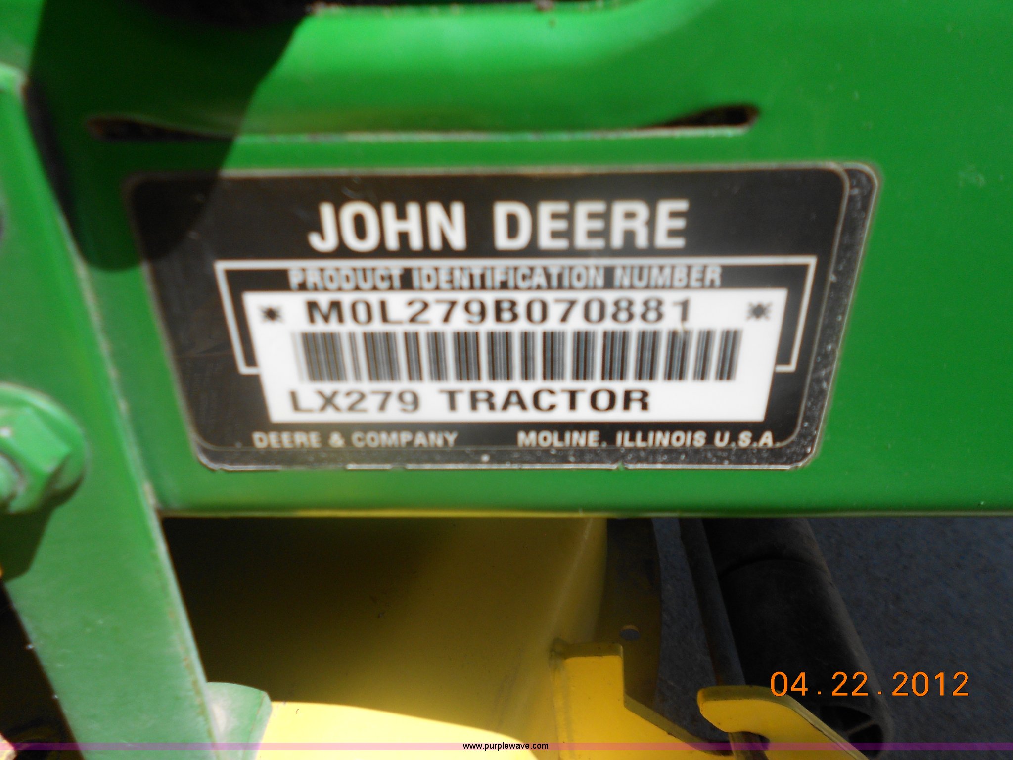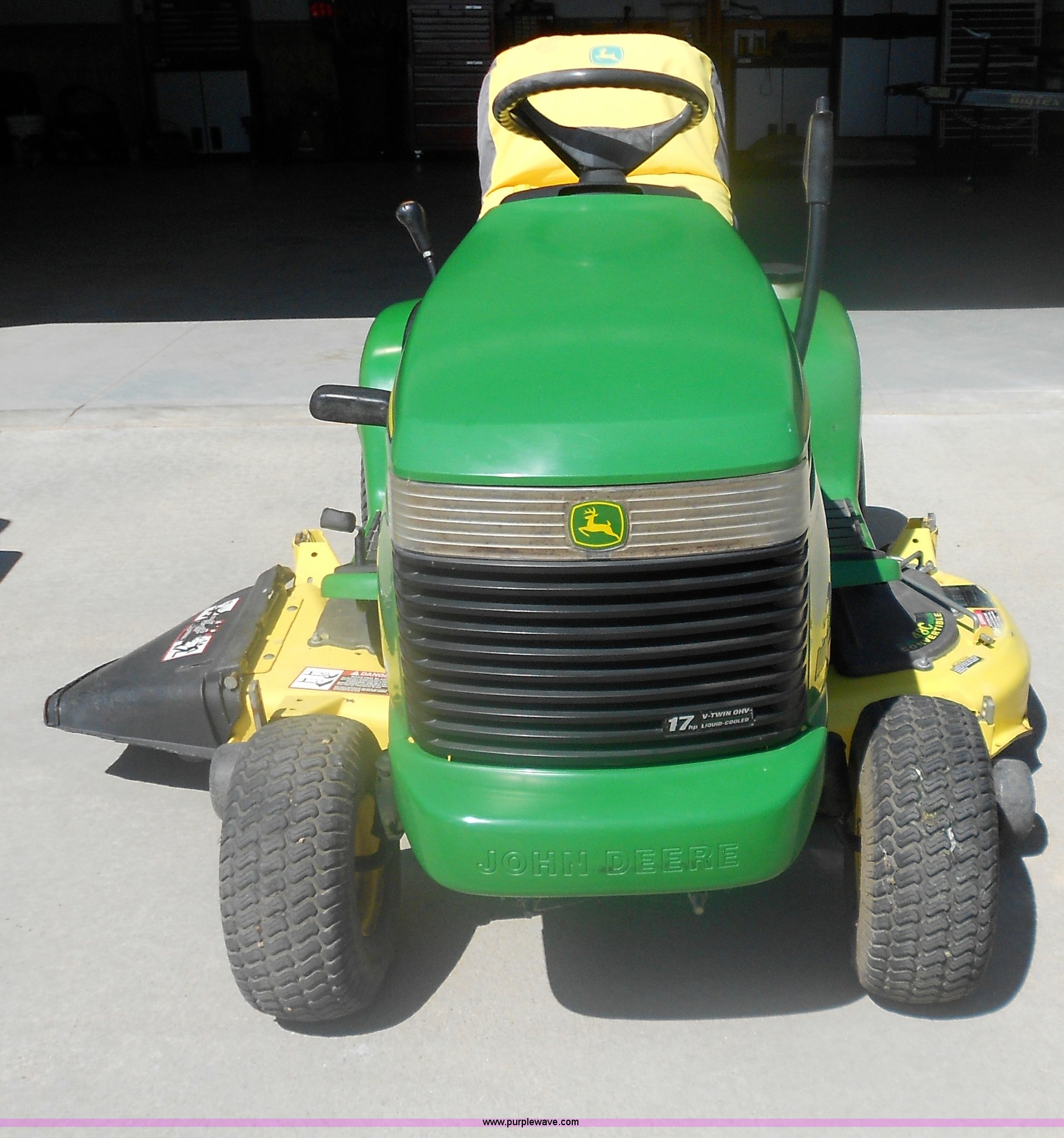 Purple Wave is selling a used Lawn Mower in Kansas. This item is a John Deere LX279 mower with the following: 555 hours on meter, 48C convertible 48" deck, Kawasaki 17 HP V-twin liquid cooled engine, Twin-touch automatic transmission, Serial M0L279B070881