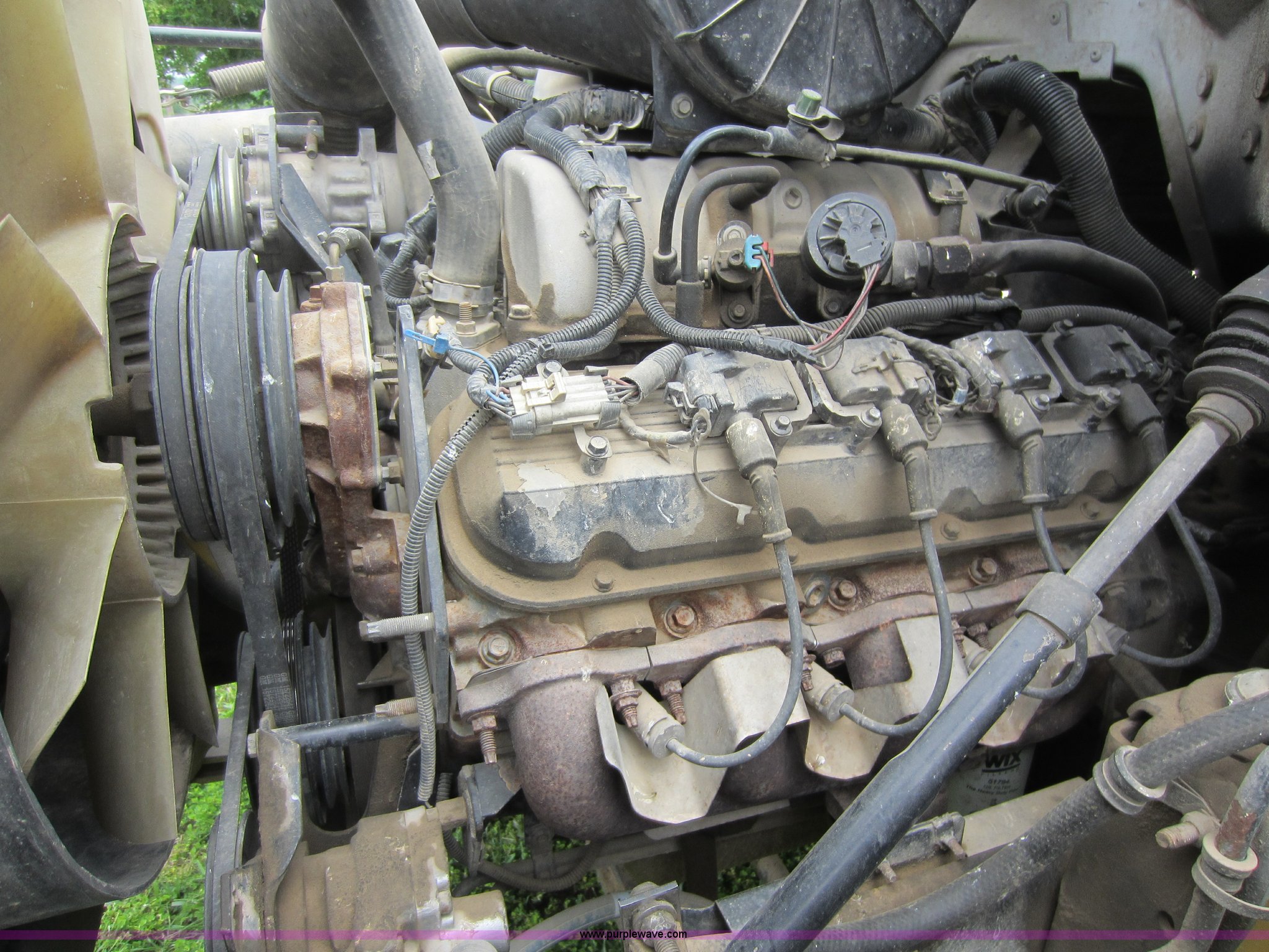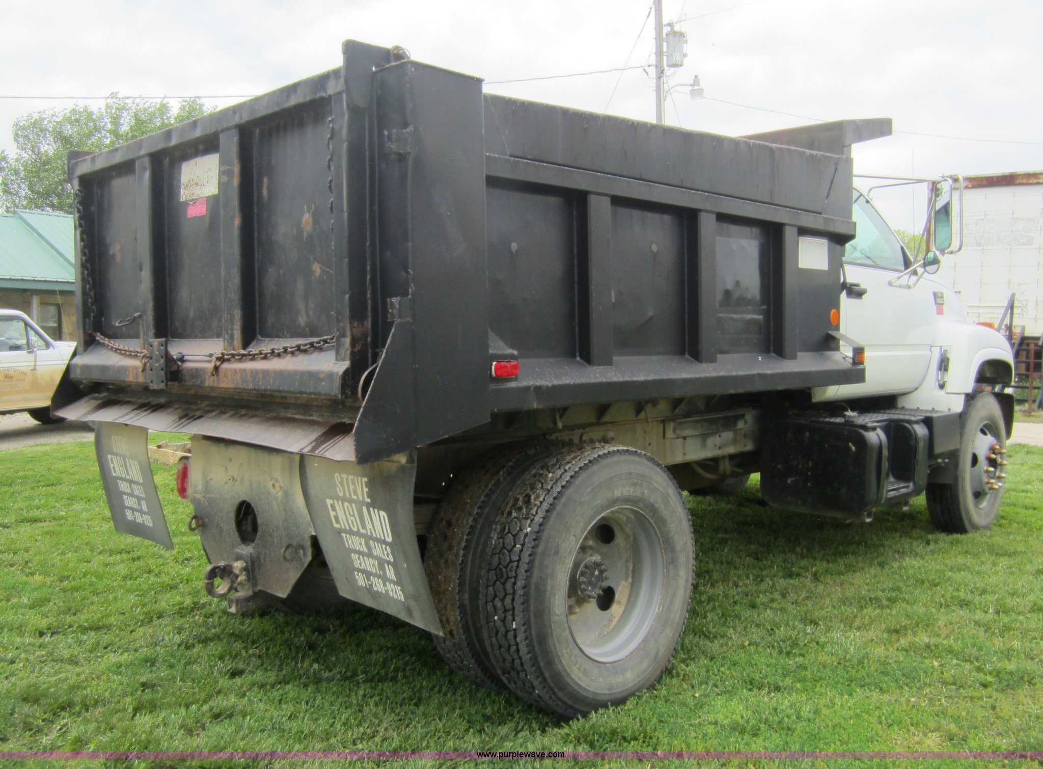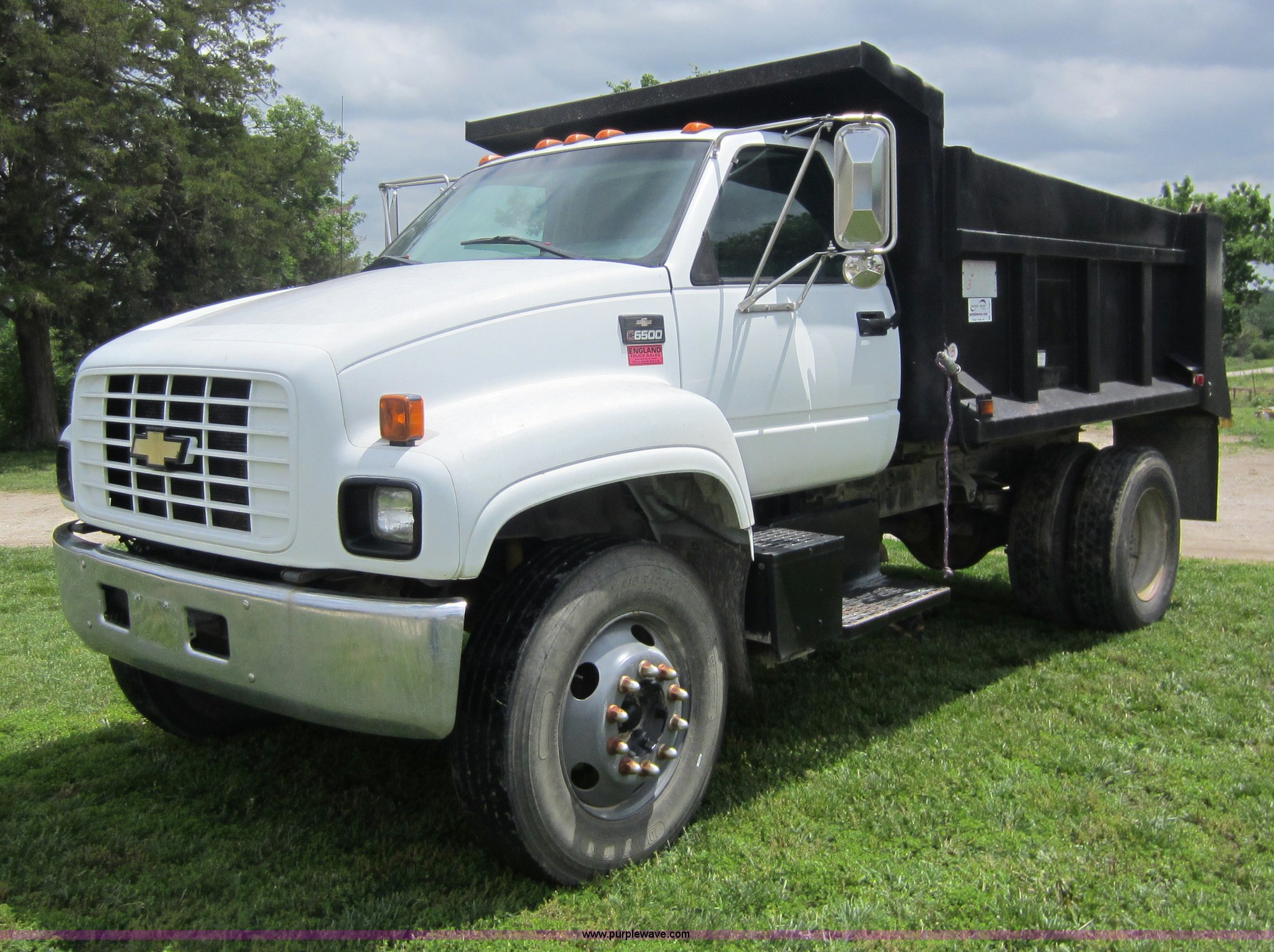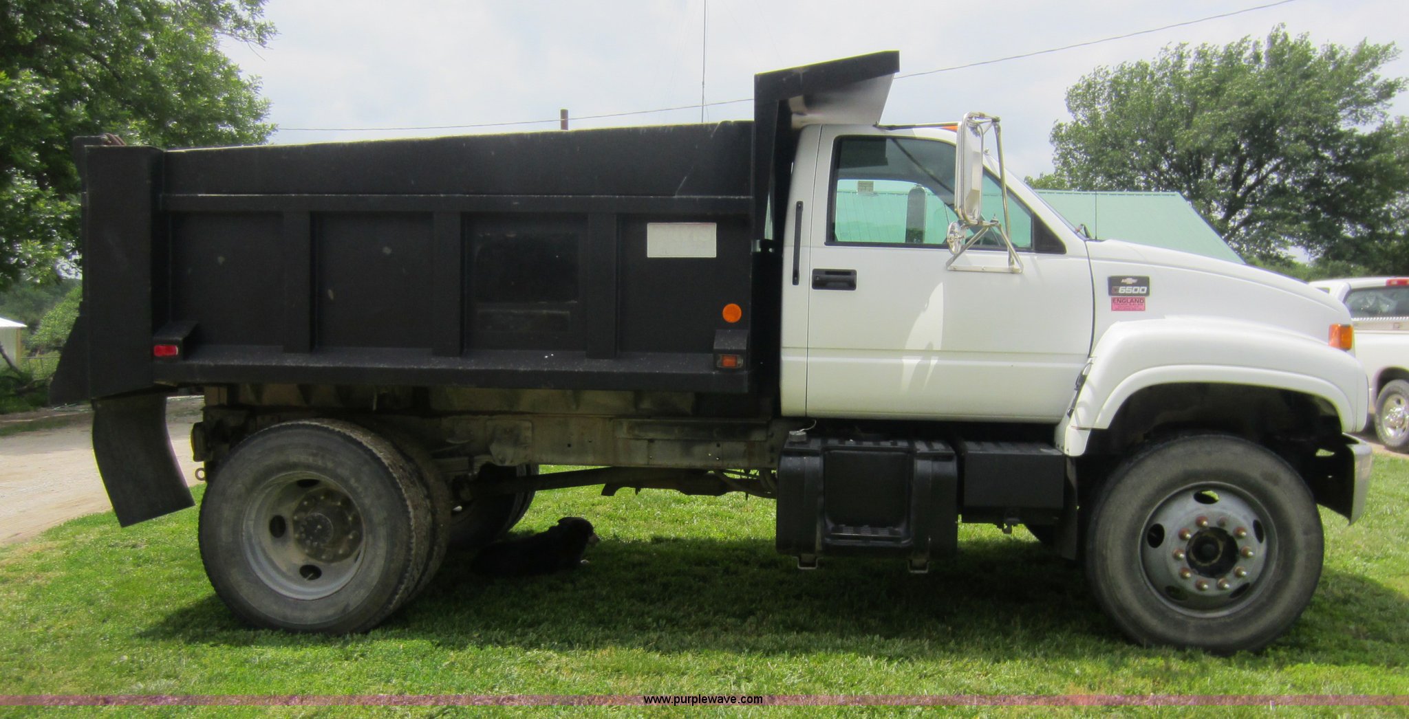 Purple Wave is selling a used Construction Dump Truck in Kansas. This item is a 2000 Chevrolet C6500 dump truck with the following: 135,458 miles on odometer, 7.4L V8 gas engine, Five speed manual transmission, Two speed rear axle, AC and heat, AM/FM, Chrome bumper, Pintle hitch, Three stage single ram, 10' Davis truck bed, 36" side walls, Manual end gate, 60 gallon fuel tank, Spring suspension, PTO, Hydraulic brakes, 158" wheelbase, 295/75R22.5 tires, GVWR 29,950 lbs, FAWR 8,100 lbs, RAWR 8,600 lbs