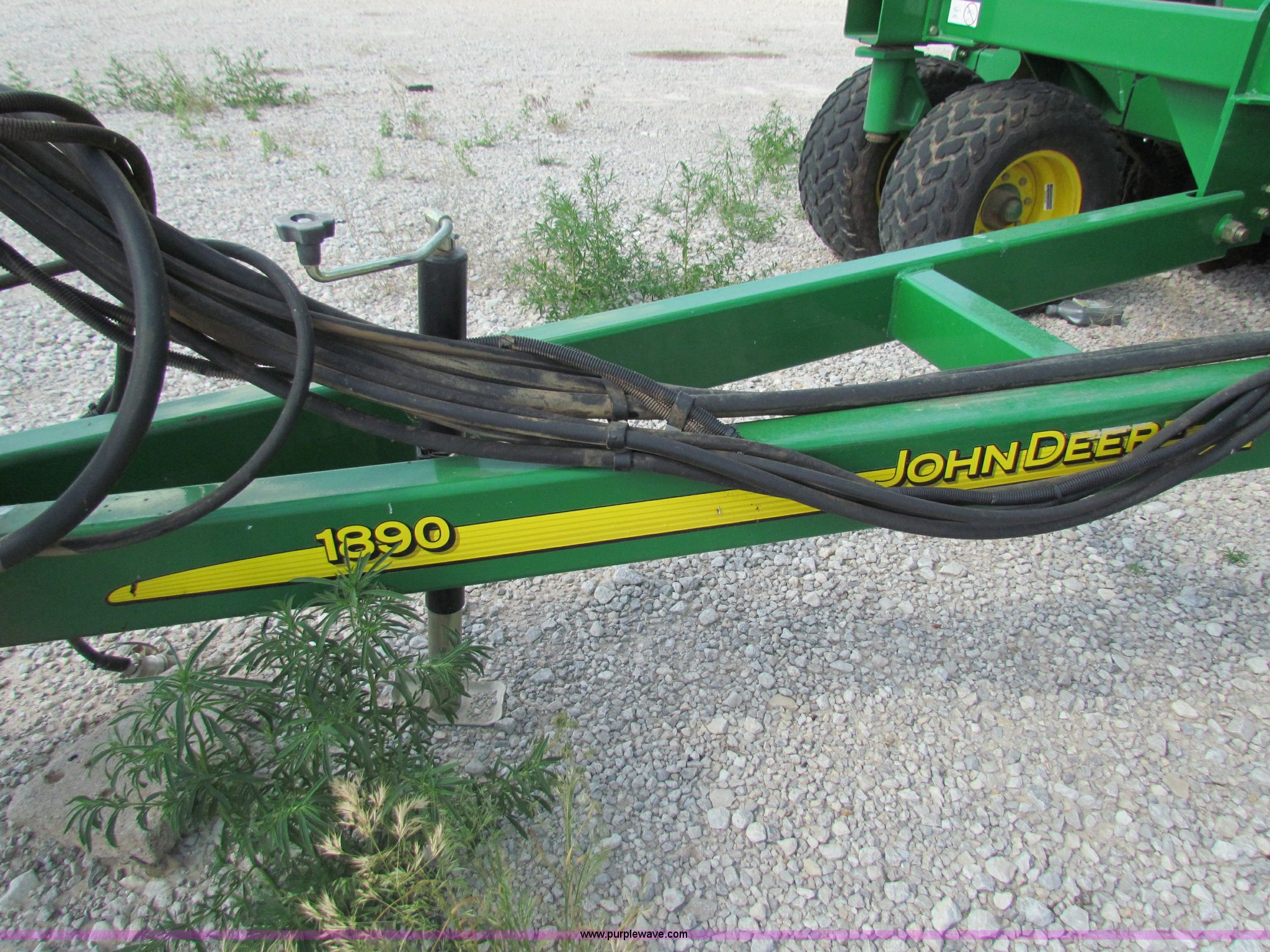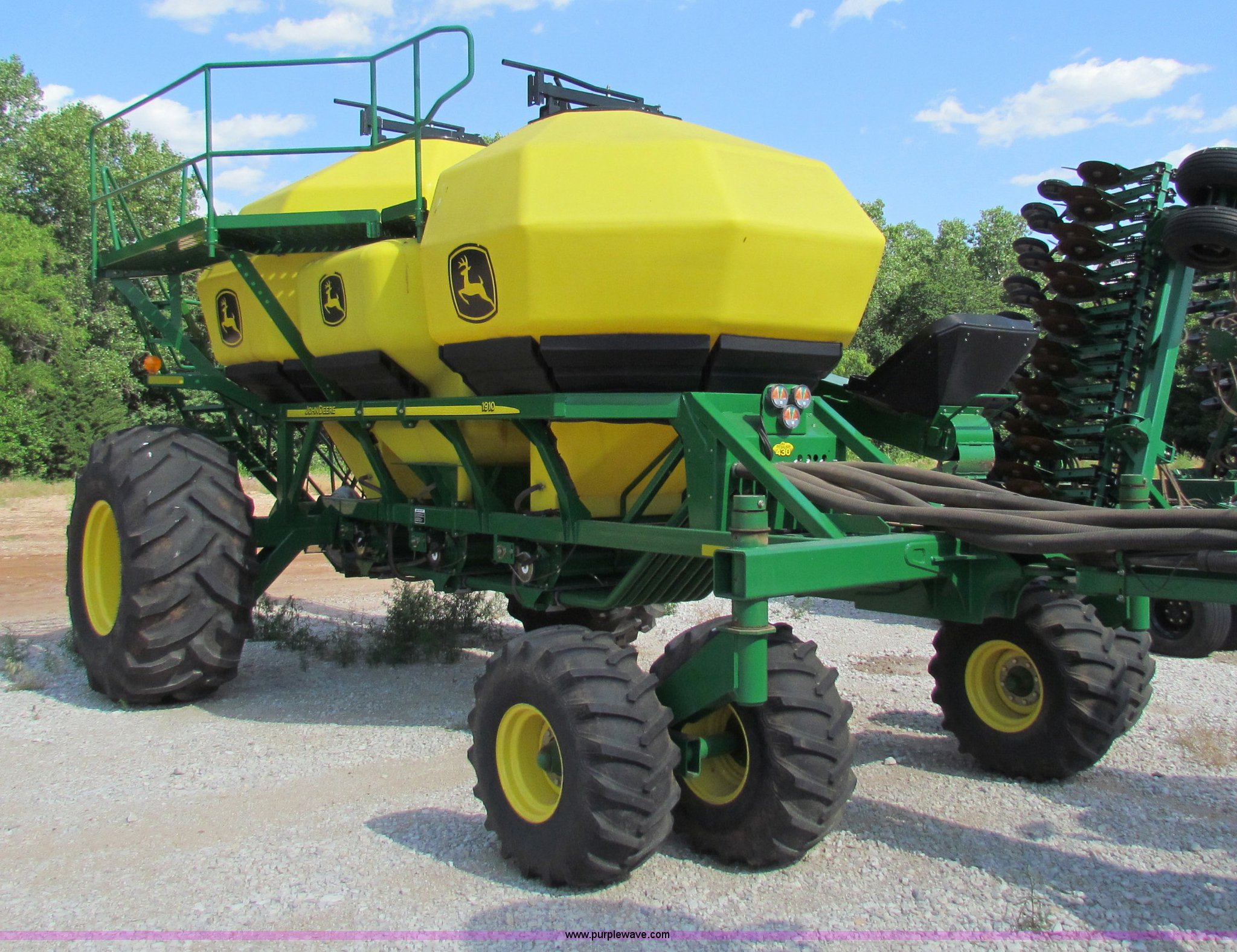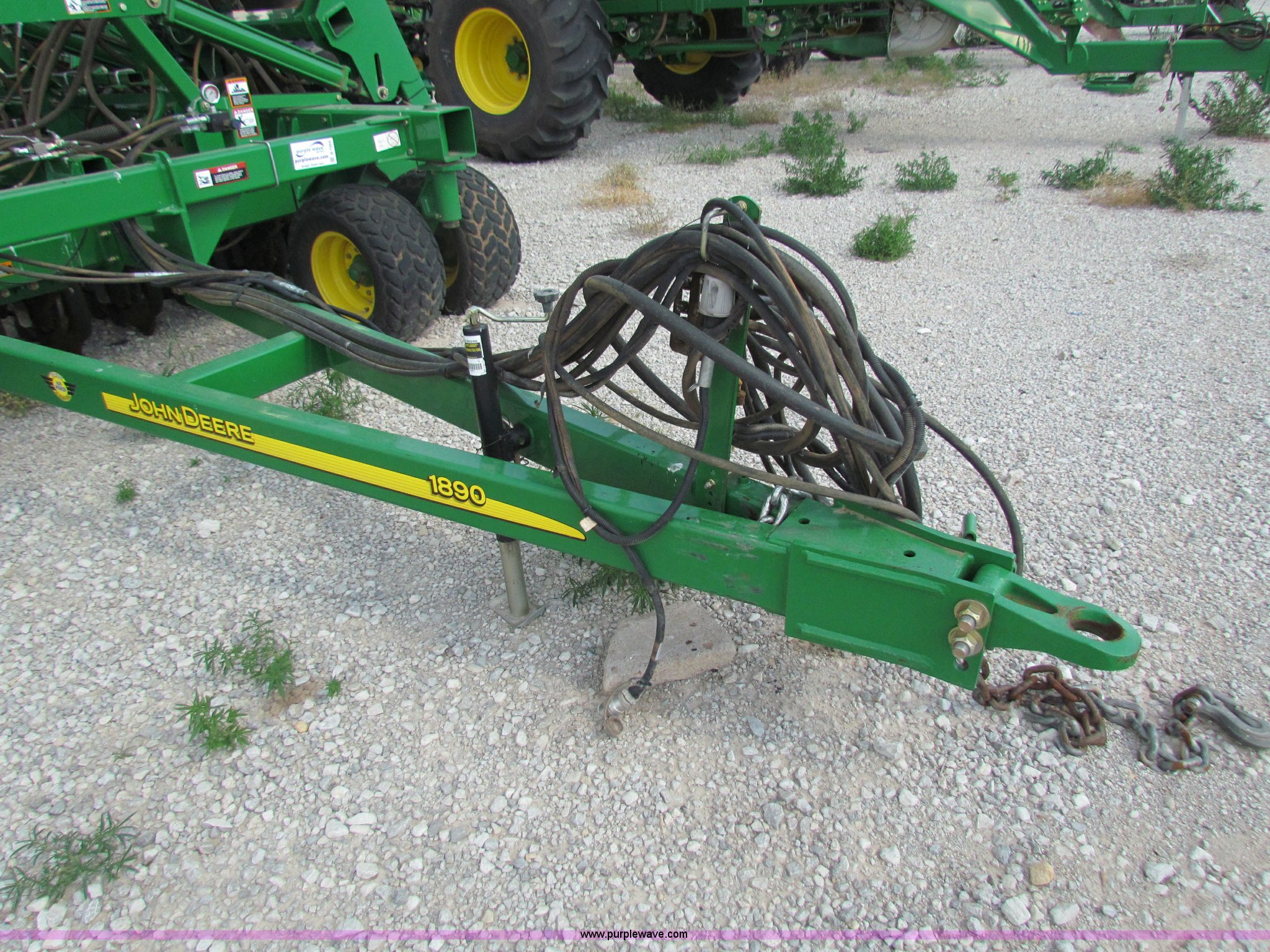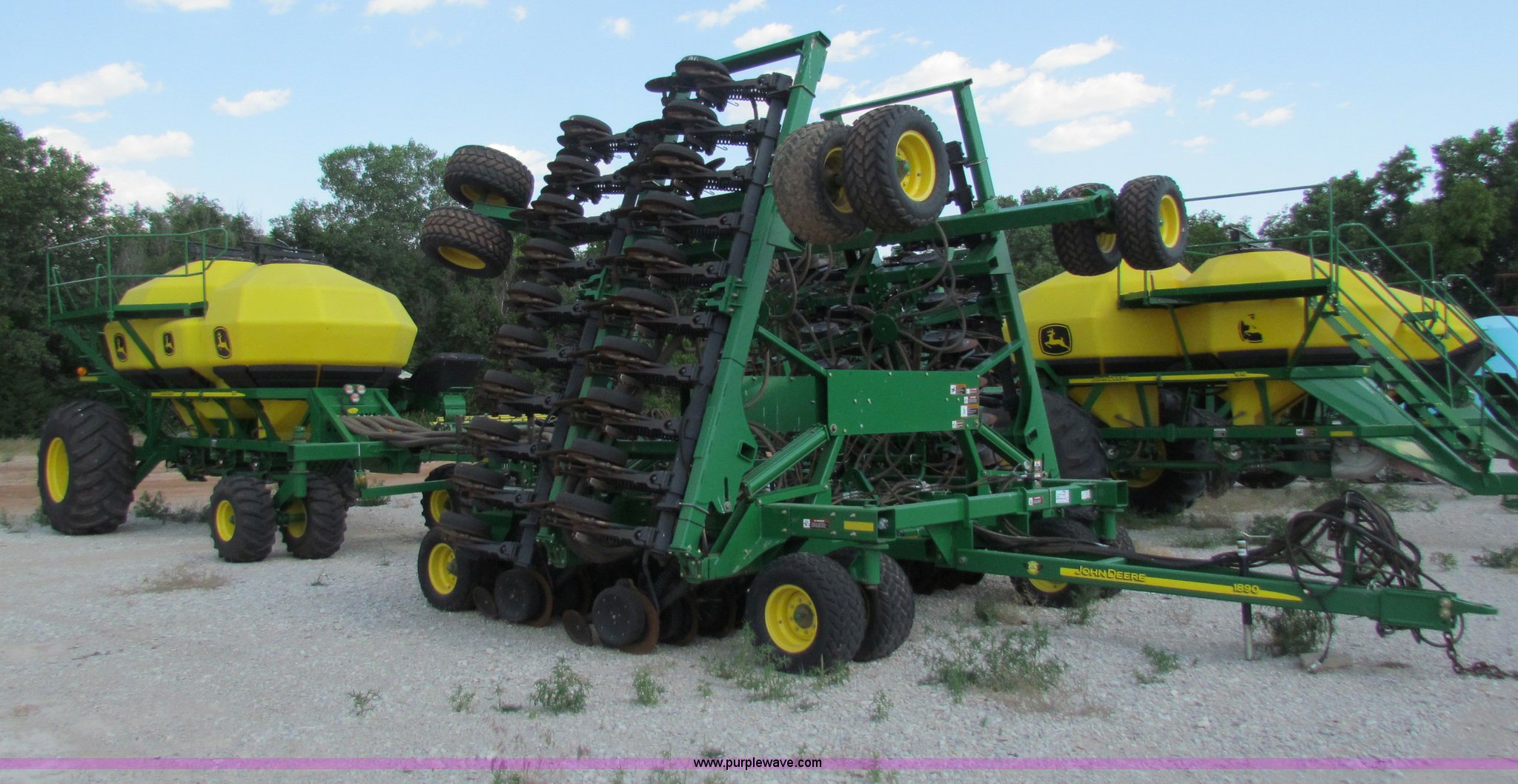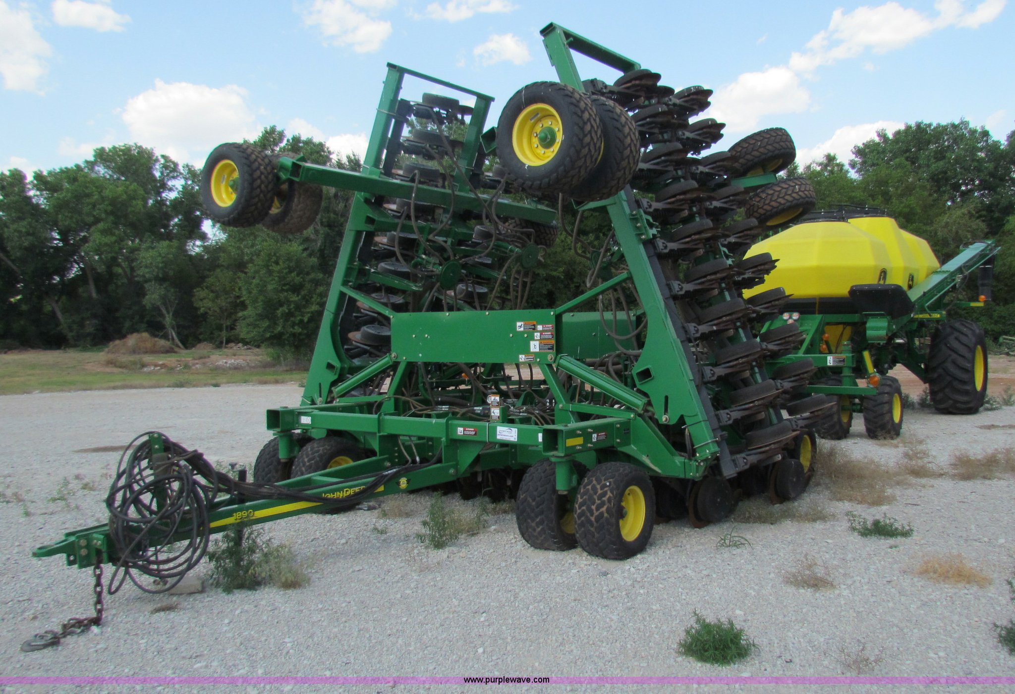 Purple Wave is selling a used Air Seeder in Kansas. This item is a 2008 John Deere 1890 drill with 2008 John Deere 1910 Air Cart with the following: 40', 7.5" spacing, Dual row spacing capable, 7.5"/15"/30",, Primary blockage, 2008 air cart 1910, 430 bushel tow behind, (3) tank variable rate, Conveyor auger, Single shoot eight runs, Walking duals on front, 30.5-32 tires on rear, Stored inside, Recently replaced closing wheel bushings, blades, some gauge wheel rubbers, and some bearings, $8,900 of parts installed in November 2010, Stock# 67447, 67534