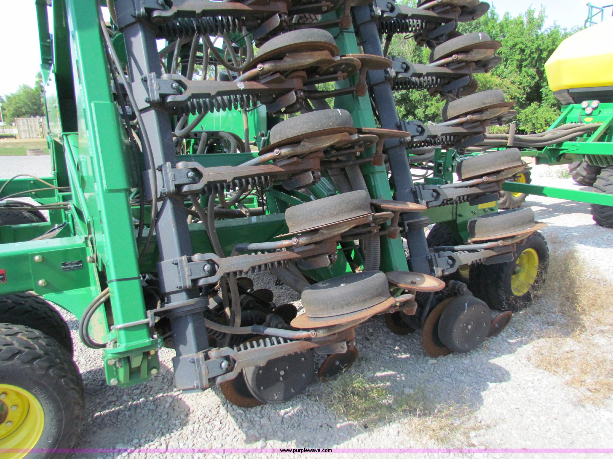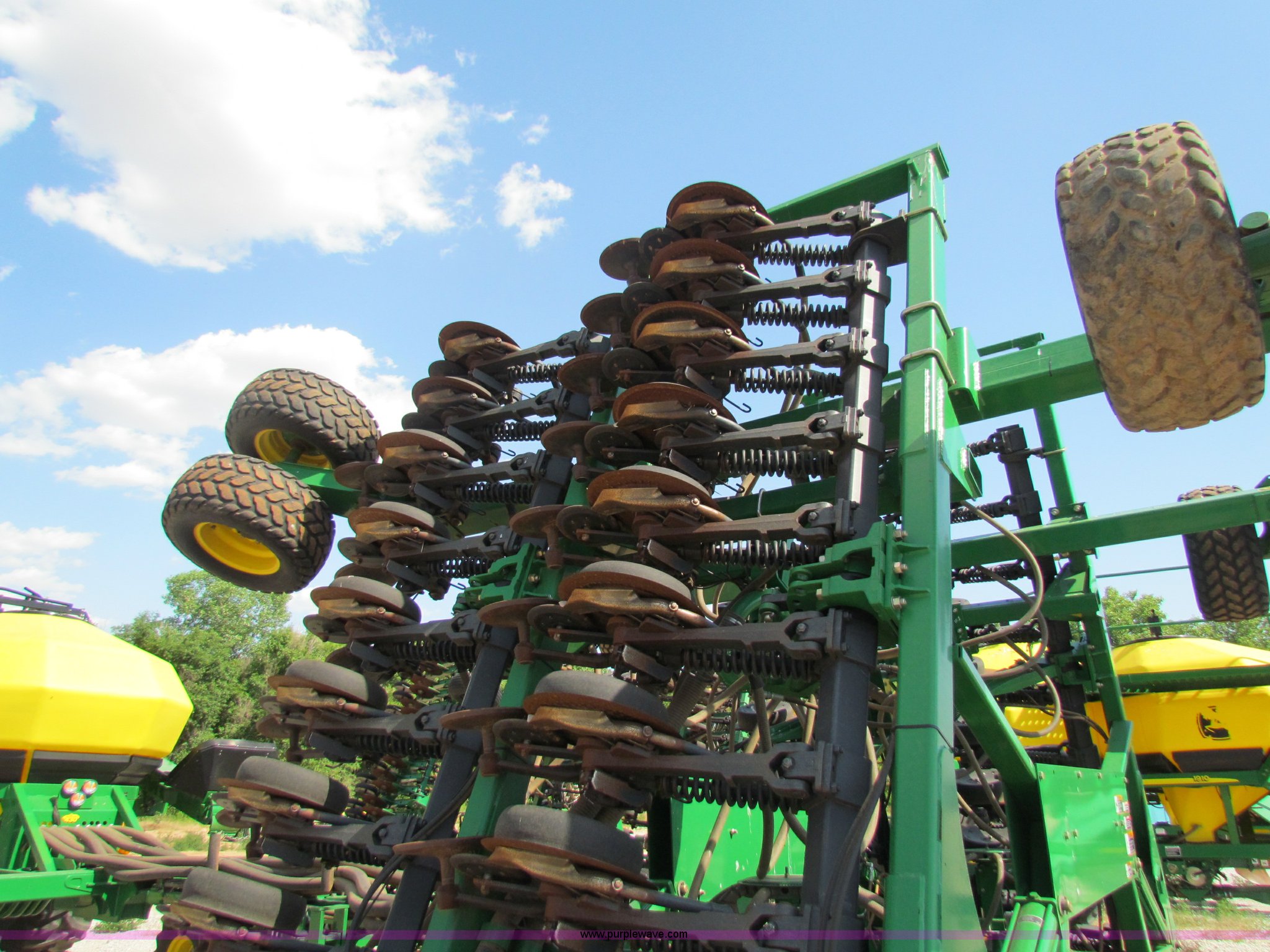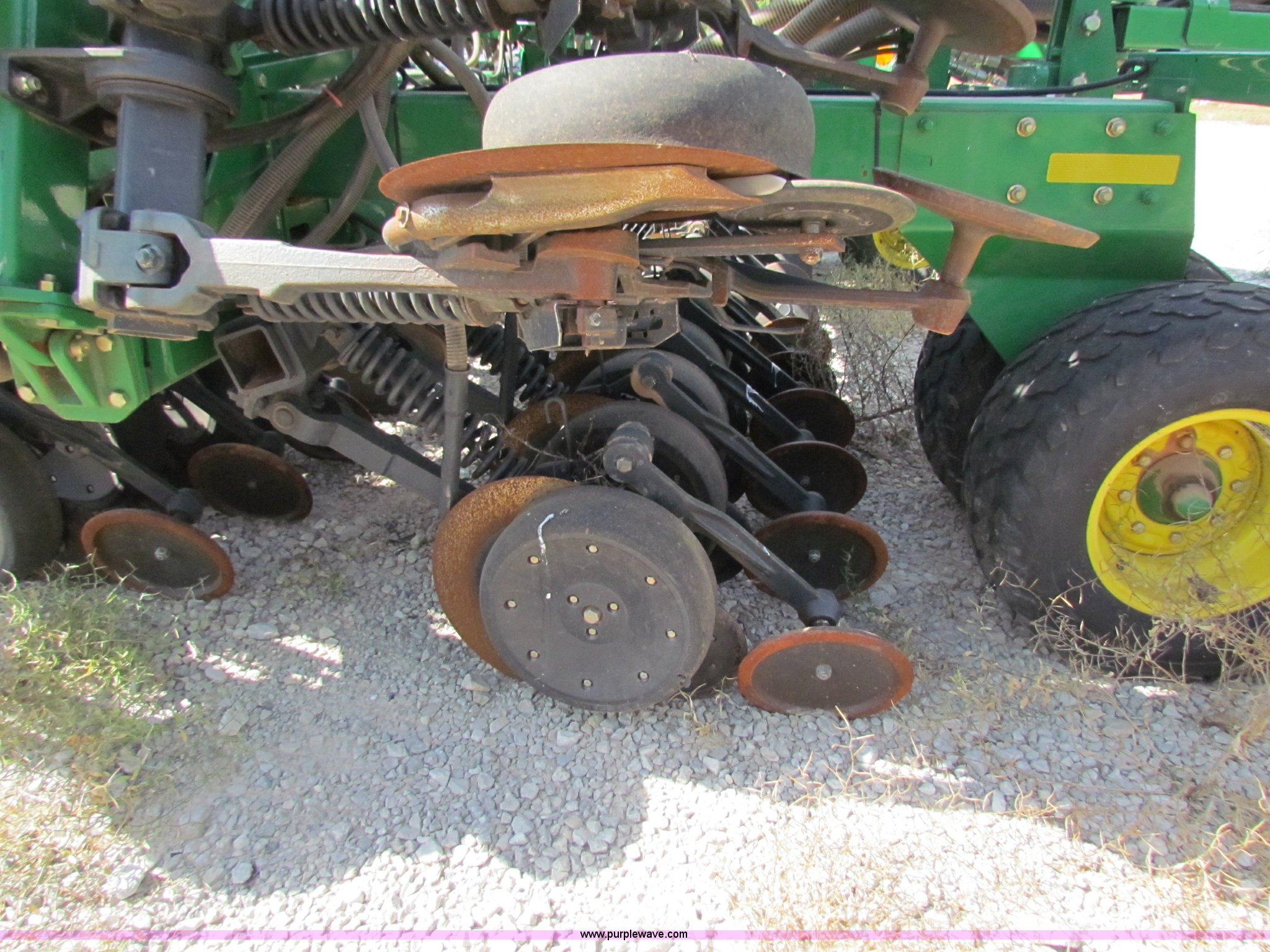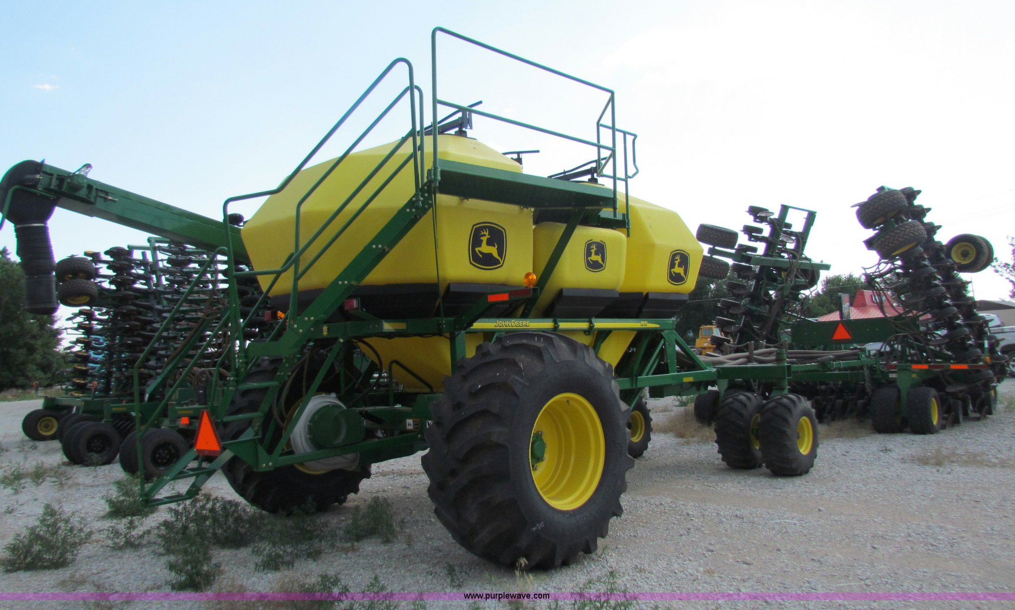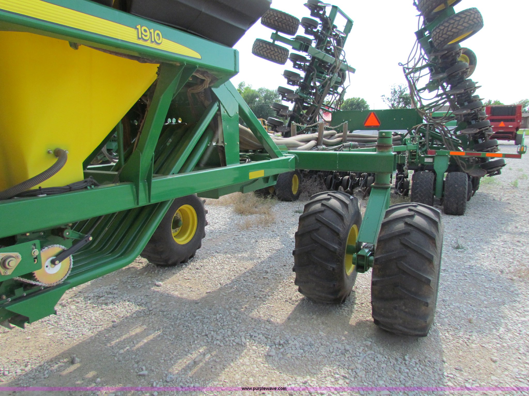Purple Wave is selling a used Air Seeder in Kansas. This item is a 2008 John Deere 1890 drill with 2008 John Deere 1910 Air Cart with the following: 40', 7.5" spacing, Dual row spacing capable, 7.5"/15"/30",, Primary blockage, 2008 air cart 1910, 430 bushel tow behind, (3) tank variable rate, Conveyor auger, Single shoot eight runs, Walking duals on front, 30.5-32 tires on rear, Stored inside, Recently replaced closing wheel bushings, blades, some gauge wheel rubbers, and some bearings, $8,900 of parts installed in November 2010, Stock# 67447, 67534