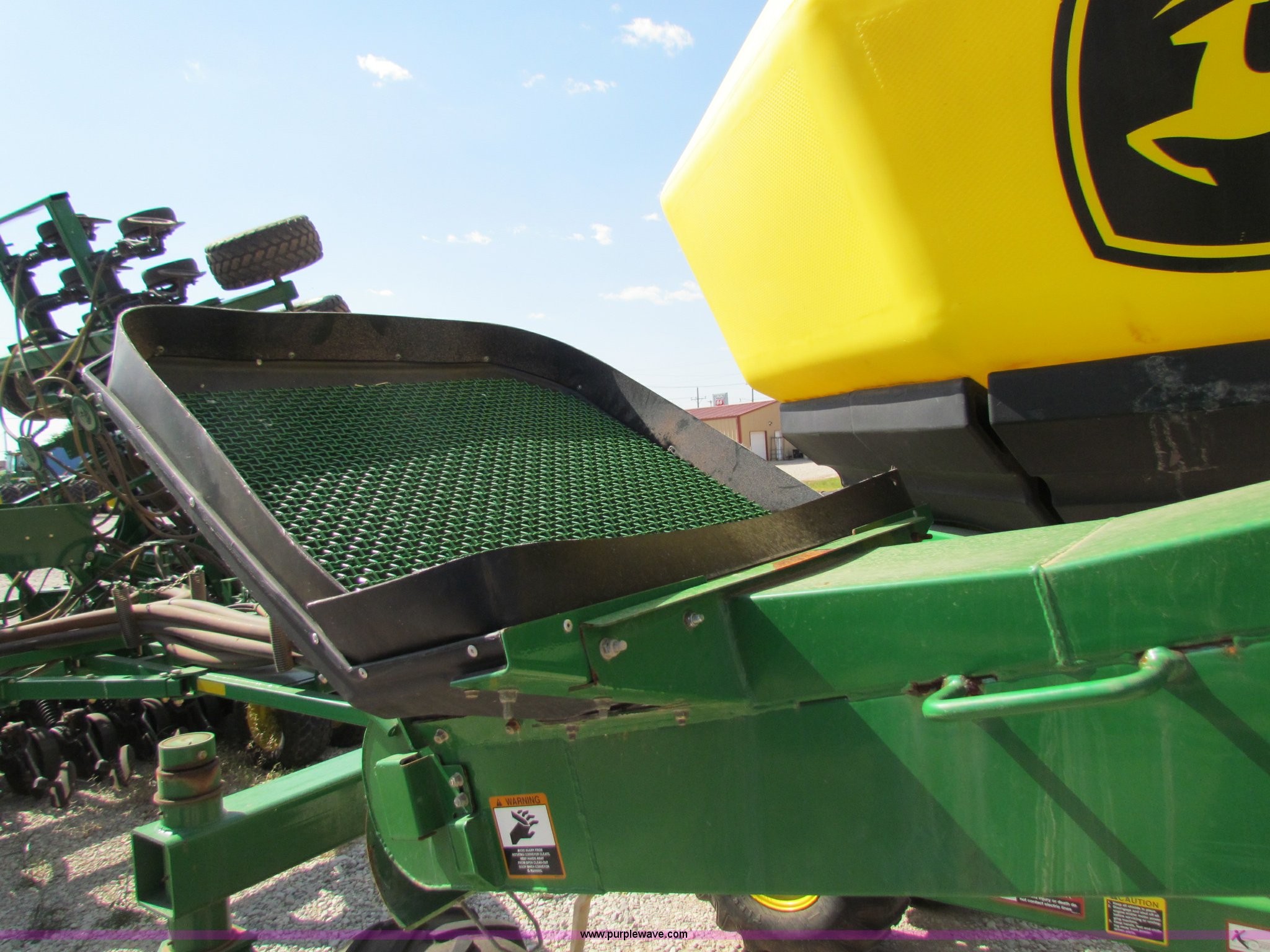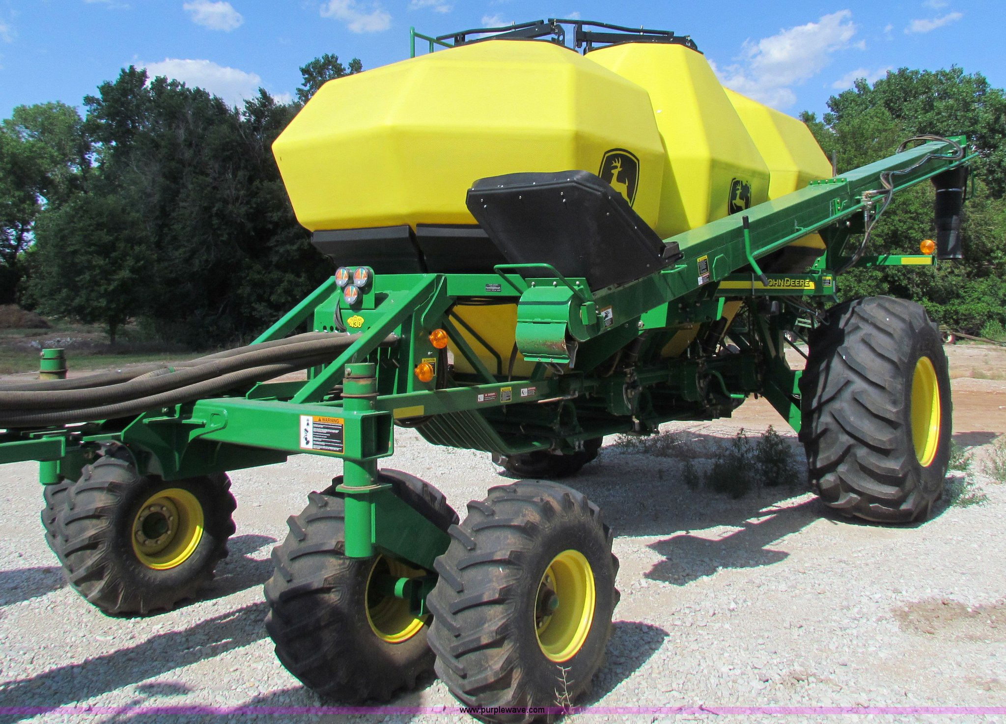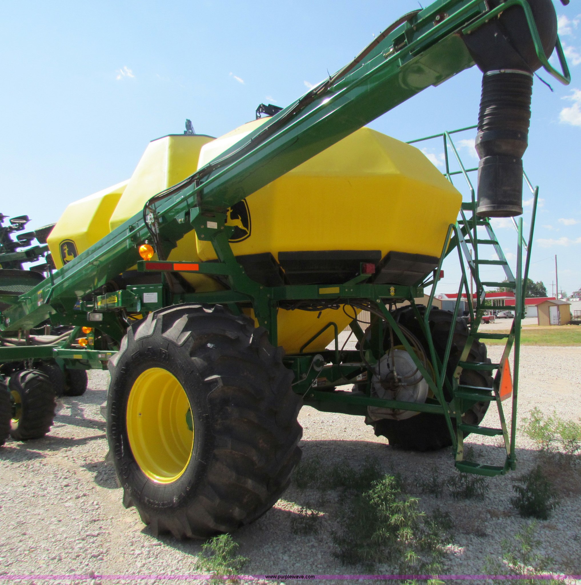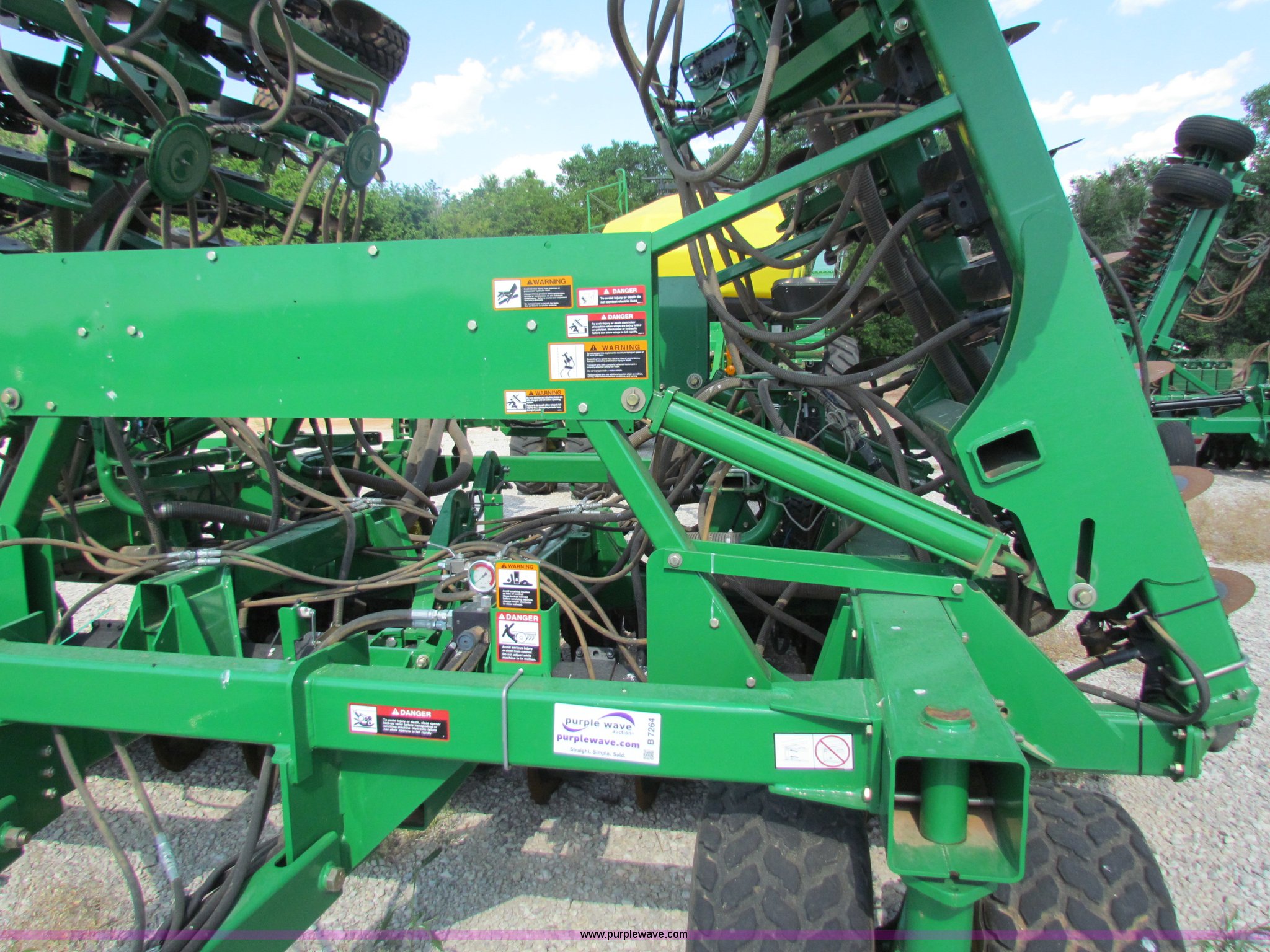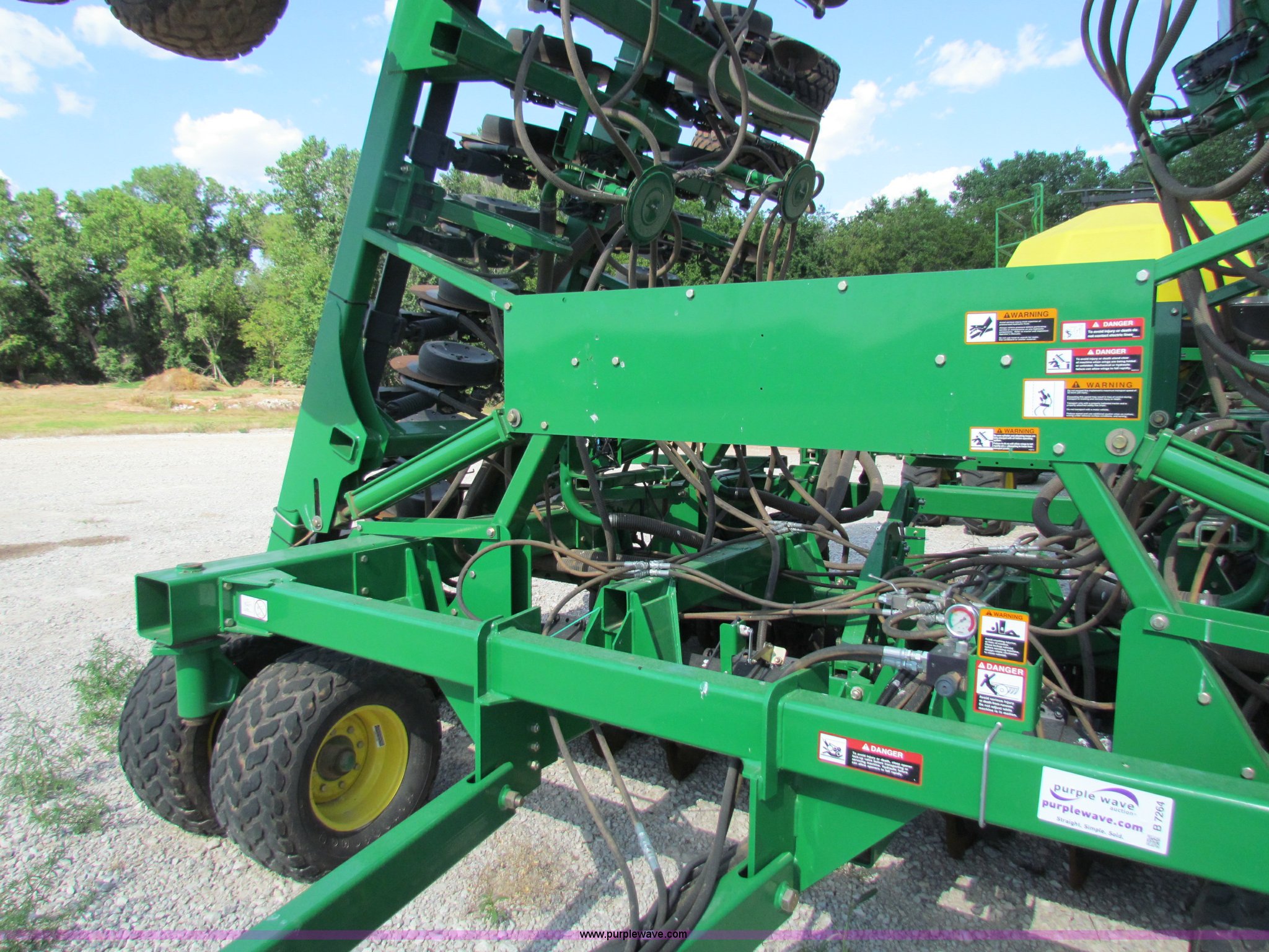 Purple Wave is selling a used Air Seeder in Kansas. This item is a 2008 John Deere 1890 drill with 2008 John Deere 1910 Air Cart with the following: 40', 7.5" spacing, Dual row spacing capable, 7.5"/15"/30",, Primary blockage, 2008 air cart 1910, 430 bushel tow behind, (3) tank variable rate, Conveyor auger, Single shoot eight runs, Walking duals on front, 30.5-32 tires on rear, Stored inside, Recently replaced closing wheel bushings, blades, some gauge wheel rubbers, and some bearings, $8,900 of parts installed in November 2010, Stock# 67447, 67534