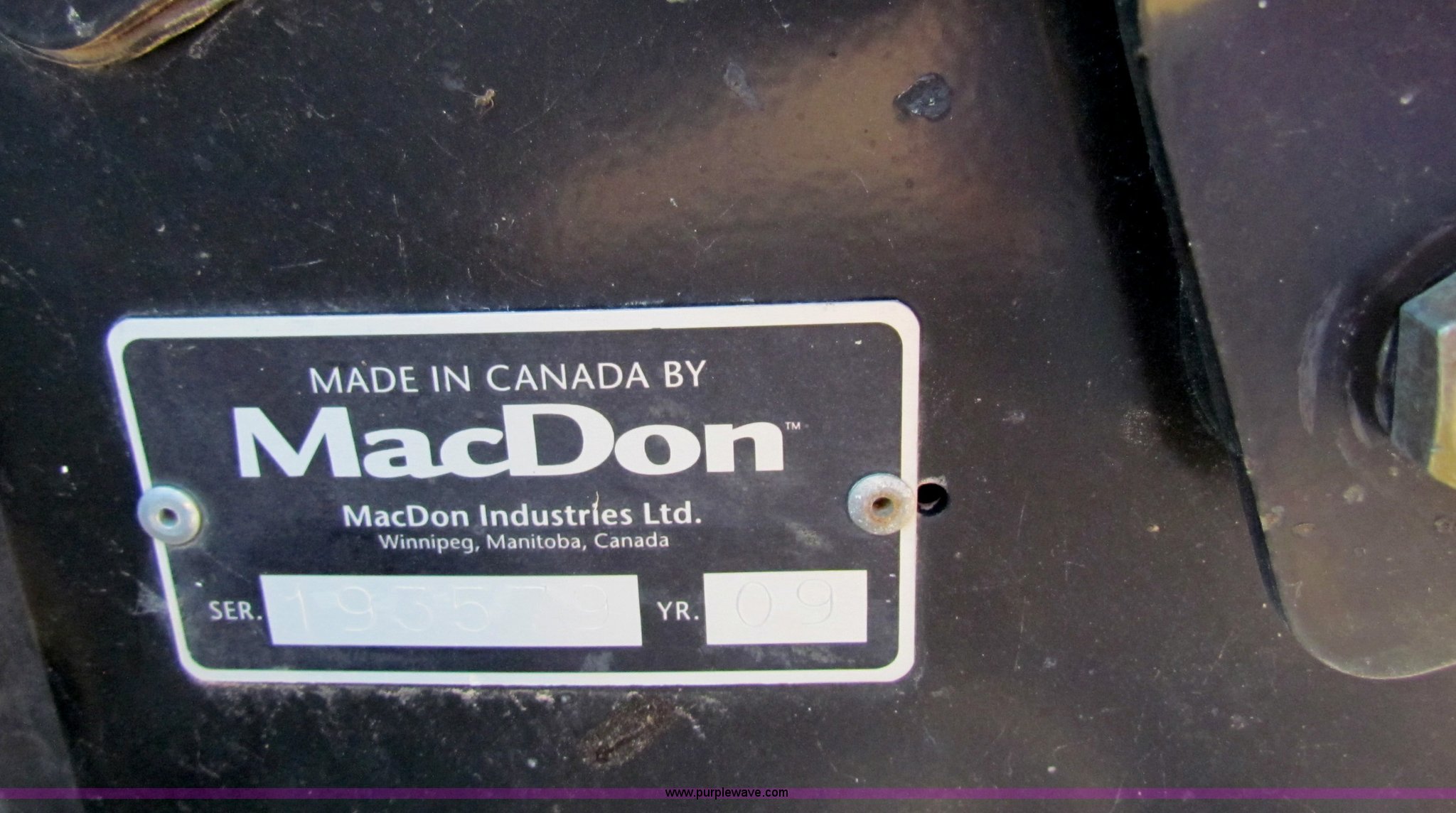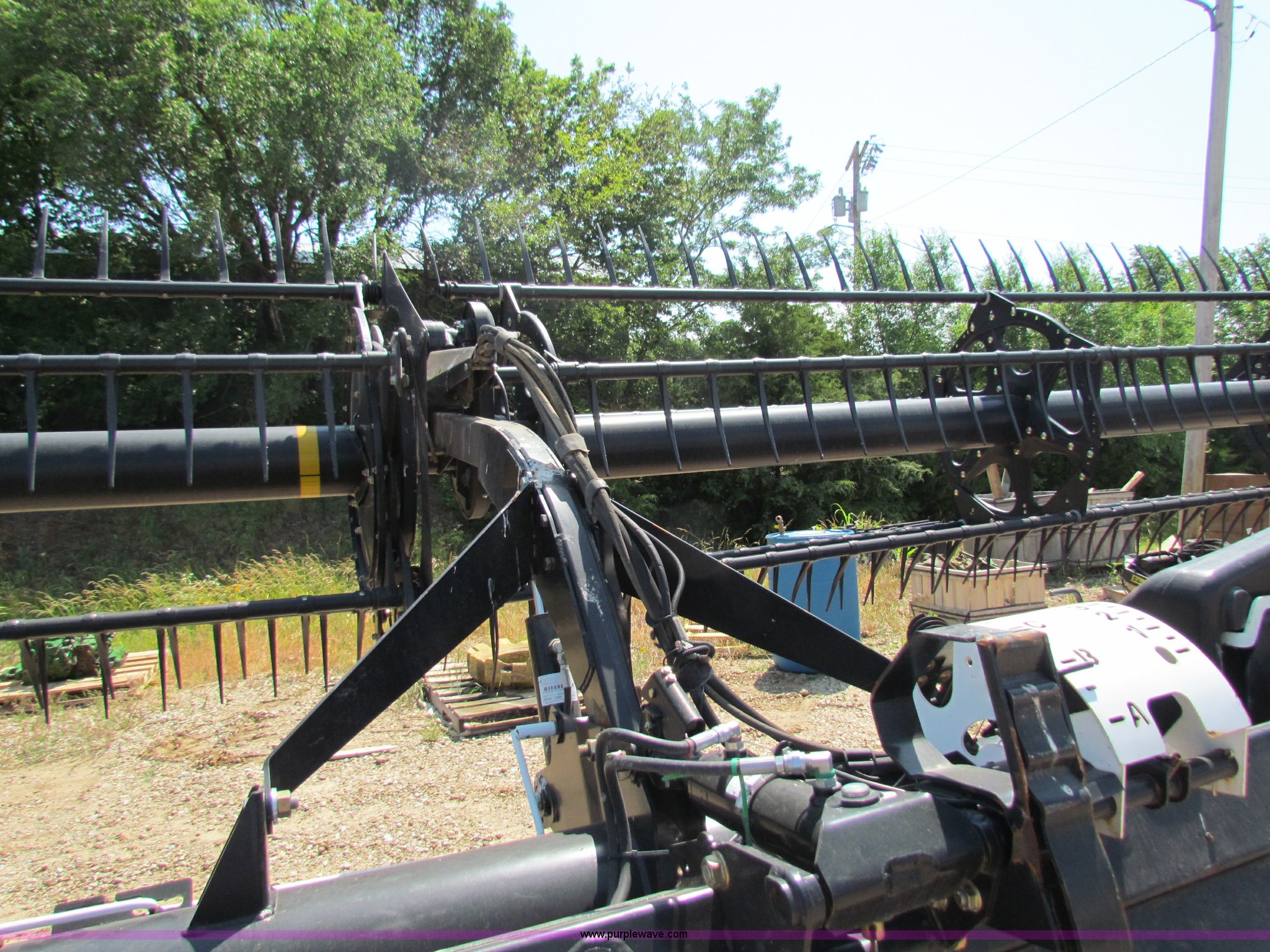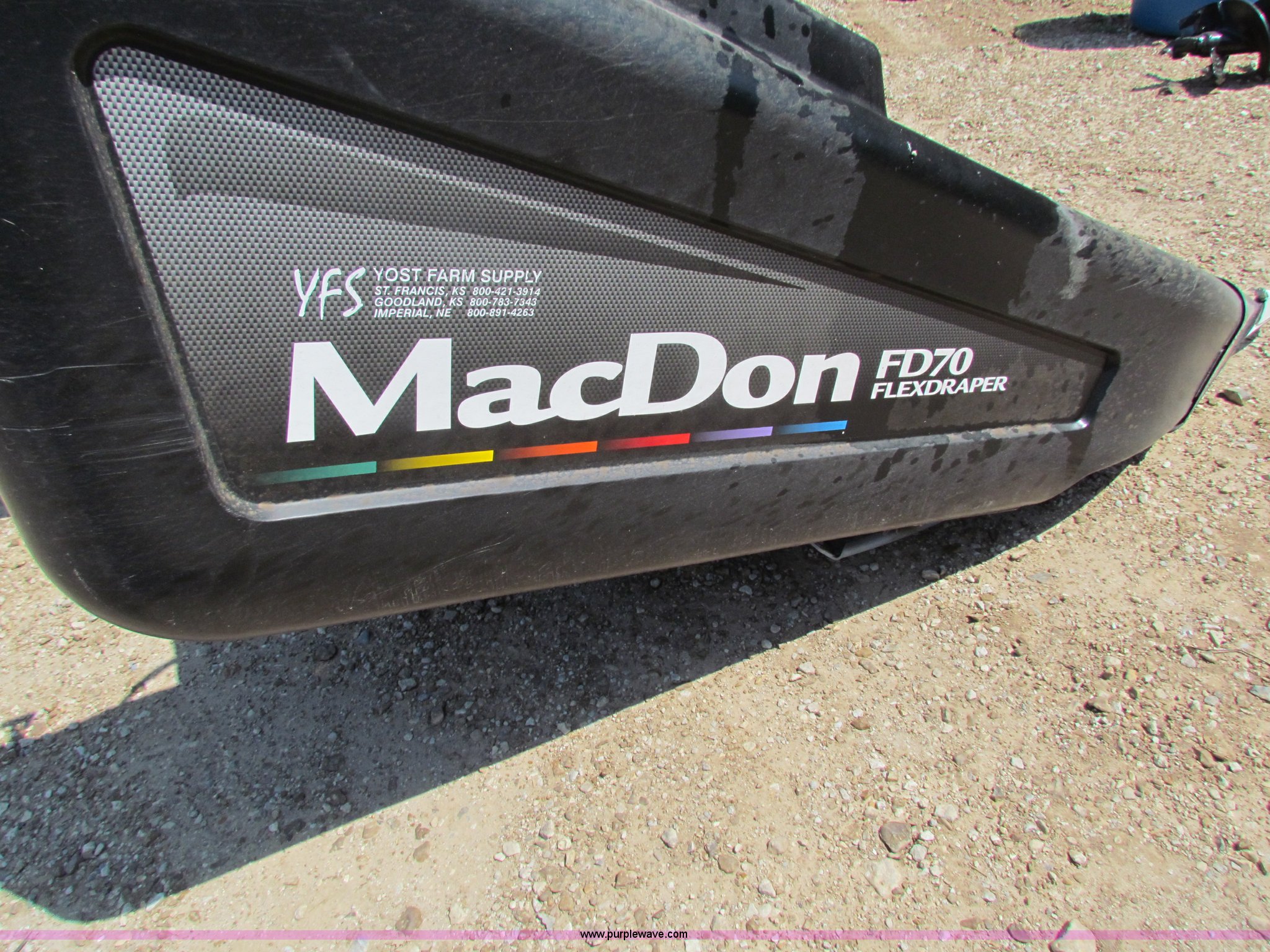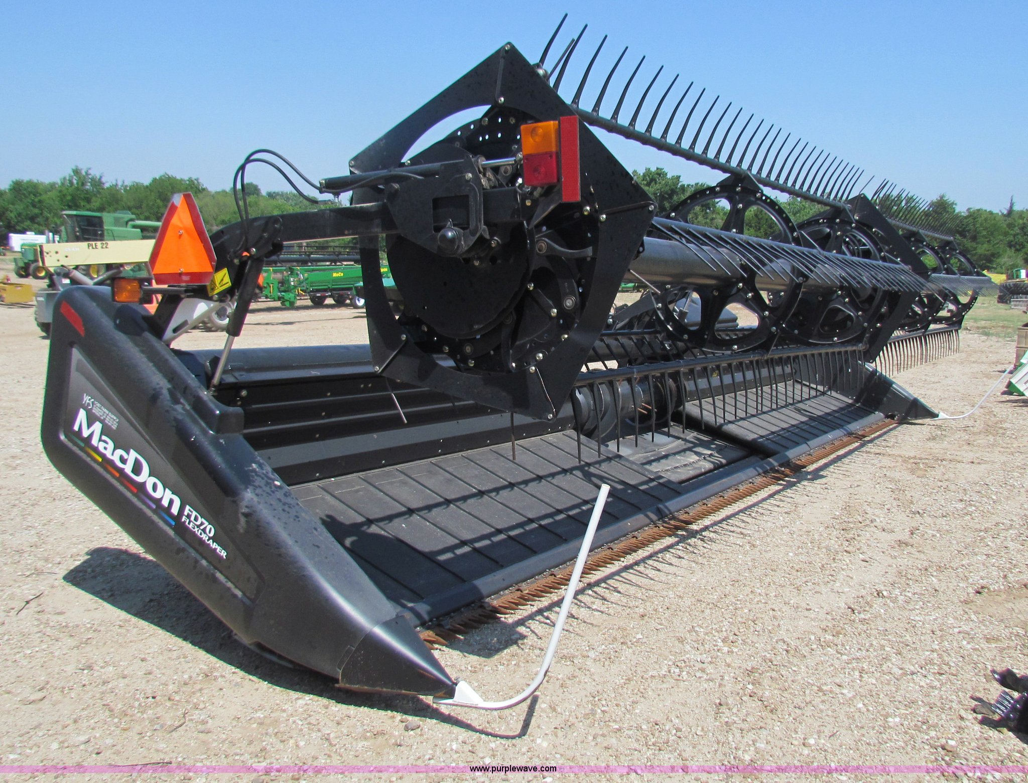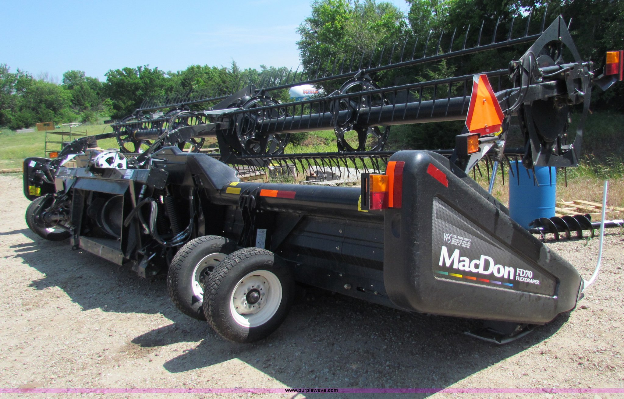 Purple Wave is selling a used Platform or Stripper Head in Kansas. This item is a 2009 Mac Don FD70 FlexDraper 30' header with the following: Contour master, Hydraulic fore/aft, Stubble lights, Automatic header height sensor, Automatic header speed control, Finger/pickup reel, Contour Master Terrain Tracer, Platform transport package, Recently replaced guards and sickle, Approx. 50 hours, Item currently on rent, will be used approx. 30 additional hours, Serial 192812