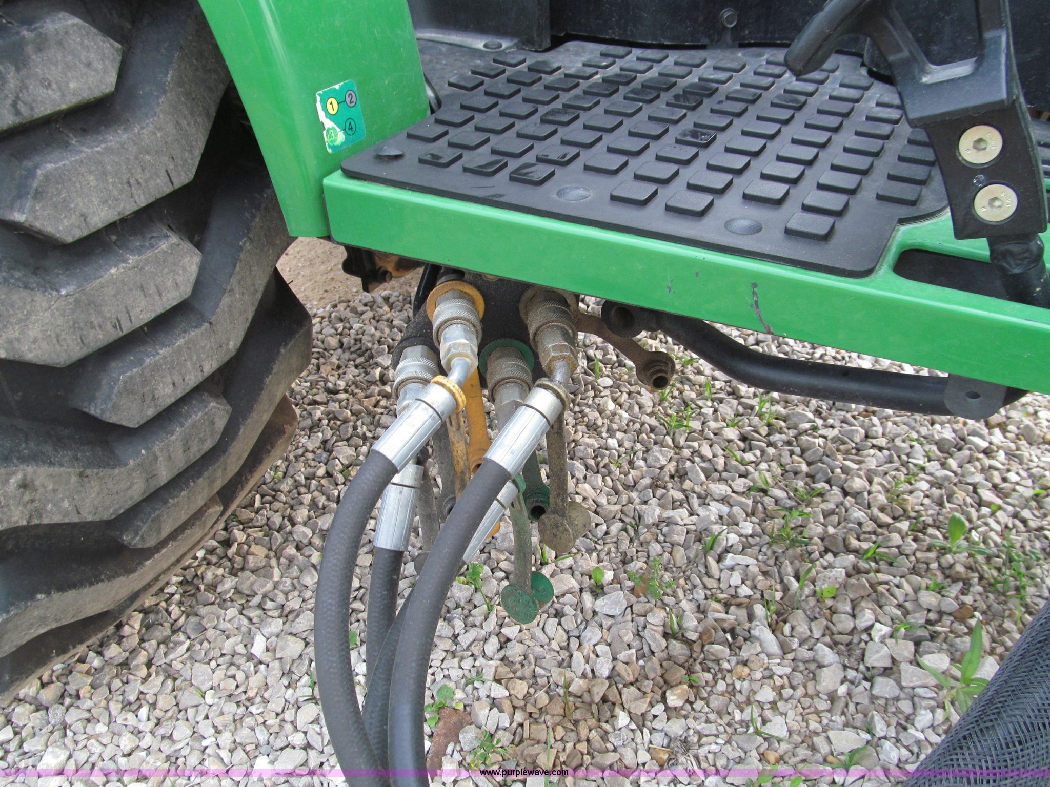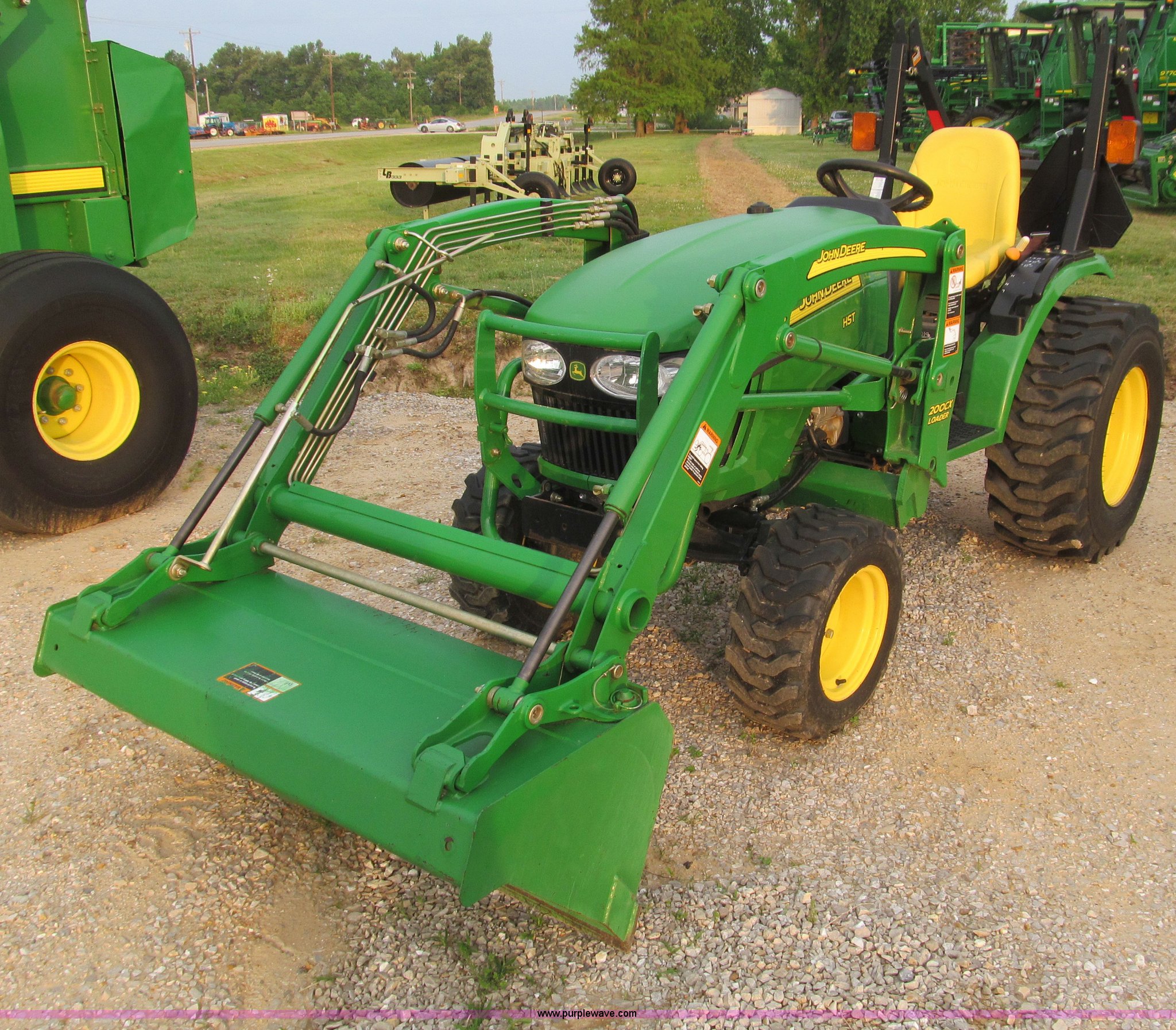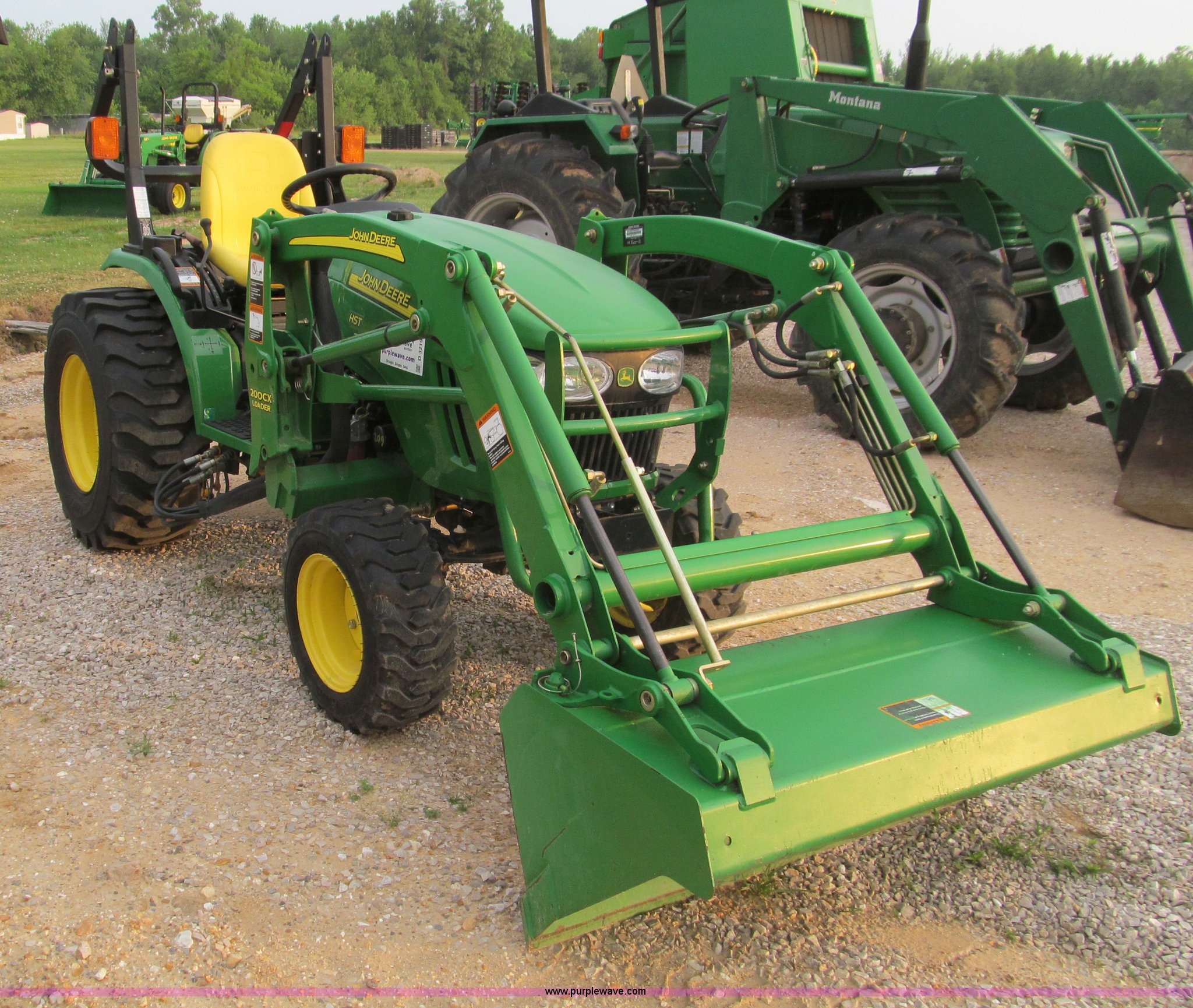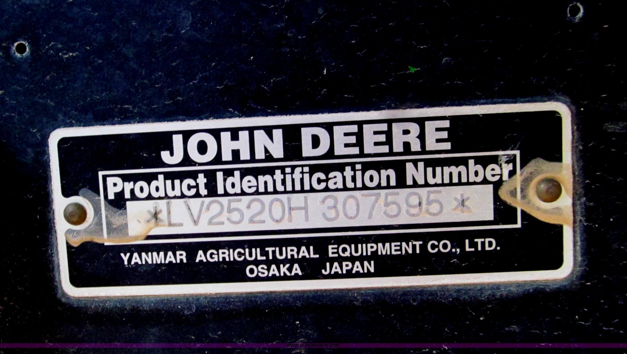 Purple Wave is selling a used Tractor in Missouri. This item is a 2007 John Deere 2520 MFWD tractor with the following: 222 hours on meter, Yanmar three cylinder diesel engine, Model 3TNV82A-MJK, Hydrostatic transmission, Front wheel assist, Spring ride seat, John Deere 200CX loader, 50" smooth edge bucket, Joystick control, Three point, 540 PTO, Mid-mount and rear PTO, (2) mid-mount SCV, 23x8.5-12SS front tires, 14-17.5 rear tires, 67" wheelbase, Recently replaced oil filter, Serial LV2520H307595