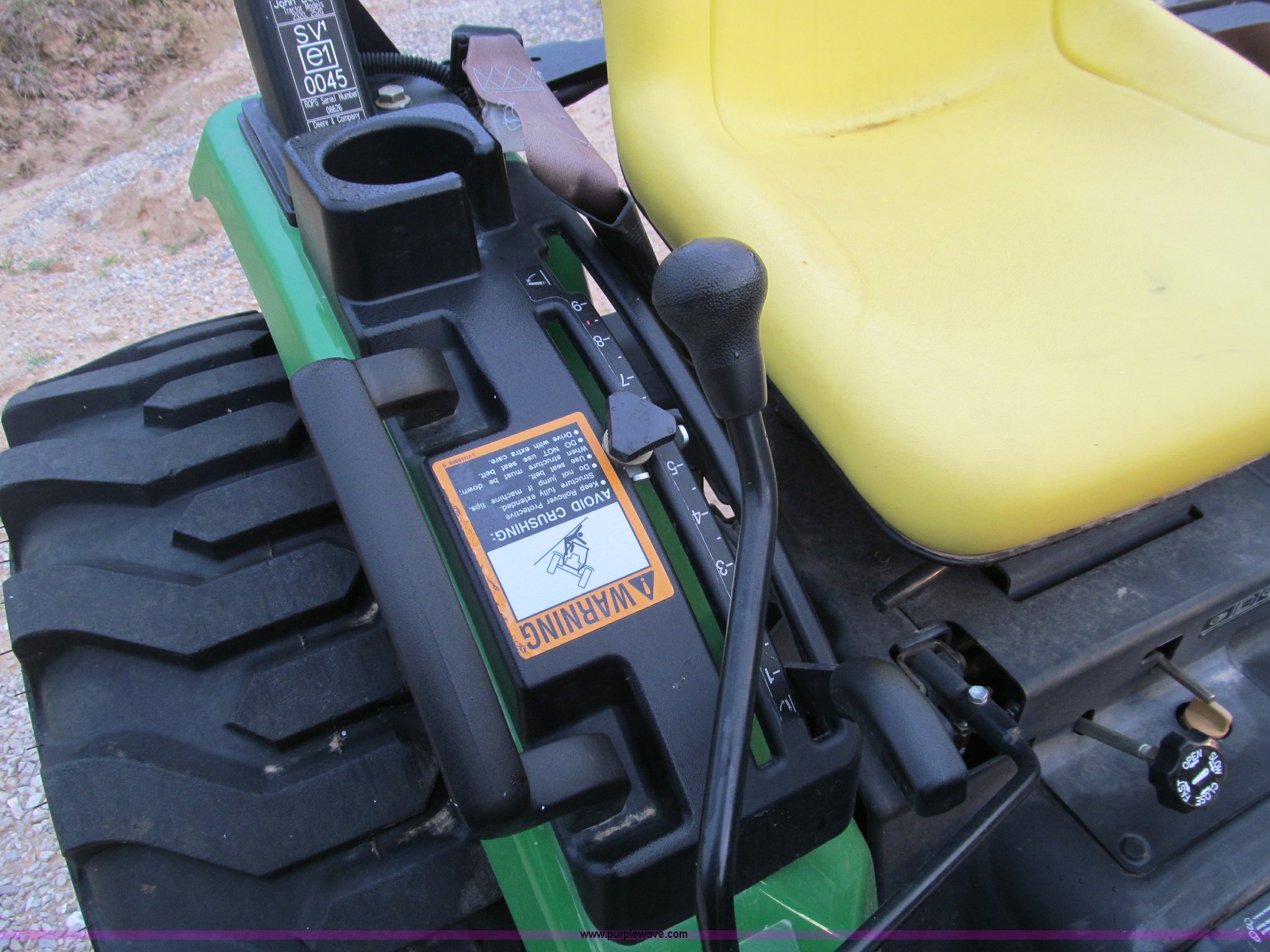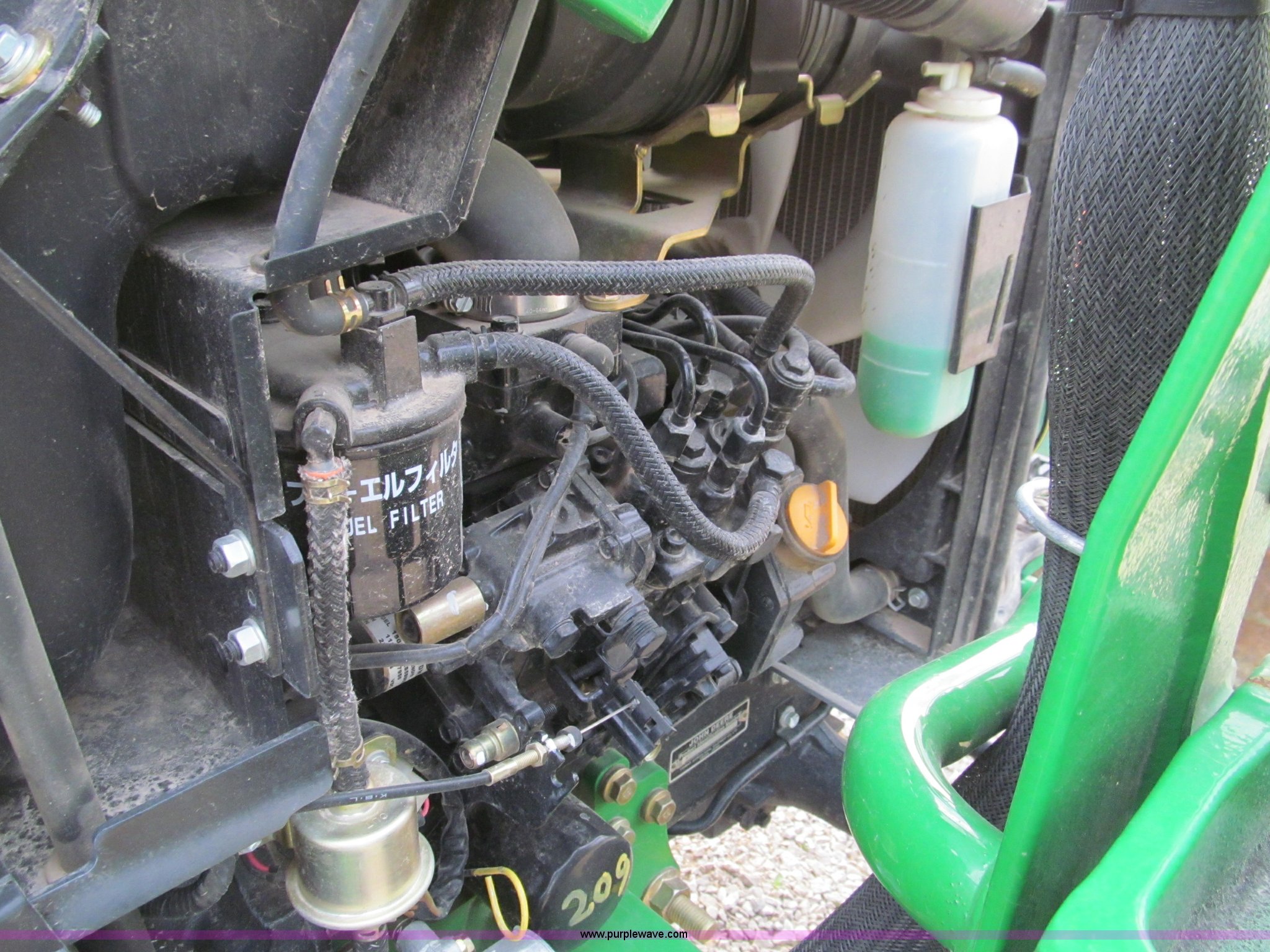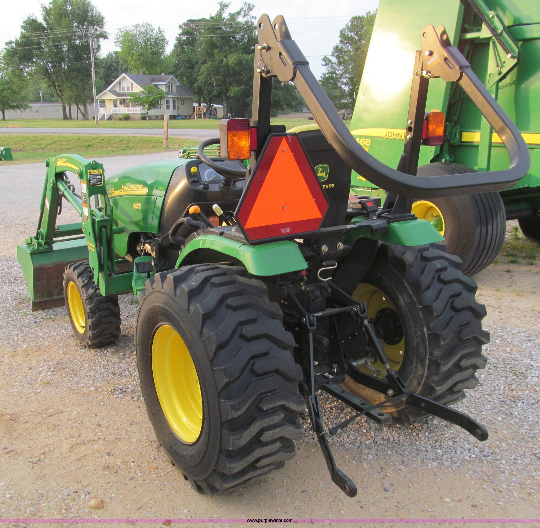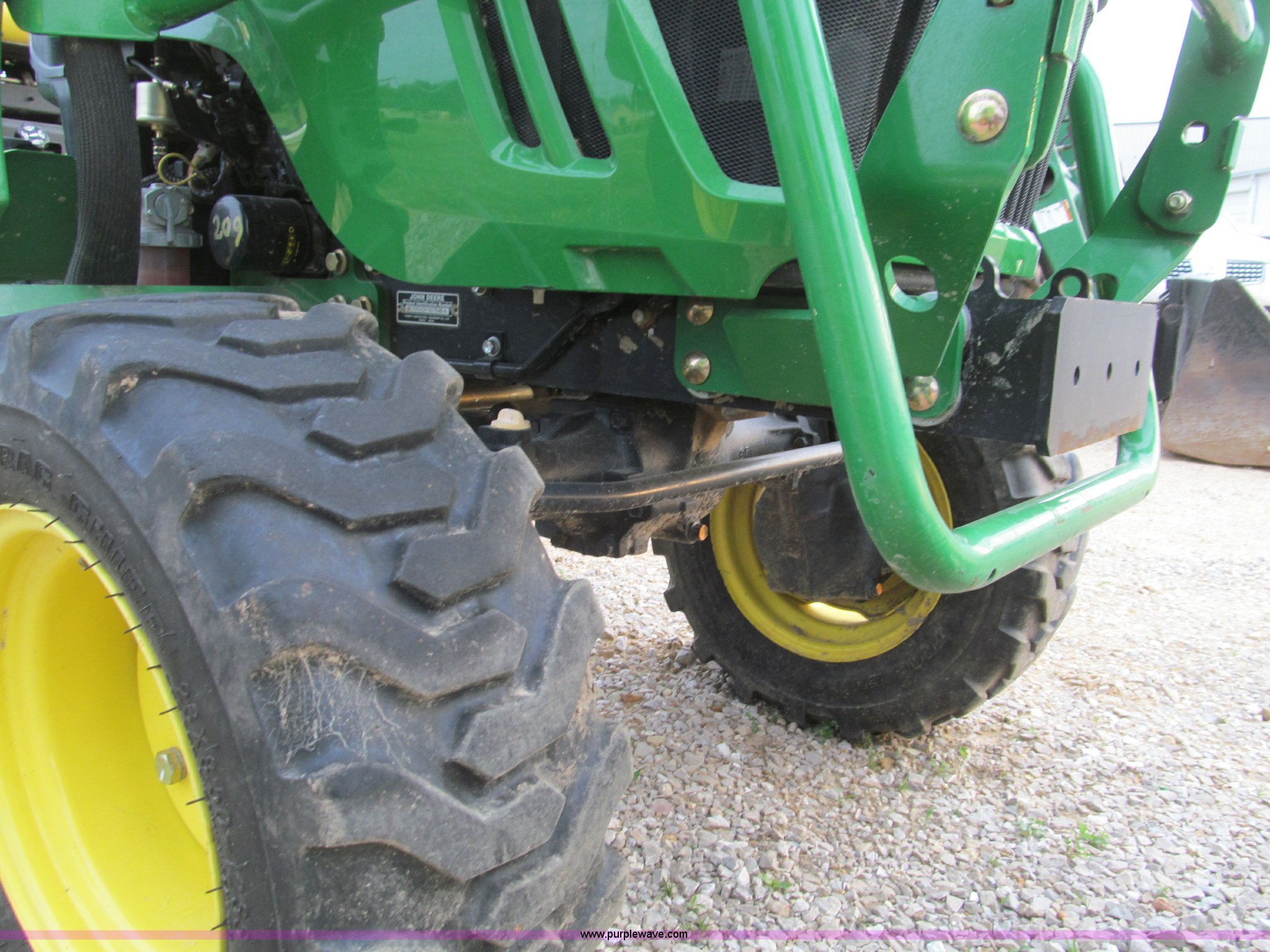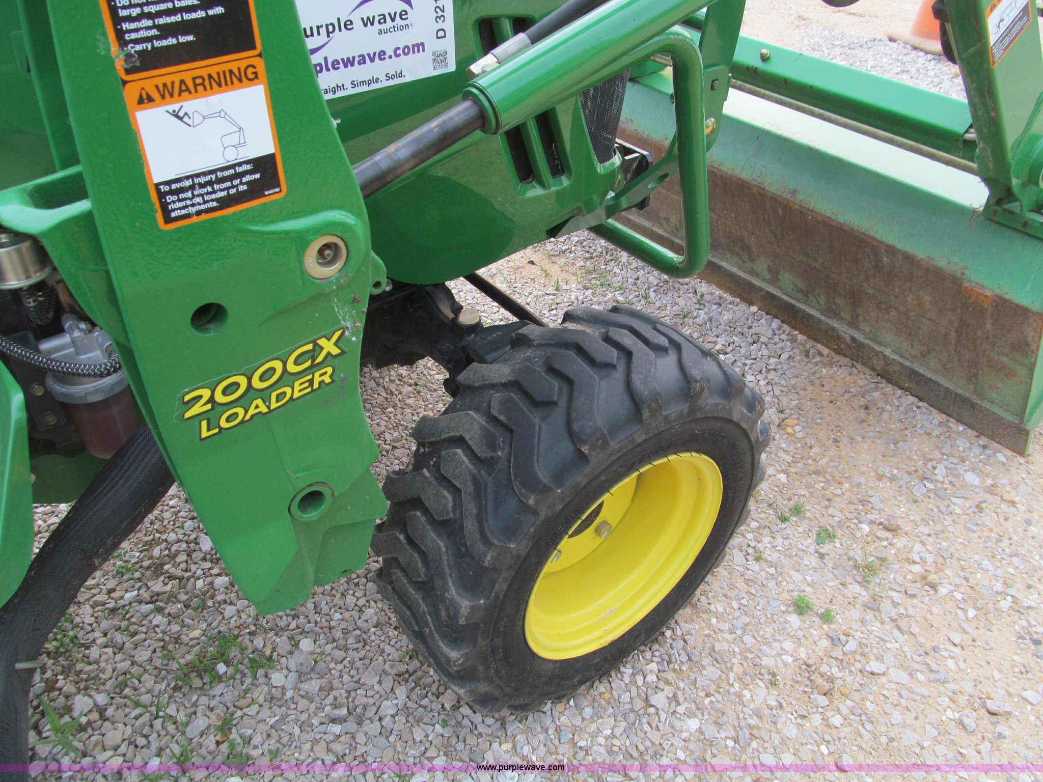 Purple Wave is selling a used Tractor in Missouri. This item is a 2007 John Deere 2520 MFWD tractor with the following: 222 hours on meter, Yanmar three cylinder diesel engine, Model 3TNV82A-MJK, Hydrostatic transmission, Front wheel assist, Spring ride seat, John Deere 200CX loader, 50" smooth edge bucket, Joystick control, Three point, 540 PTO, Mid-mount and rear PTO, (2) mid-mount SCV, 23x8.5-12SS front tires, 14-17.5 rear tires, 67" wheelbase, Recently replaced oil filter, Serial LV2520H307595
