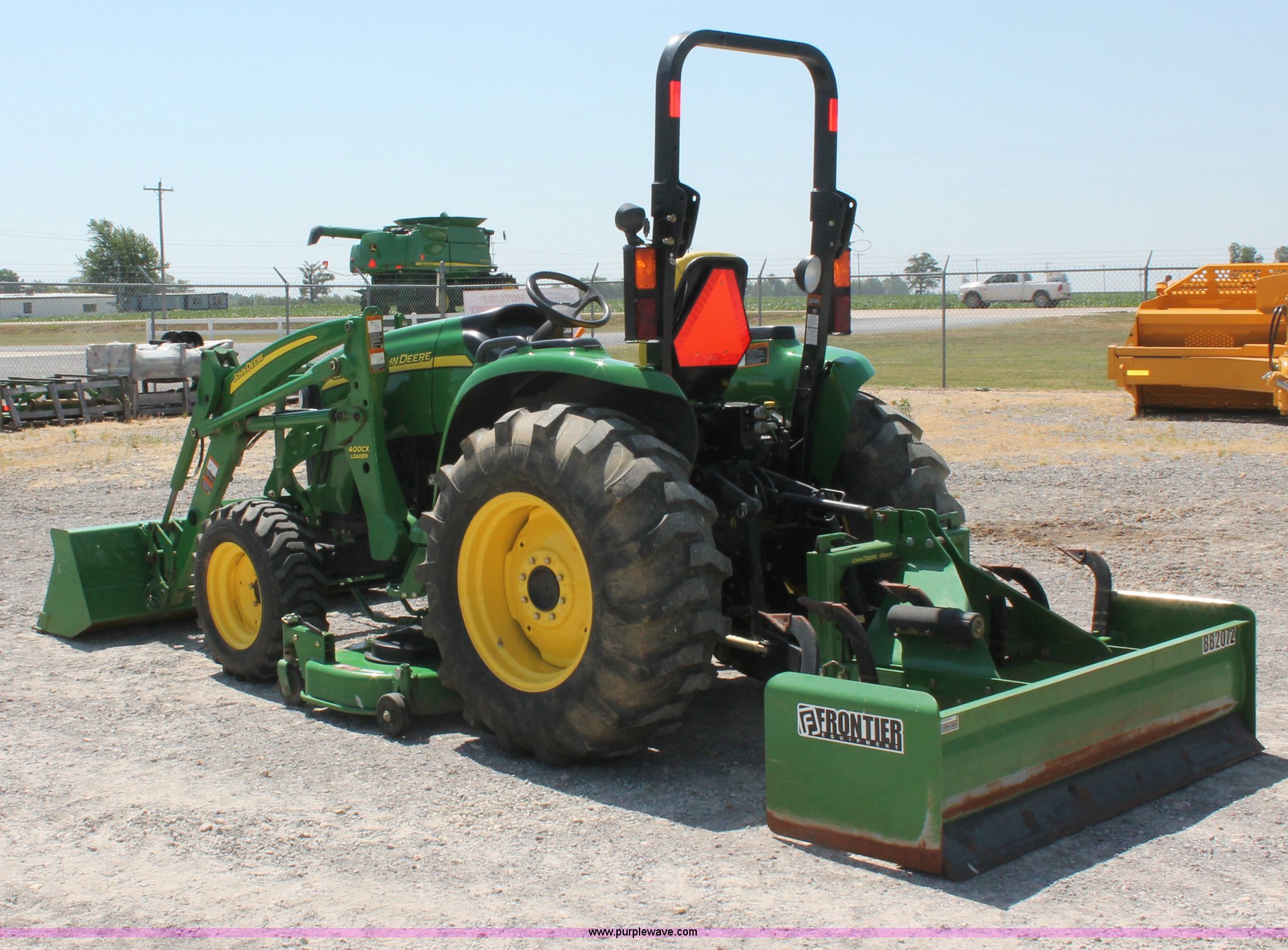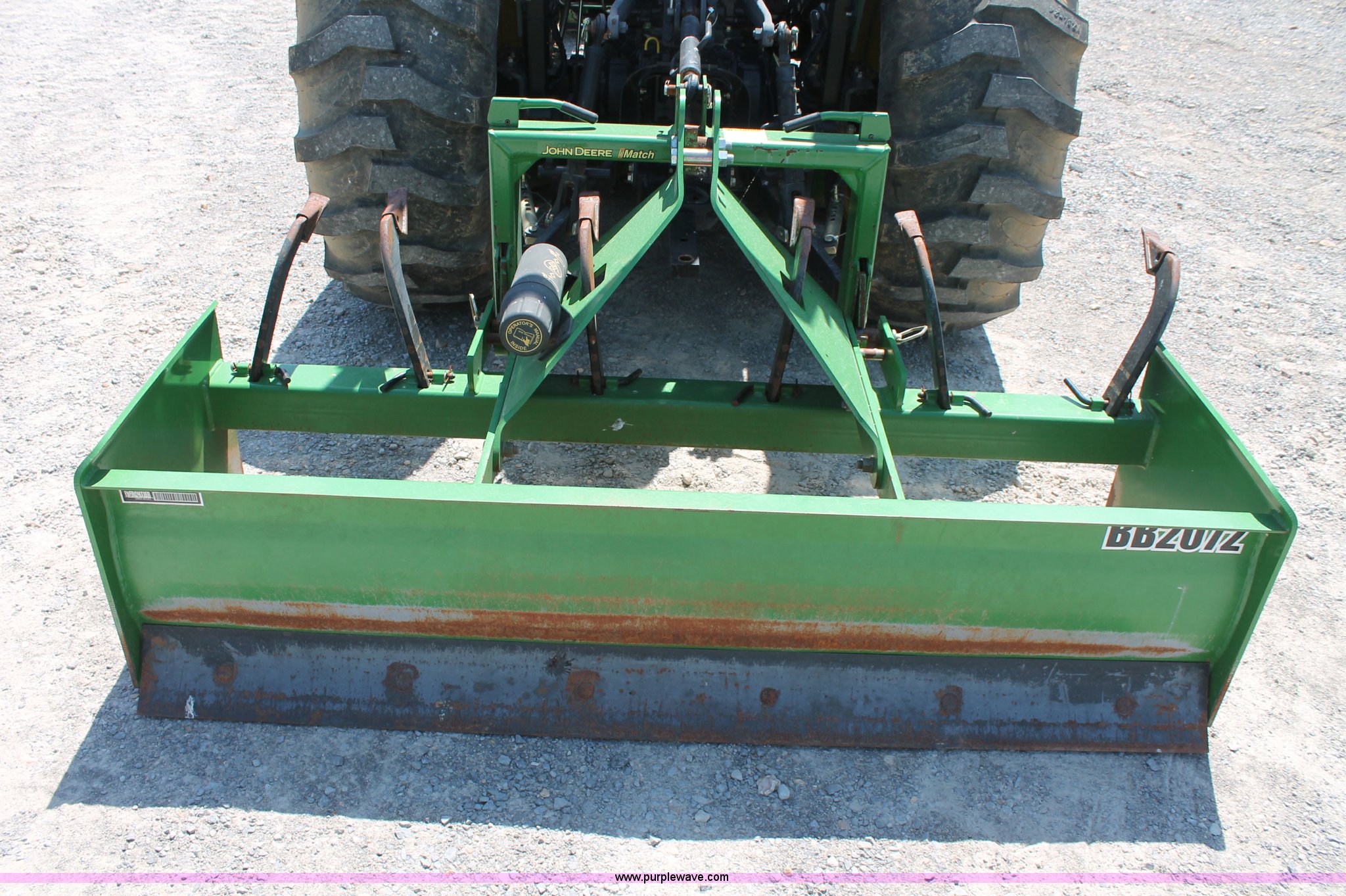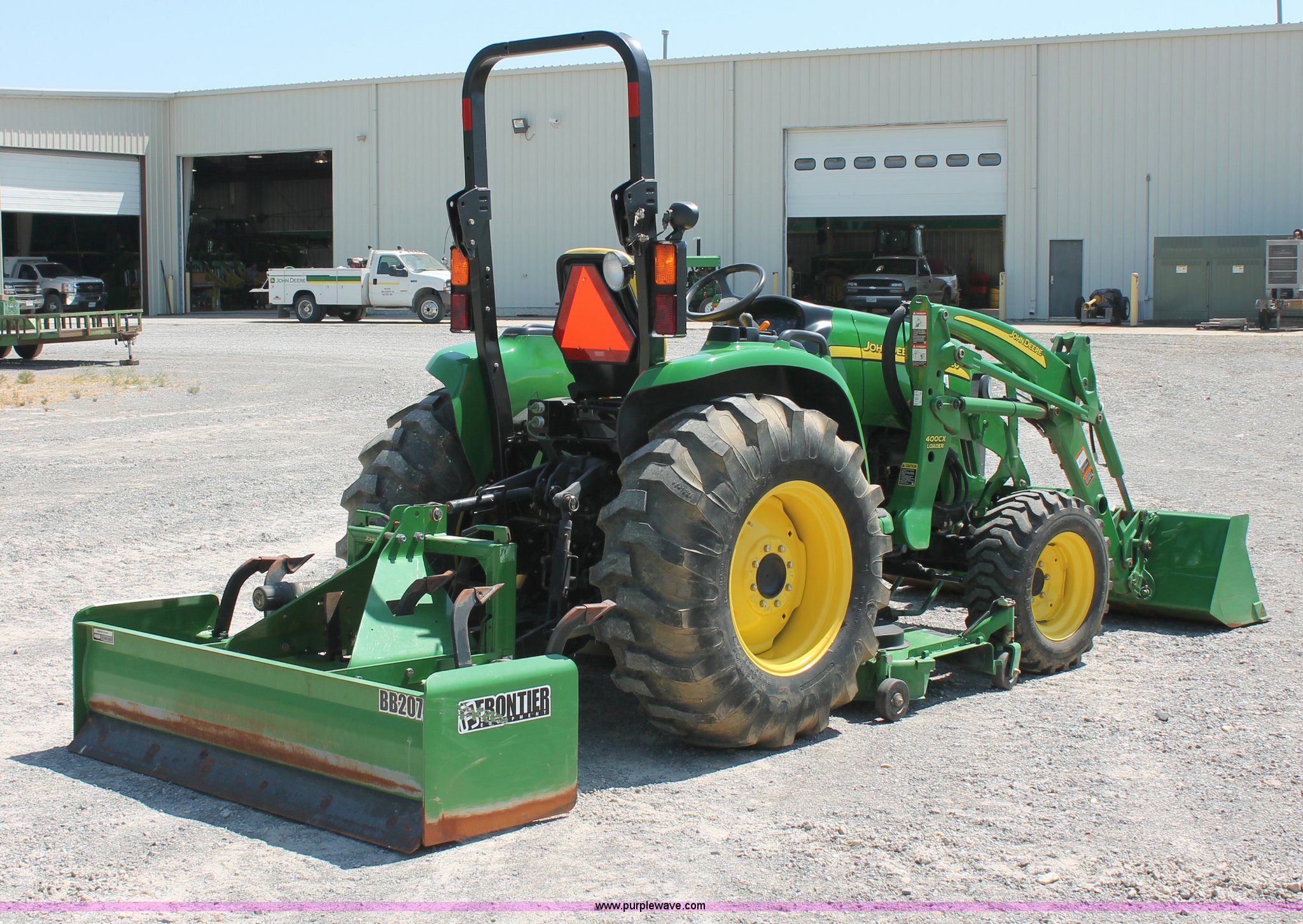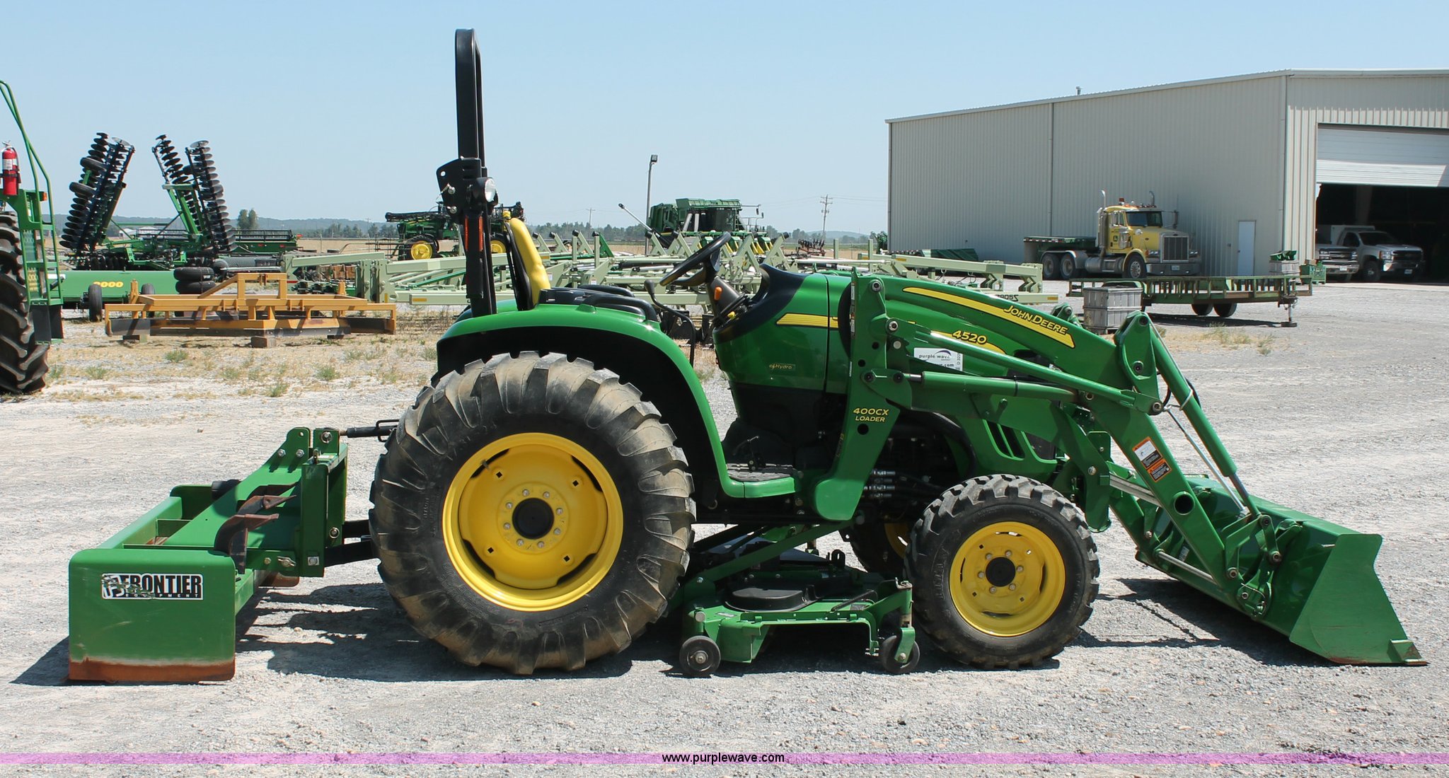 Purple Wave is selling a used Tractor in Missouri. This item is a 2009 John Deere 4520 MFWD tractor with the following: 157 hours on meter, John Deere four cylinder diesel engine, Model 4024HLV11, E-Hydrostat transmission, Three range, Front wheel assist, Differential lock, Spring ride seat, Tilt wheel, John Deere 400CX loader, 72" smooth edge bucket, Joystick control, 7-Iron commercial belly mower deck, 72" width, Serial M00072C340338, Frontier BB2072 box blade, 72" width, (6) scarifier teeth, Serial WSBB2072X500901, Three point, John Deere iMatch quick attach three point, Draw bar, 540 PTO, (2) front hydraulic remote sets, Rear hydraulic remote set, 10-16.5 front tires, 17.5L-24 rear tires, 72" wheelbase, Serial LV4520H650193