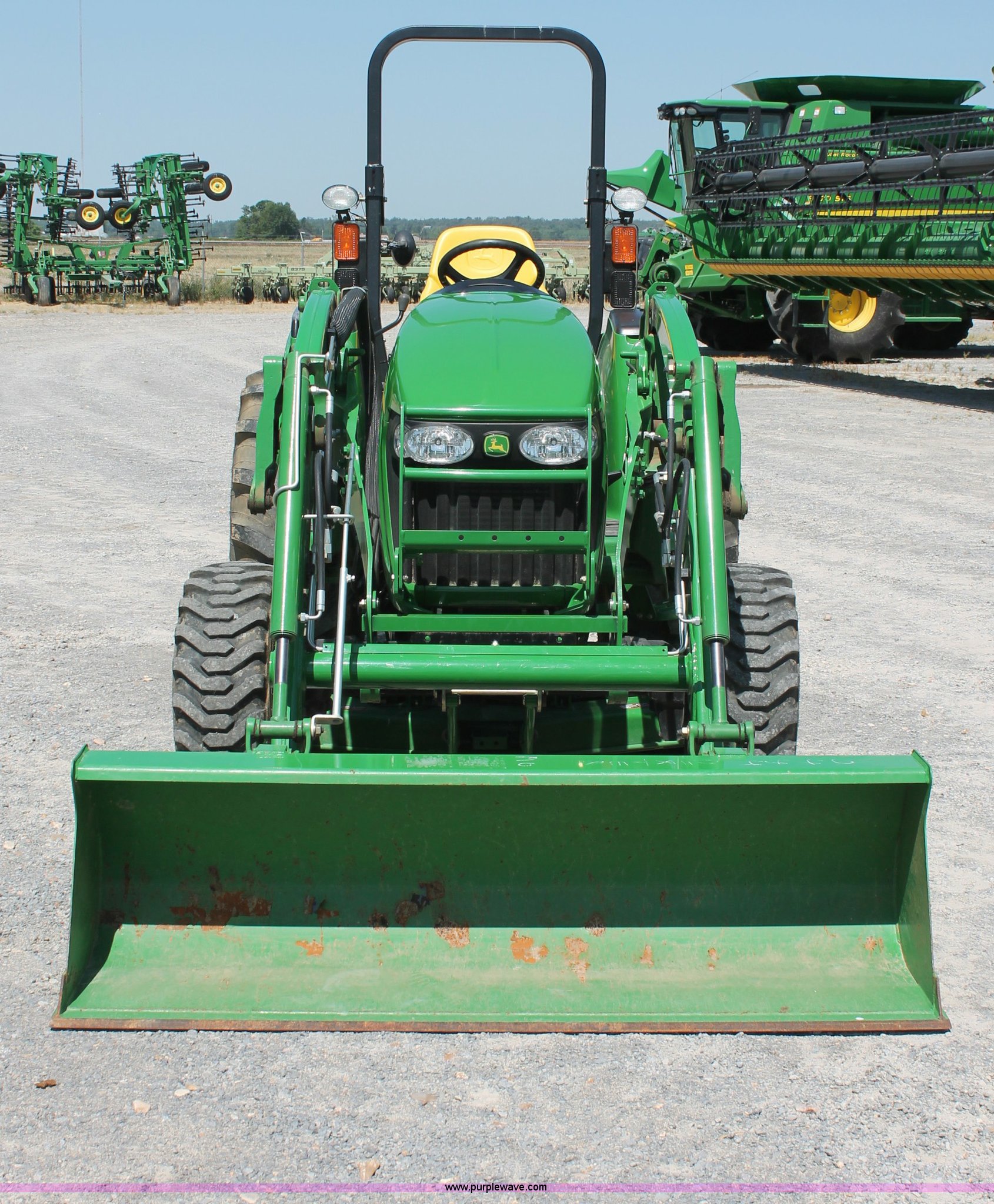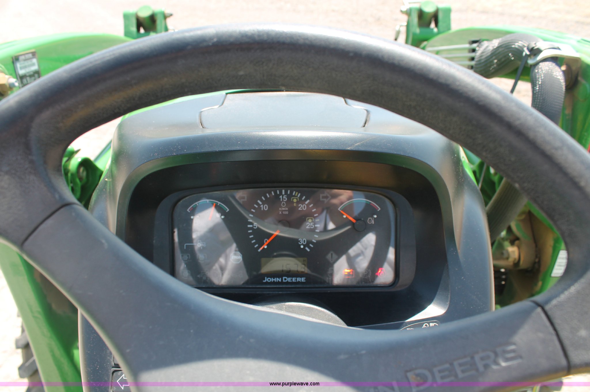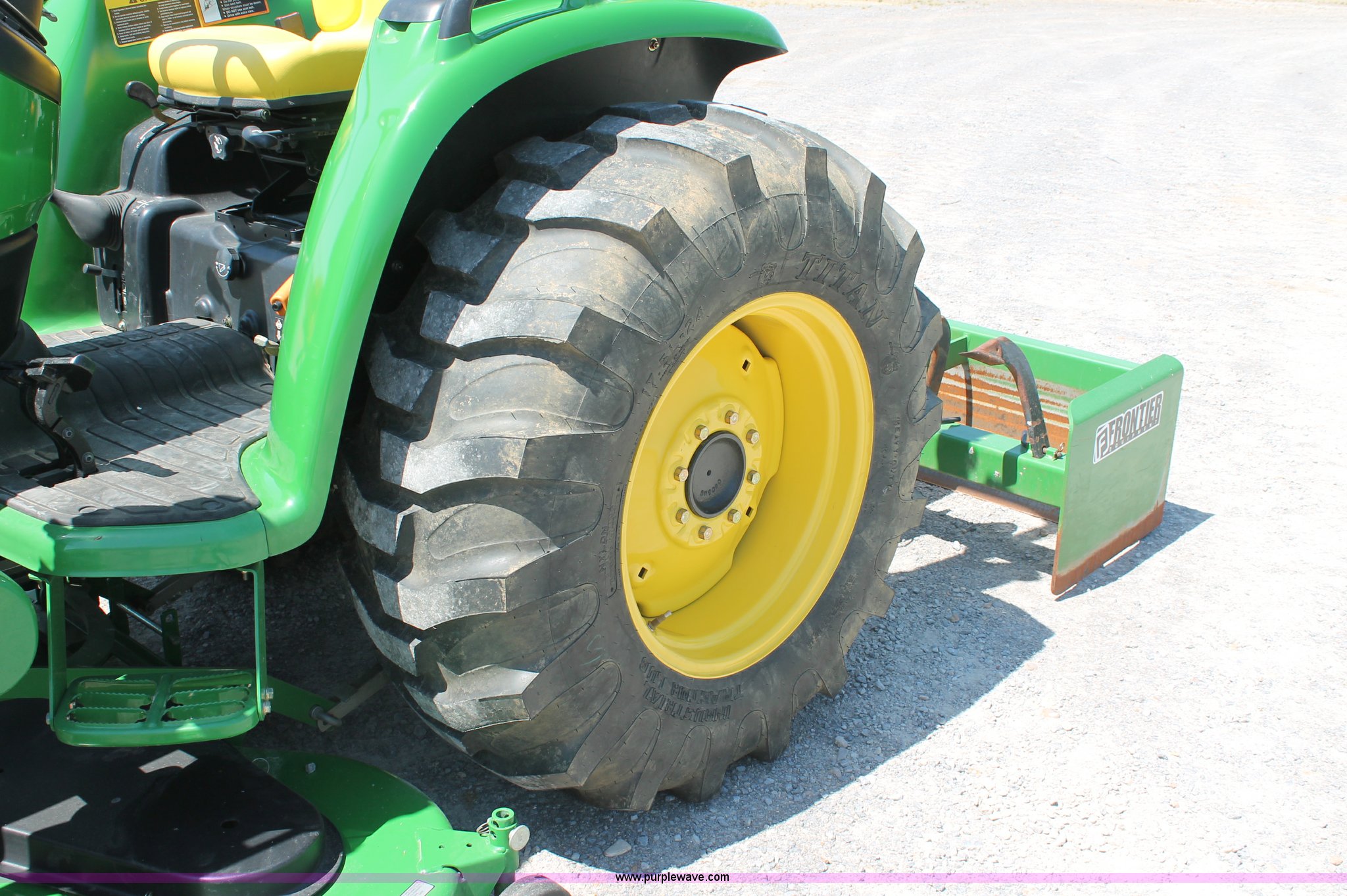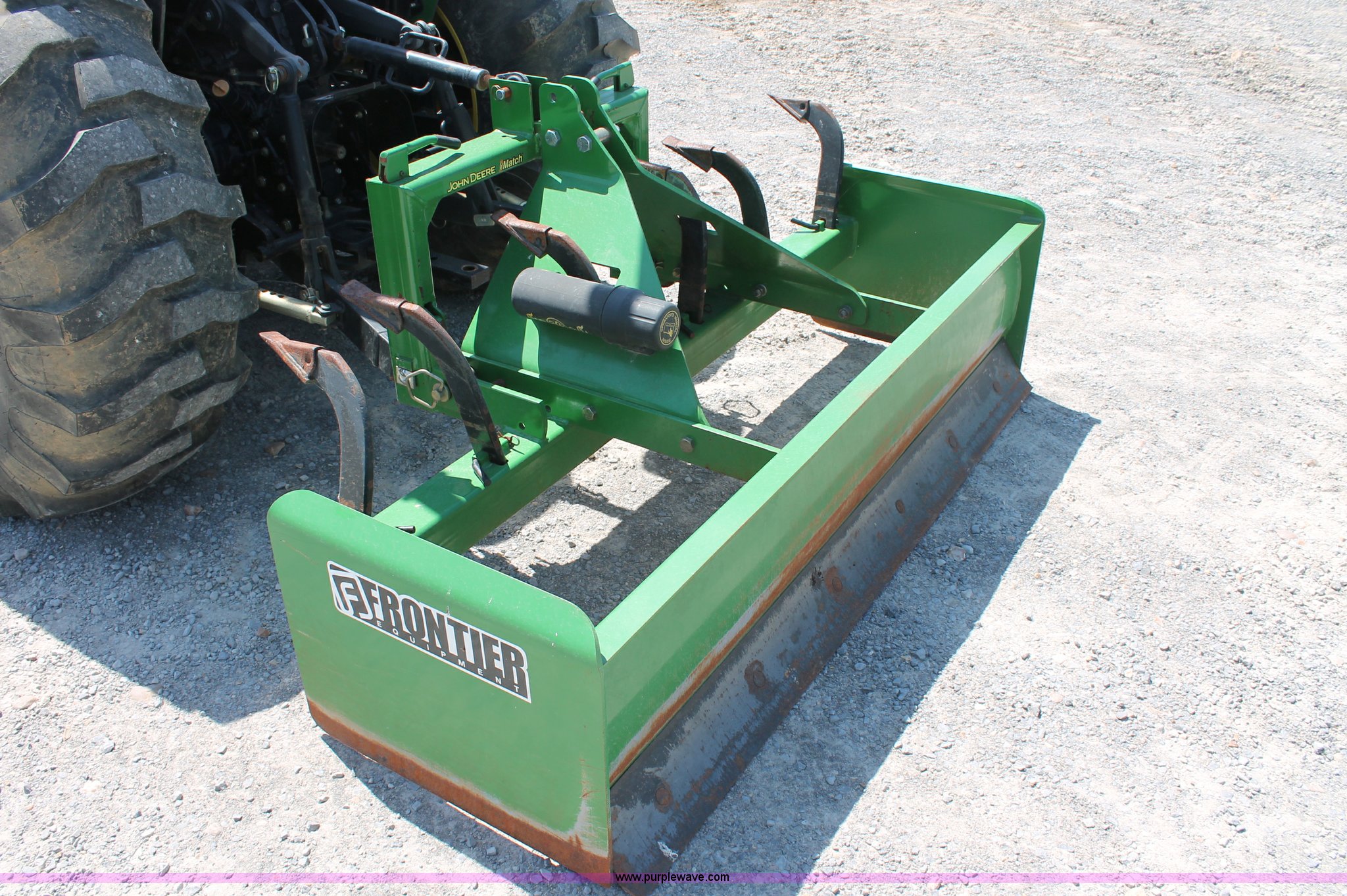 Purple Wave is selling a used Tractor in Missouri. This item is a 2009 John Deere 4520 MFWD tractor with the following: 157 hours on meter, John Deere four cylinder diesel engine, Model 4024HLV11, E-Hydrostat transmission, Three range, Front wheel assist, Differential lock, Spring ride seat, Tilt wheel, John Deere 400CX loader, 72" smooth edge bucket, Joystick control, 7-Iron commercial belly mower deck, 72" width, Serial M00072C340338, Frontier BB2072 box blade, 72" width, (6) scarifier teeth, Serial WSBB2072X500901, Three point, John Deere iMatch quick attach three point, Draw bar, 540 PTO, (2) front hydraulic remote sets, Rear hydraulic remote set, 10-16.5 front tires, 17.5L-24 rear tires, 72" wheelbase, Serial LV4520H650193
