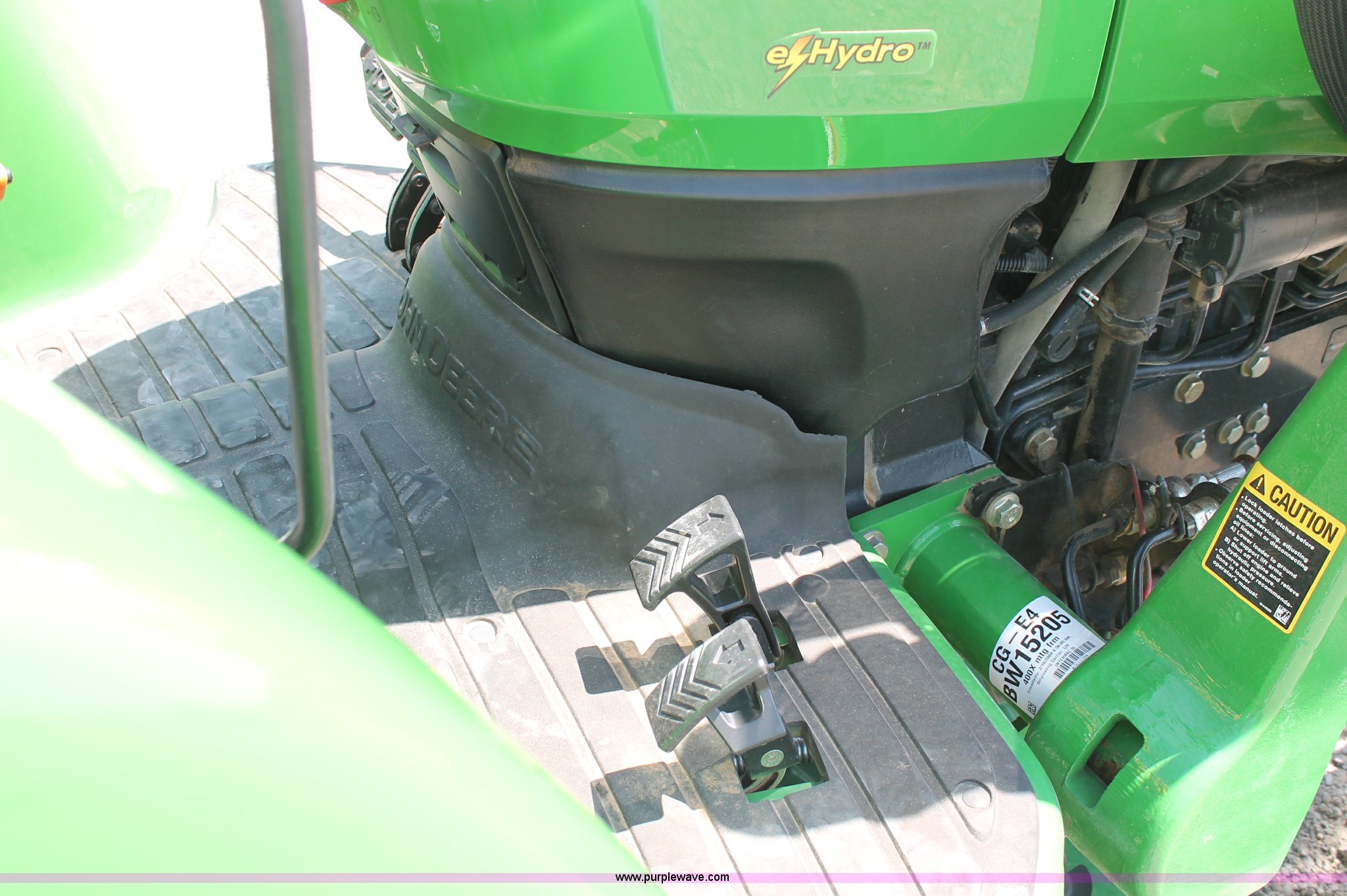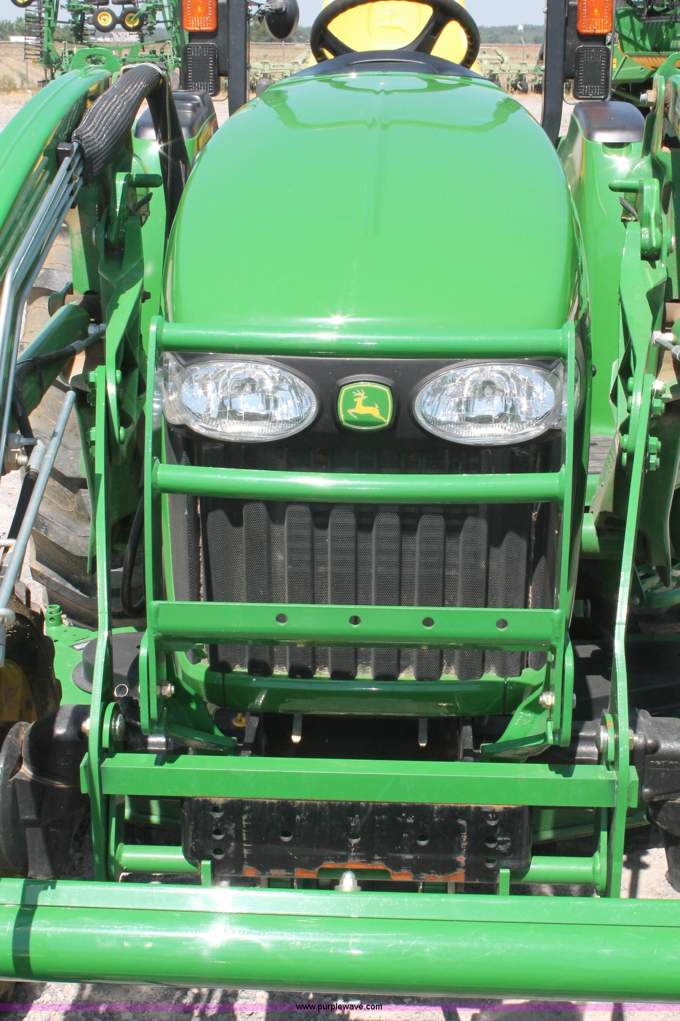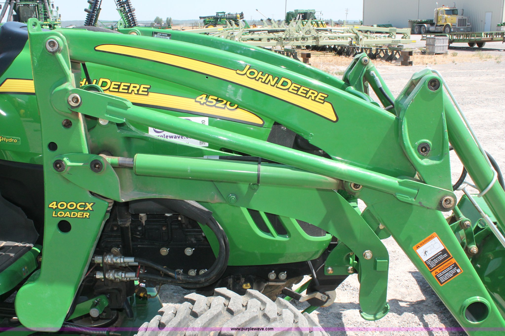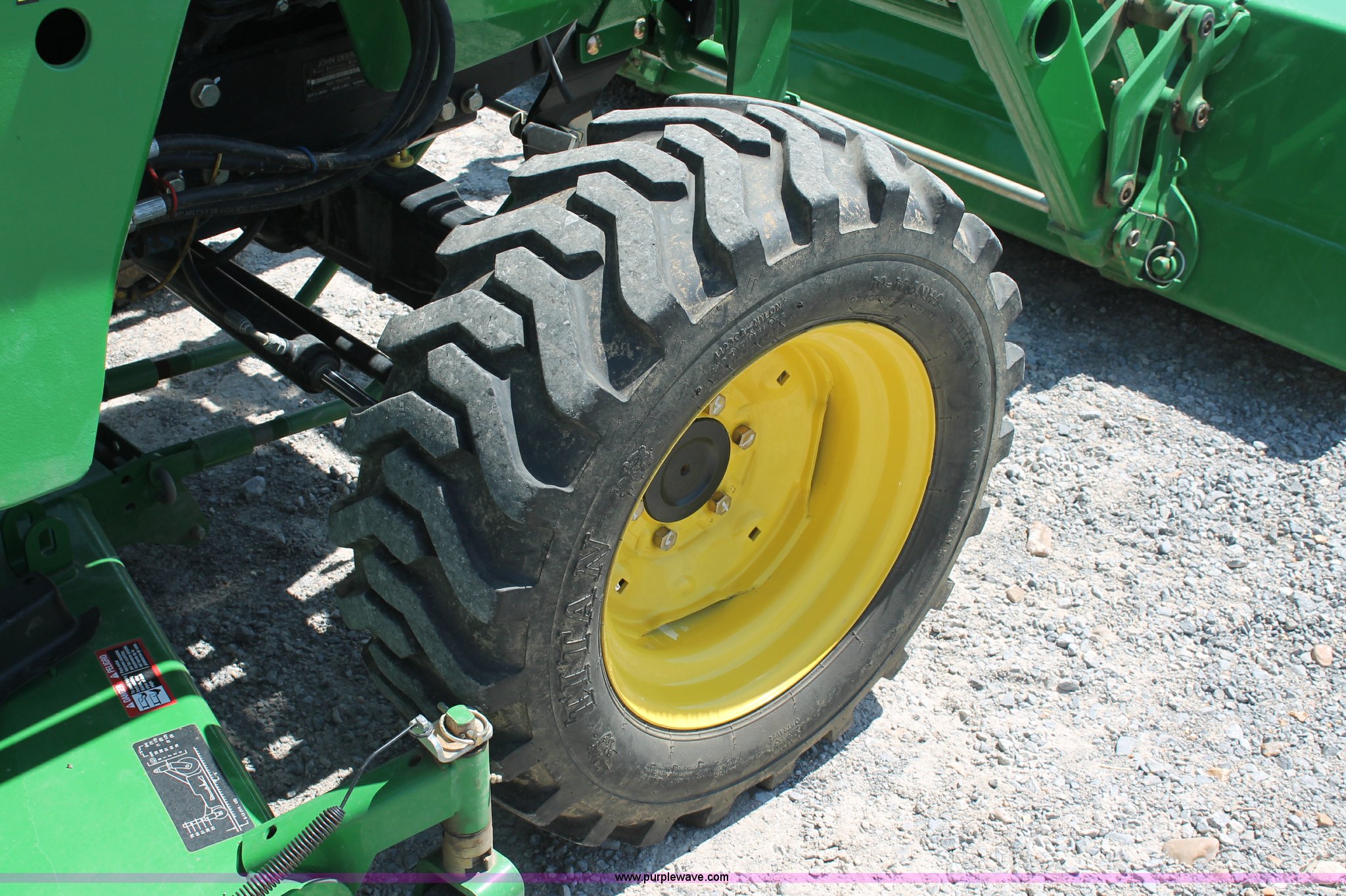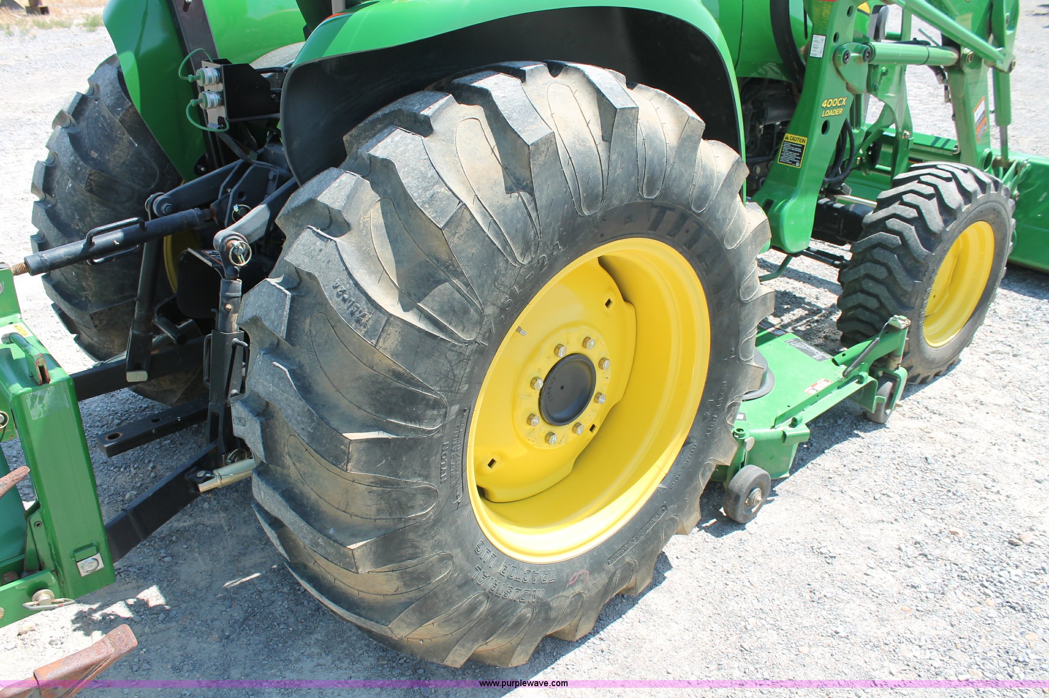 Purple Wave is selling a used Tractor in Missouri. This item is a 2009 John Deere 4520 MFWD tractor with the following: 157 hours on meter, John Deere four cylinder diesel engine, Model 4024HLV11, E-Hydrostat transmission, Three range, Front wheel assist, Differential lock, Spring ride seat, Tilt wheel, John Deere 400CX loader, 72" smooth edge bucket, Joystick control, 7-Iron commercial belly mower deck, 72" width, Serial M00072C340338, Frontier BB2072 box blade, 72" width, (6) scarifier teeth, Serial WSBB2072X500901, Three point, John Deere iMatch quick attach three point, Draw bar, 540 PTO, (2) front hydraulic remote sets, Rear hydraulic remote set, 10-16.5 front tires, 17.5L-24 rear tires, 72" wheelbase, Serial LV4520H650193