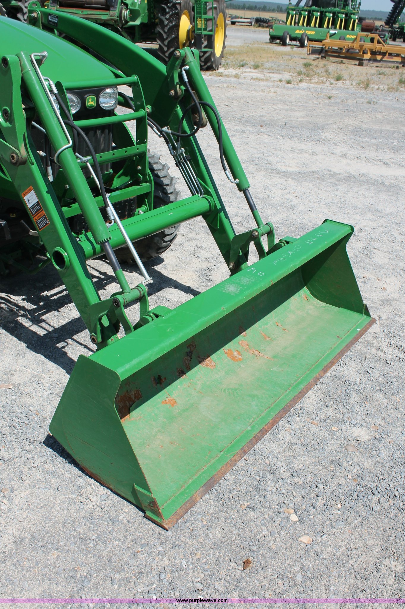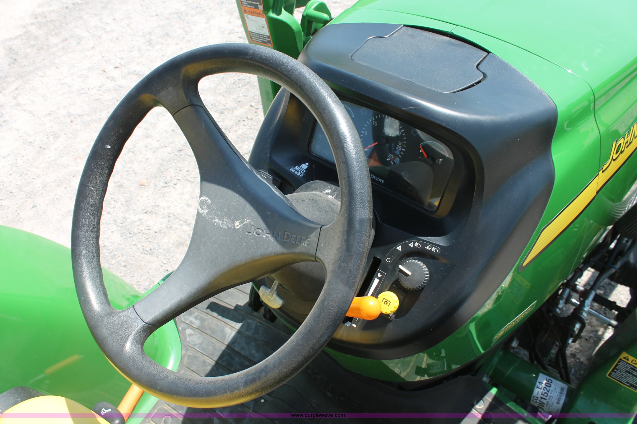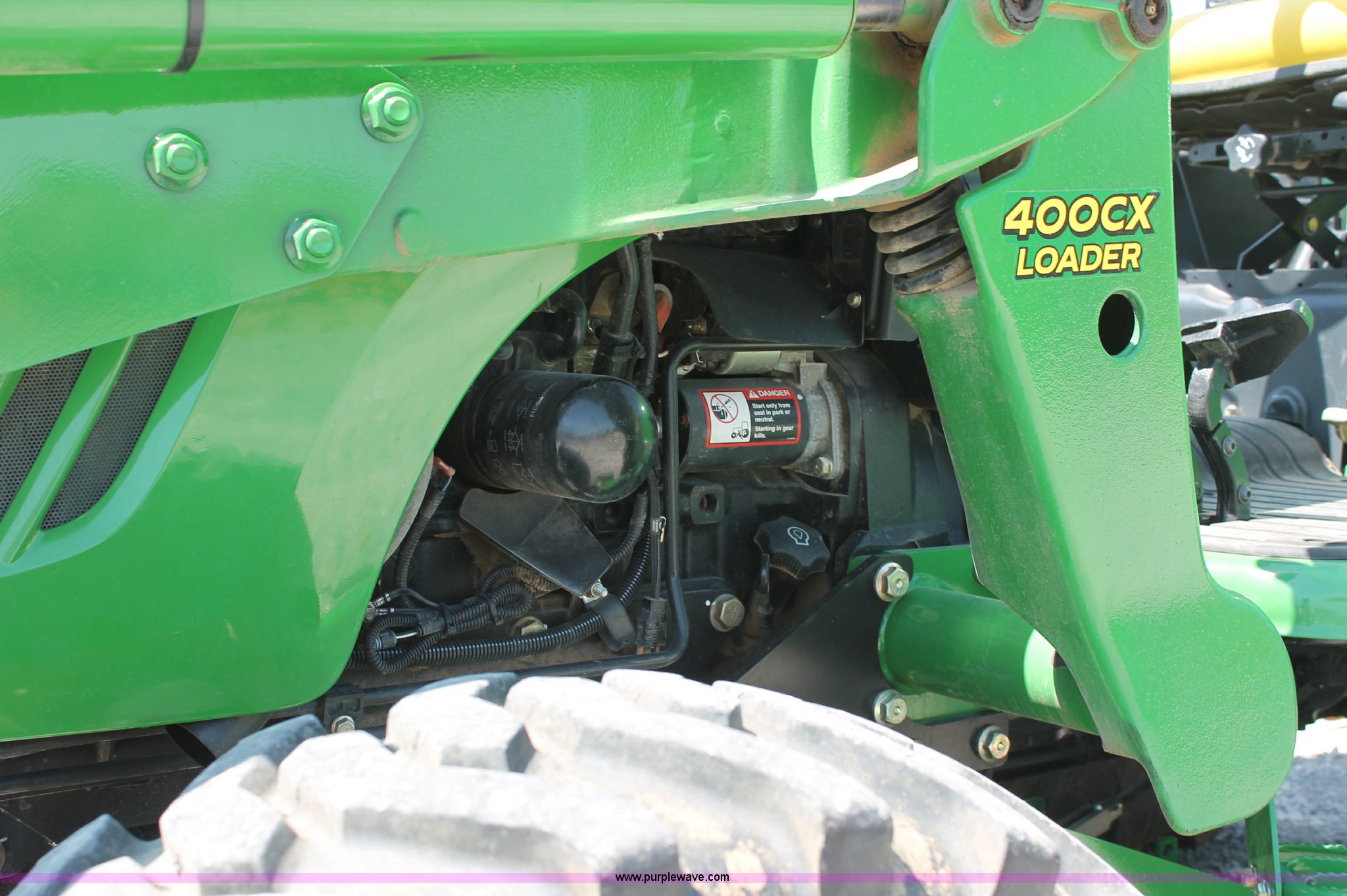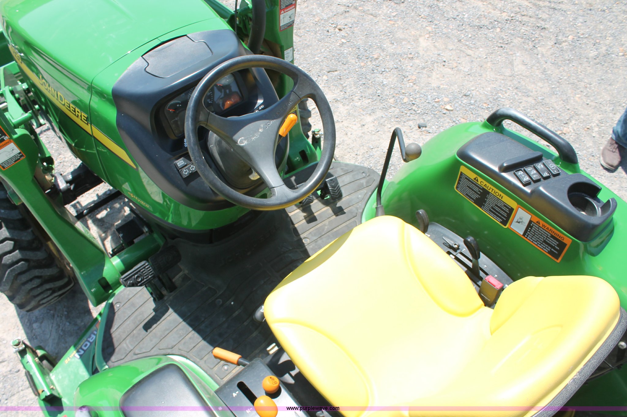 Purple Wave is selling a used Tractor in Missouri. This item is a 2009 John Deere 4520 MFWD tractor with the following: 157 hours on meter, John Deere four cylinder diesel engine, Model 4024HLV11, E-Hydrostat transmission, Three range, Front wheel assist, Differential lock, Spring ride seat, Tilt wheel, John Deere 400CX loader, 72" smooth edge bucket, Joystick control, 7-Iron commercial belly mower deck, 72" width, Serial M00072C340338, Frontier BB2072 box blade, 72" width, (6) scarifier teeth, Serial WSBB2072X500901, Three point, John Deere iMatch quick attach three point, Draw bar, 540 PTO, (2) front hydraulic remote sets, Rear hydraulic remote set, 10-16.5 front tires, 17.5L-24 rear tires, 72" wheelbase, Serial LV4520H650193
