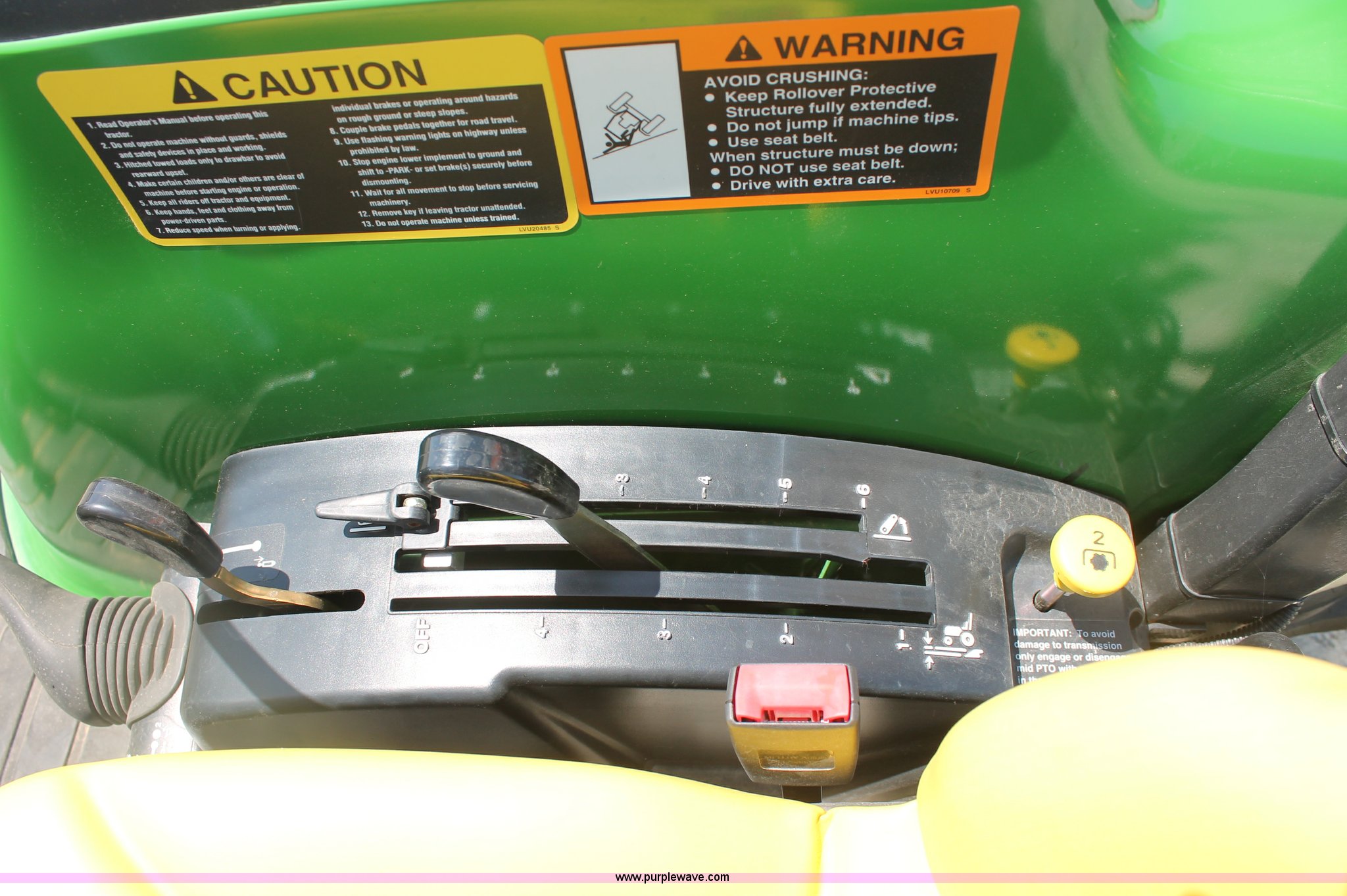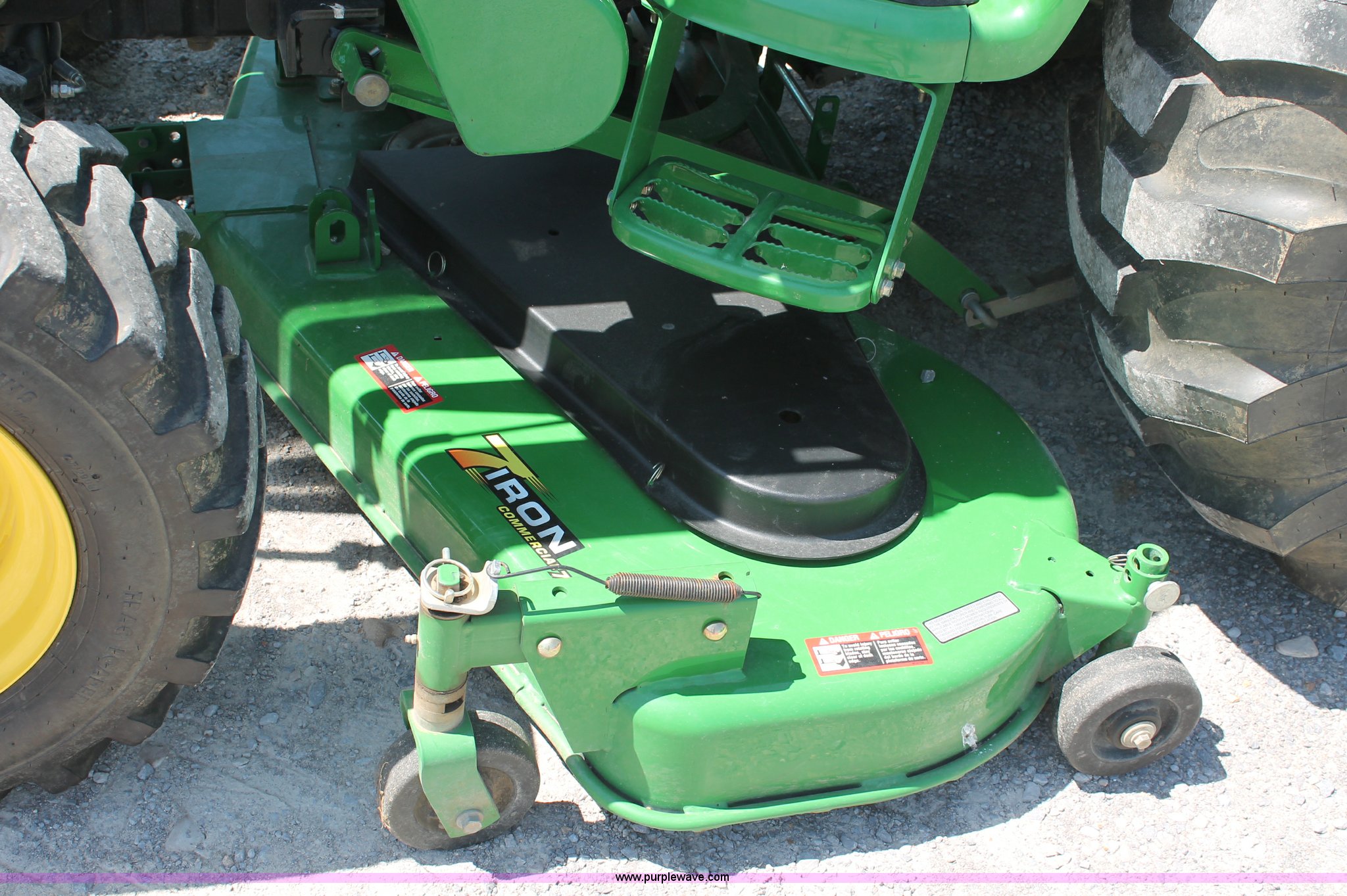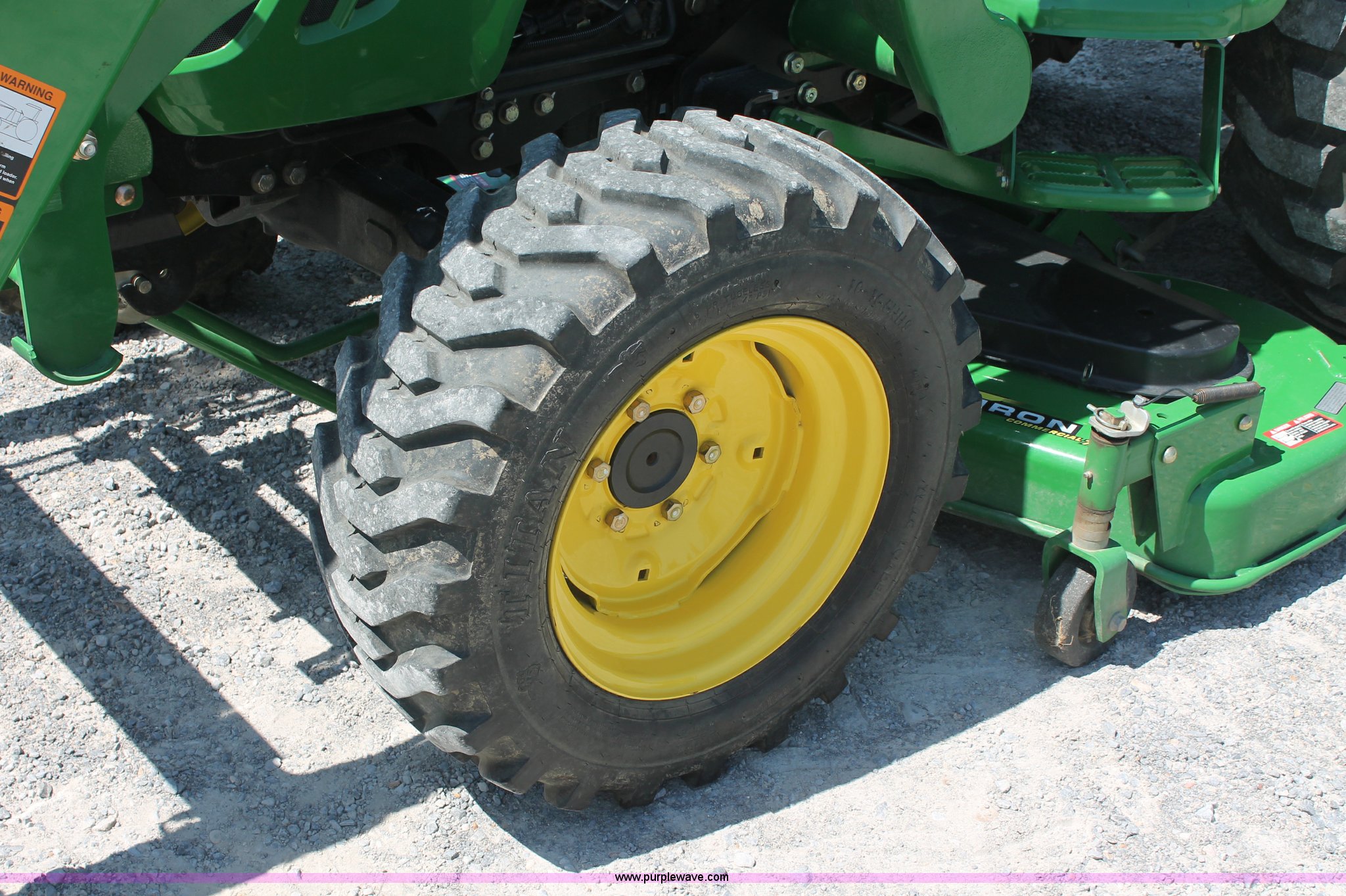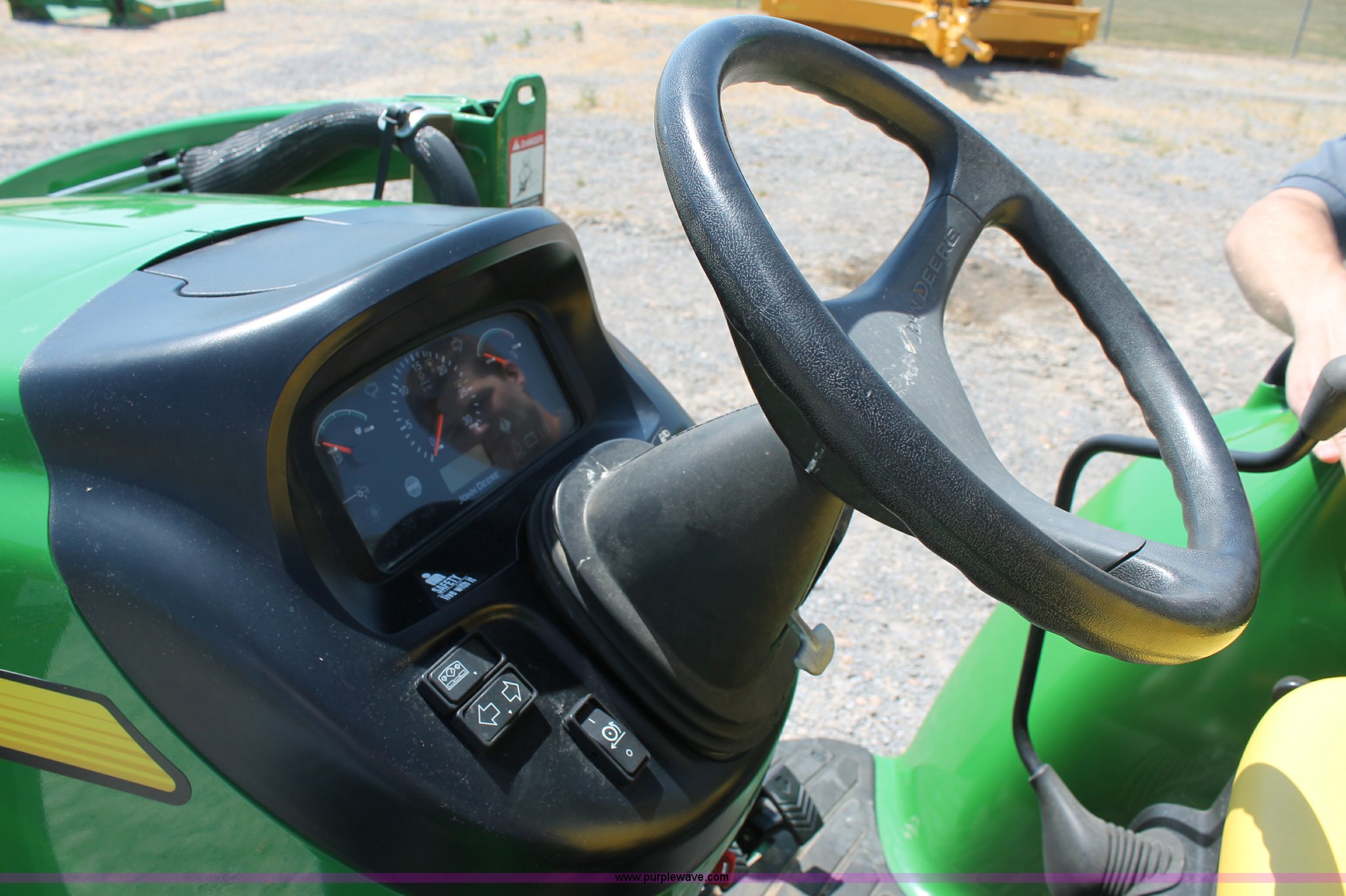 Purple Wave is selling a used Tractor in Missouri. This item is a 2009 John Deere 4520 MFWD tractor with the following: 157 hours on meter, John Deere four cylinder diesel engine, Model 4024HLV11, E-Hydrostat transmission, Three range, Front wheel assist, Differential lock, Spring ride seat, Tilt wheel, John Deere 400CX loader, 72" smooth edge bucket, Joystick control, 7-Iron commercial belly mower deck, 72" width, Serial M00072C340338, Frontier BB2072 box blade, 72" width, (6) scarifier teeth, Serial WSBB2072X500901, Three point, John Deere iMatch quick attach three point, Draw bar, 540 PTO, (2) front hydraulic remote sets, Rear hydraulic remote set, 10-16.5 front tires, 17.5L-24 rear tires, 72" wheelbase, Serial LV4520H650193