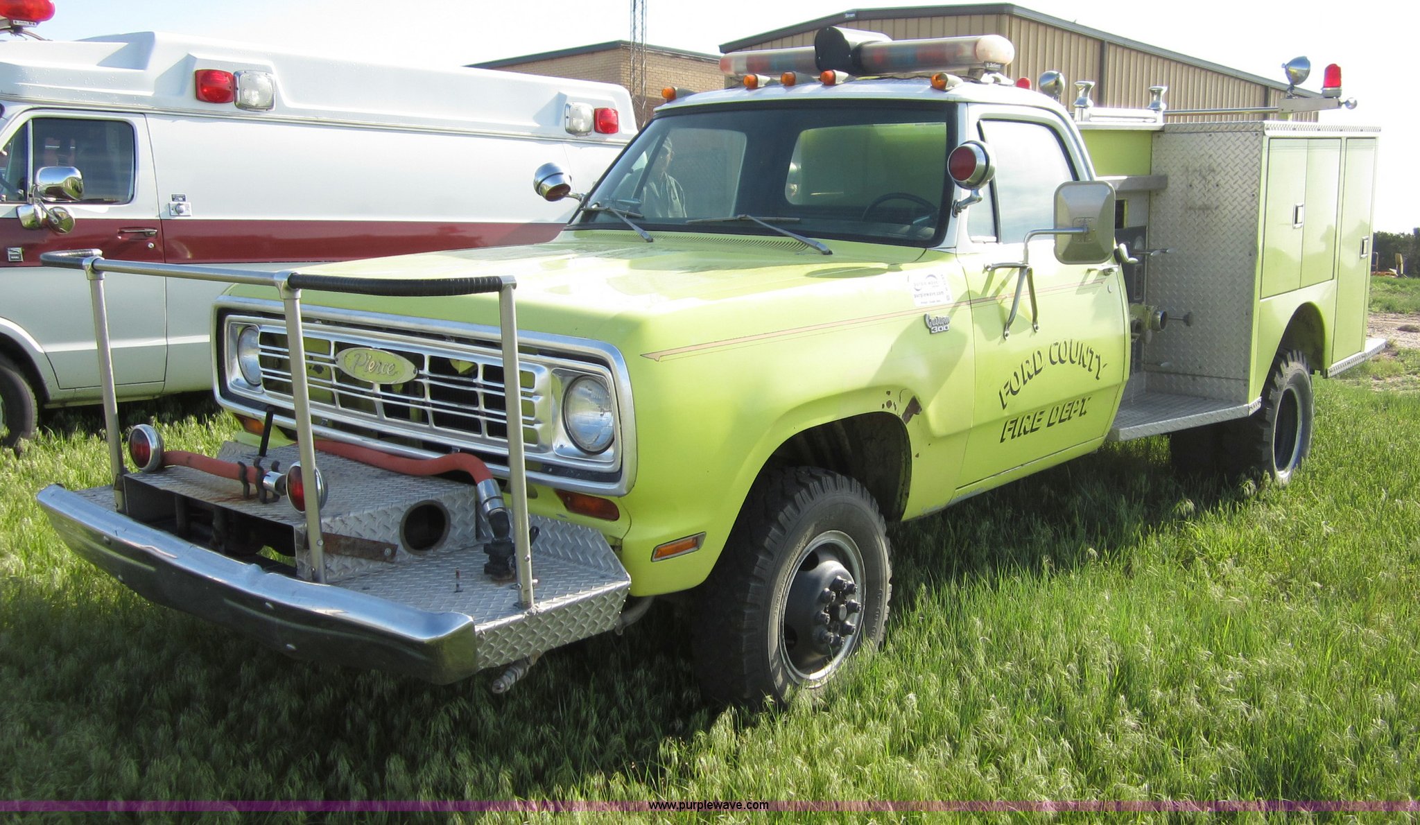 Purple Wave is selling a used Fire Truck or Emergency Vehicle in Kansas. This item is a 1975 Dodge W30 mini pumper fire truck with the following: 31,337 miles on odometer, Not actual mileage, 360 CID gas engine, Four speed manual transmission, Four wheel drive, Heat, Manual windows and locks, Pierce bed, 300 gallon water tank, No pump, Front winch, Electric hose reel, 7.50-16LT tires