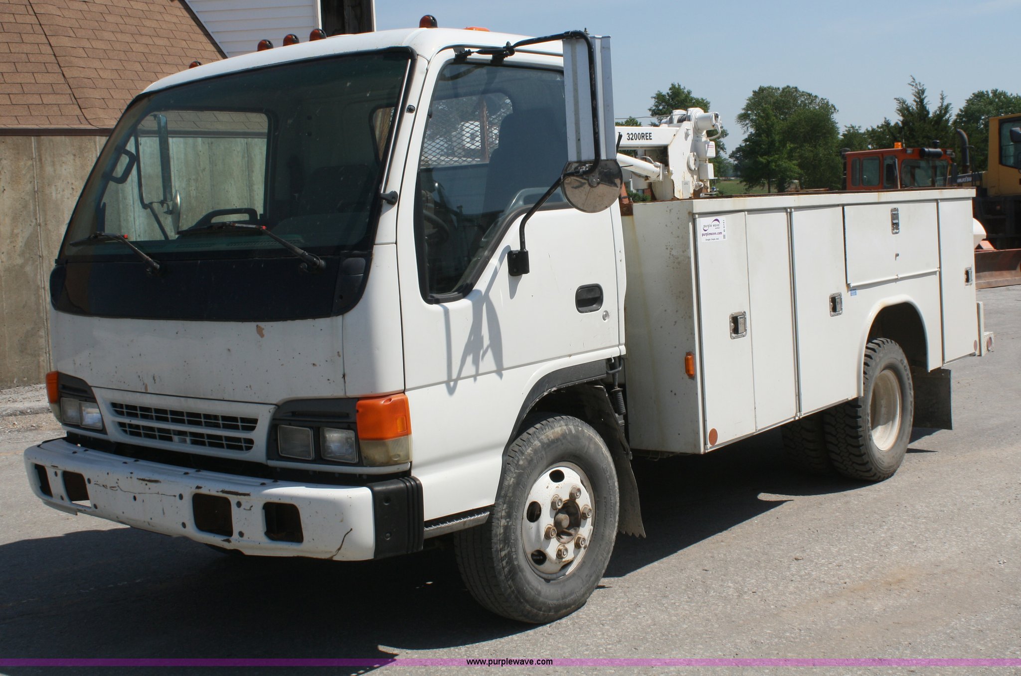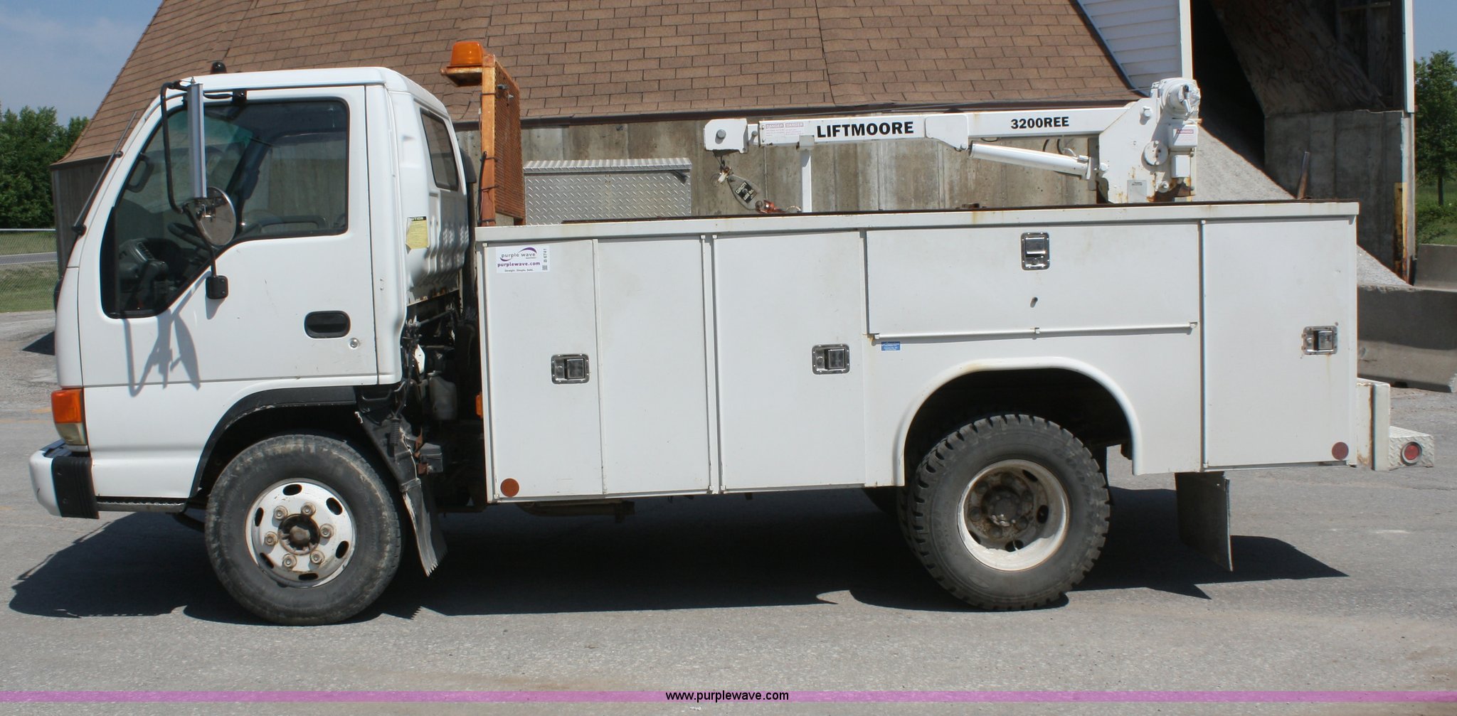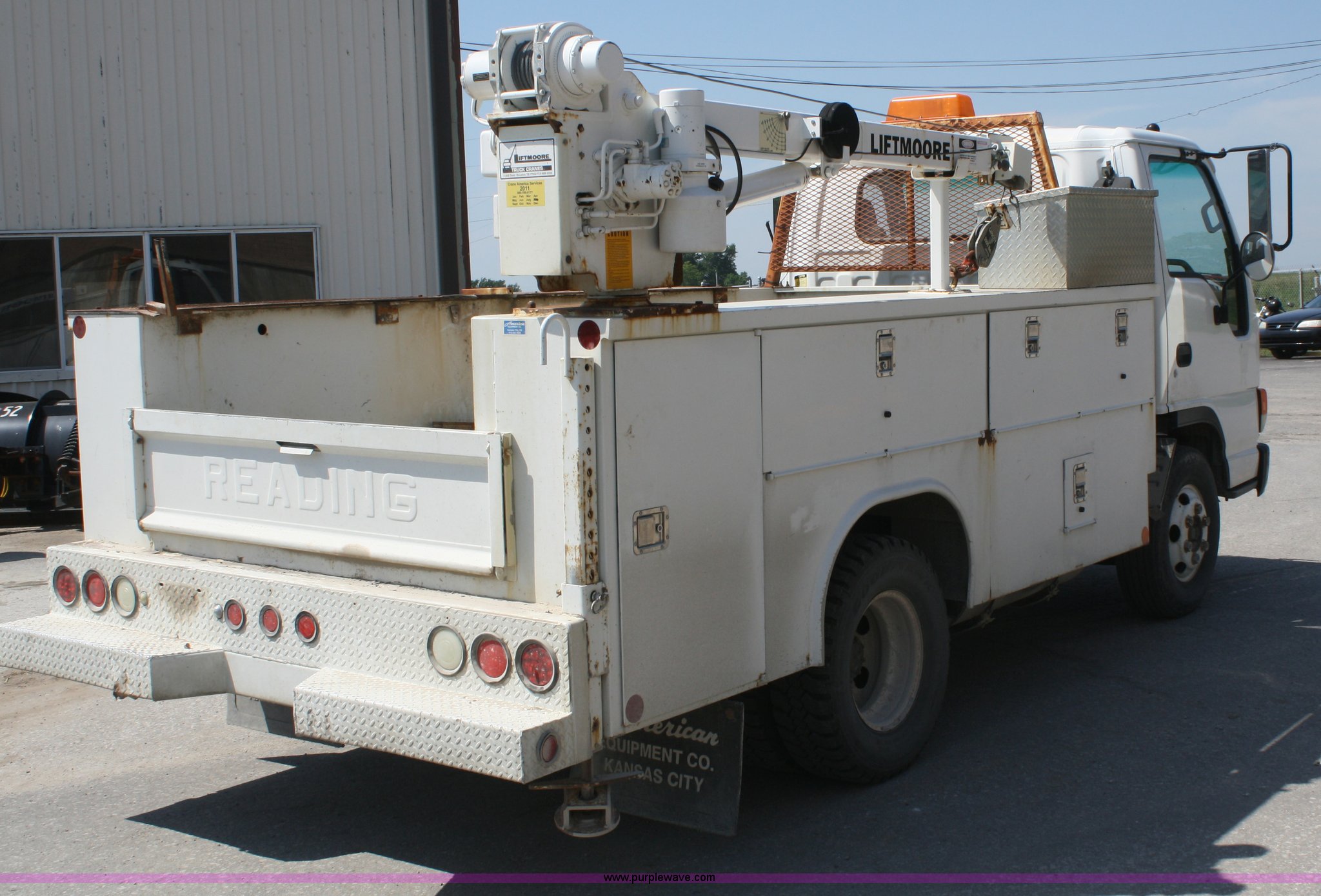 Purple Wave is selling a used Service Truck in Kansas. This item is a 1998 Isuzu service truck with the following: 191,710 miles on odometer, Isuzu 3.9L turbo diesel engine, Automatic transmission, Reading 11'L utility bed, Lift Moore 32000REF crane, Serial U297W58, 3,200 lb capacity, 15' maximum reach, 3,200 lb capacity block, 235/85R16 tires, AM/FM does not work, AC needs recharged, Muffler is bad, Intermittent transmission light, Crane is rough, Engine runs rough
