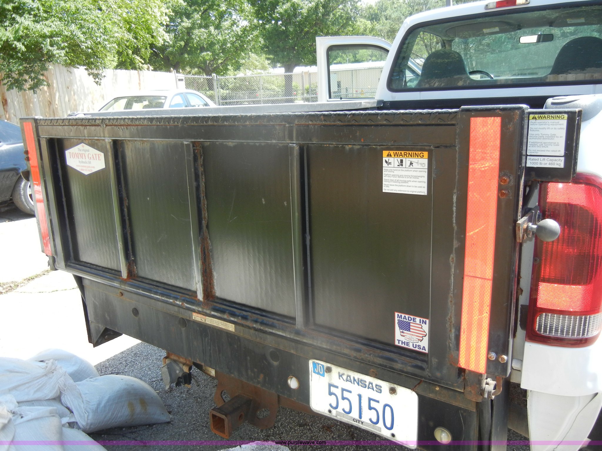 2001 Ford F250 Super Duty XL pickup truck. 59,935 miles on odometer, Triton 6.8L V10 EFI gas engine, Automatic transmission, AC and heat, AM/FM, Manual windows and locks, Vinyl interior Bench seat damaged, Receiver hitch, Trailer wiring, Tommy lift Model 601340, Serial 301942, Bedliner, Front tow hooks, Exterior cosmetic damage, Body rust, Paint chipping/peeling. 1FTNF20S41EC29612. Prairie Village Public Works. 3535 Somerset Drive. Prairie Village, KS 66208