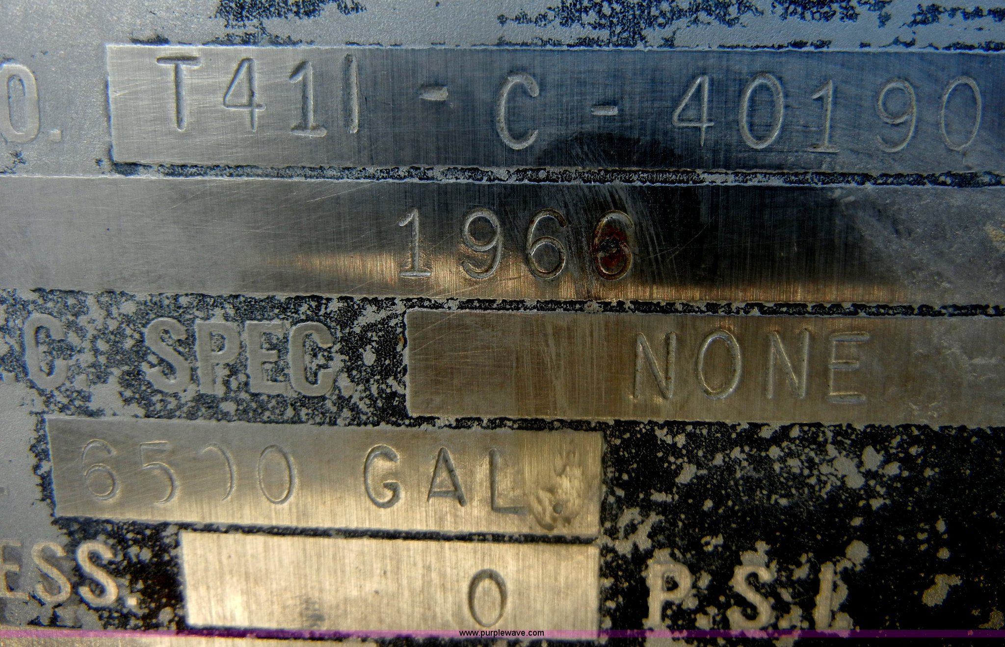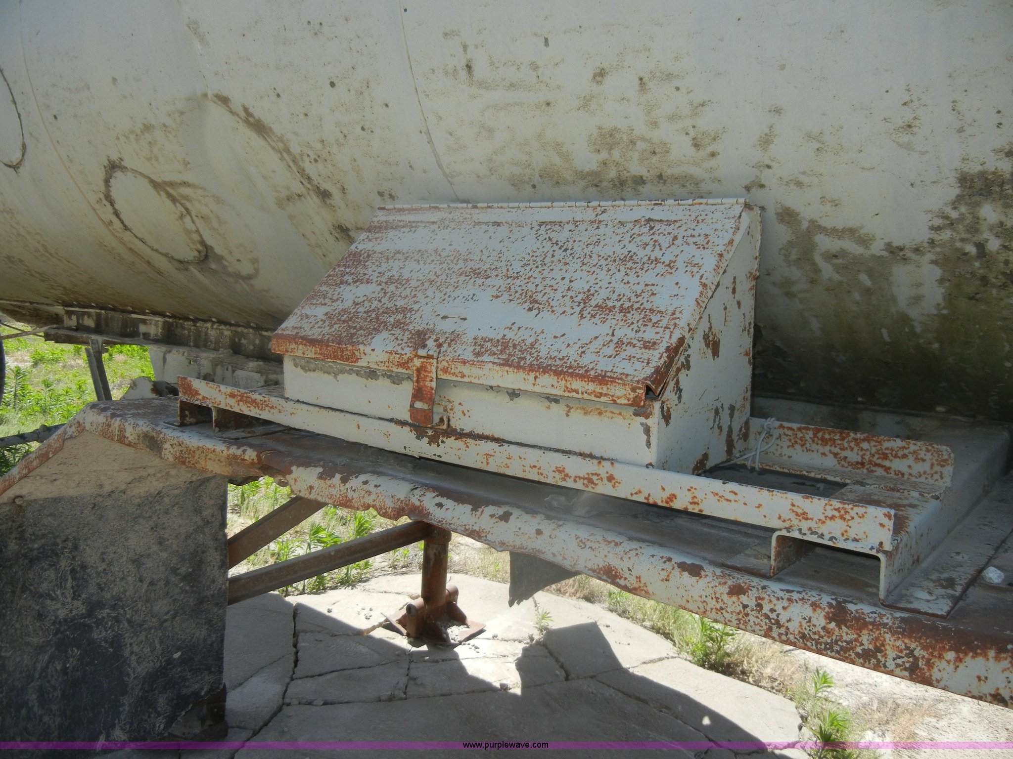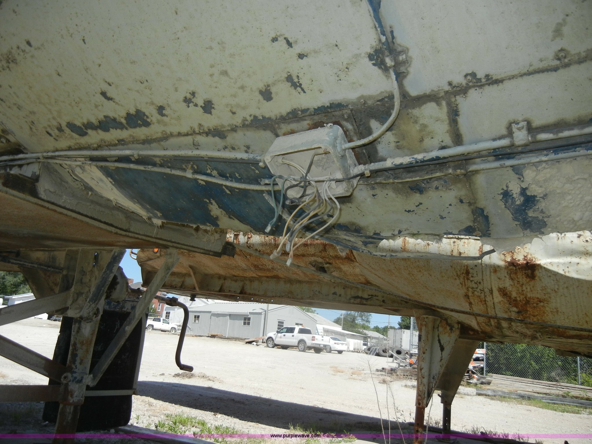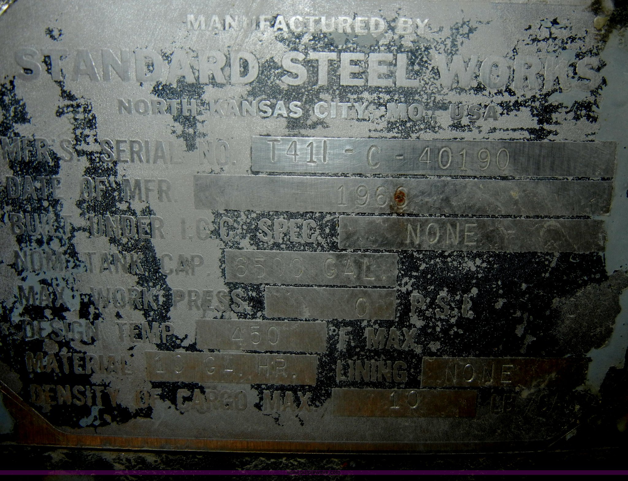 Purple Wave is selling a used Tank Trailer in Kansas. This item is a 1966 Standard Steel Works water tanker with the following: 6,500 gallon capacity, 10 gauge material, Spring suspension, 8" spray bar, Pump driven, 10.00R20 tires, Worn, Dents, Body rust, Will not hold water overnight