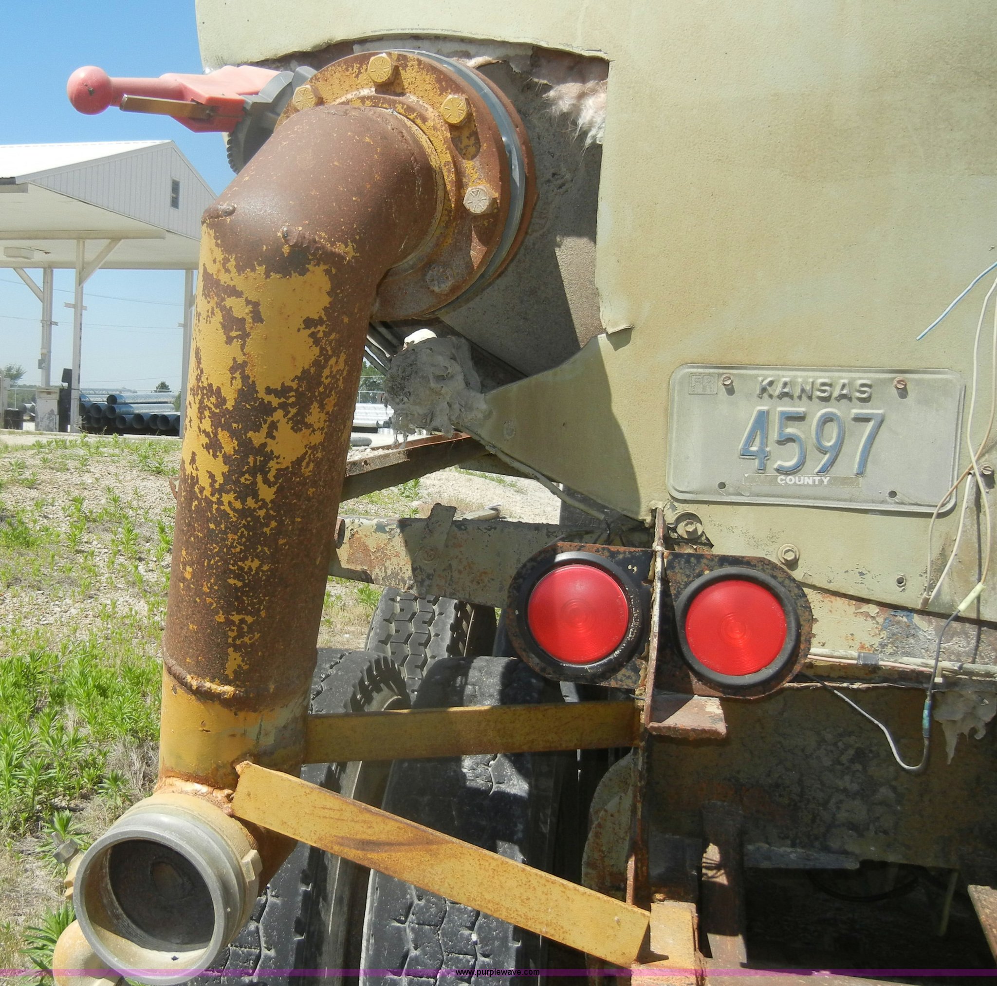 1966 Standard Steel Works water tanker. 6,500 gallon capacity, 10 gauge material, Spring suspension, 8" spray bar Pump driven, 10.00R20 tires Worn, Dents, Body rust, Will not hold water overnight. T41IC40190. Franklin County. 1428 S Main, Suite 2. Ottawa, KS 66067