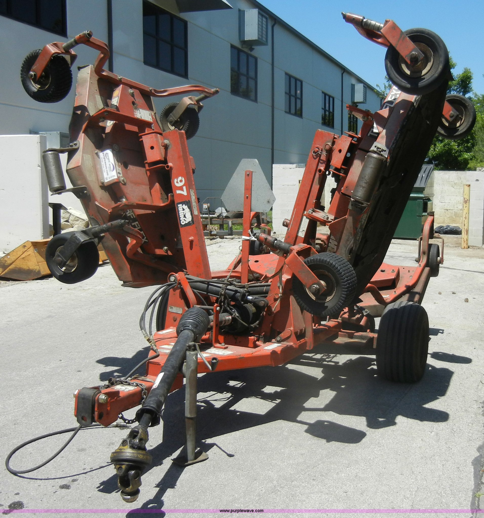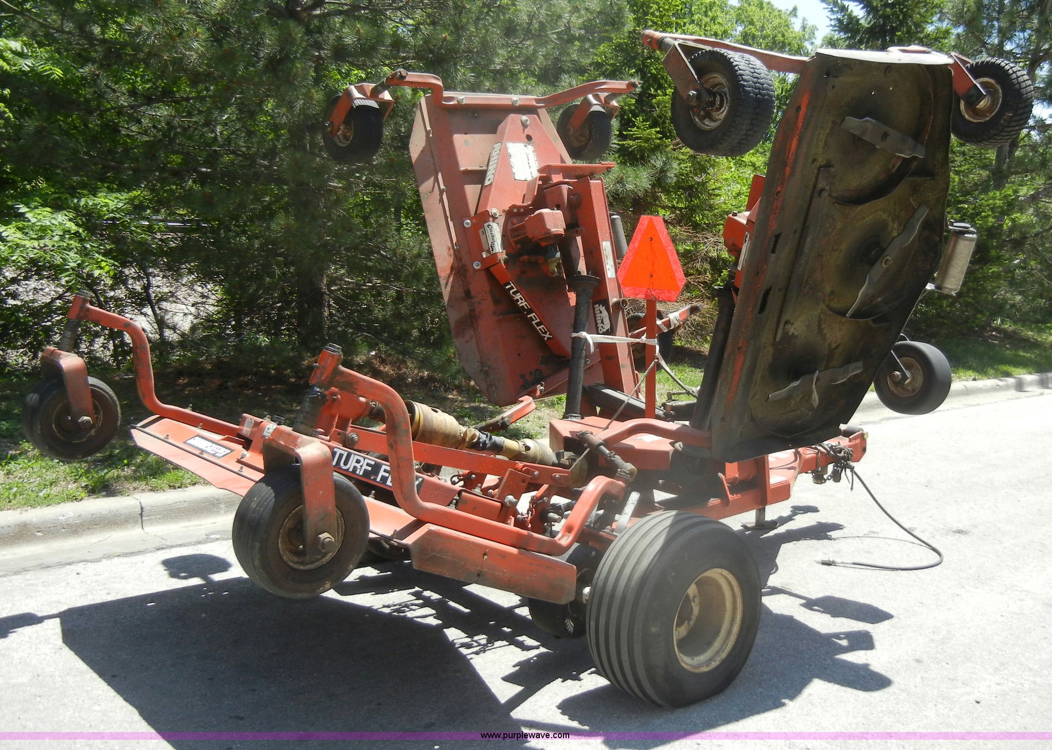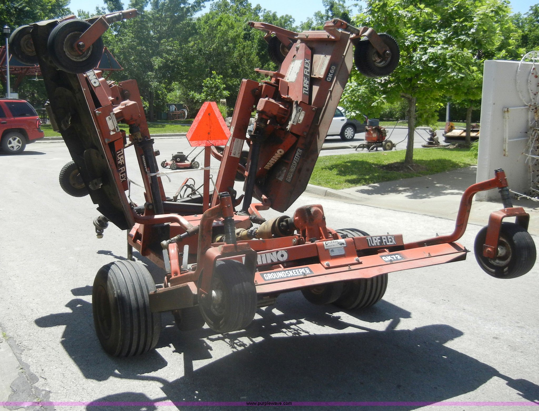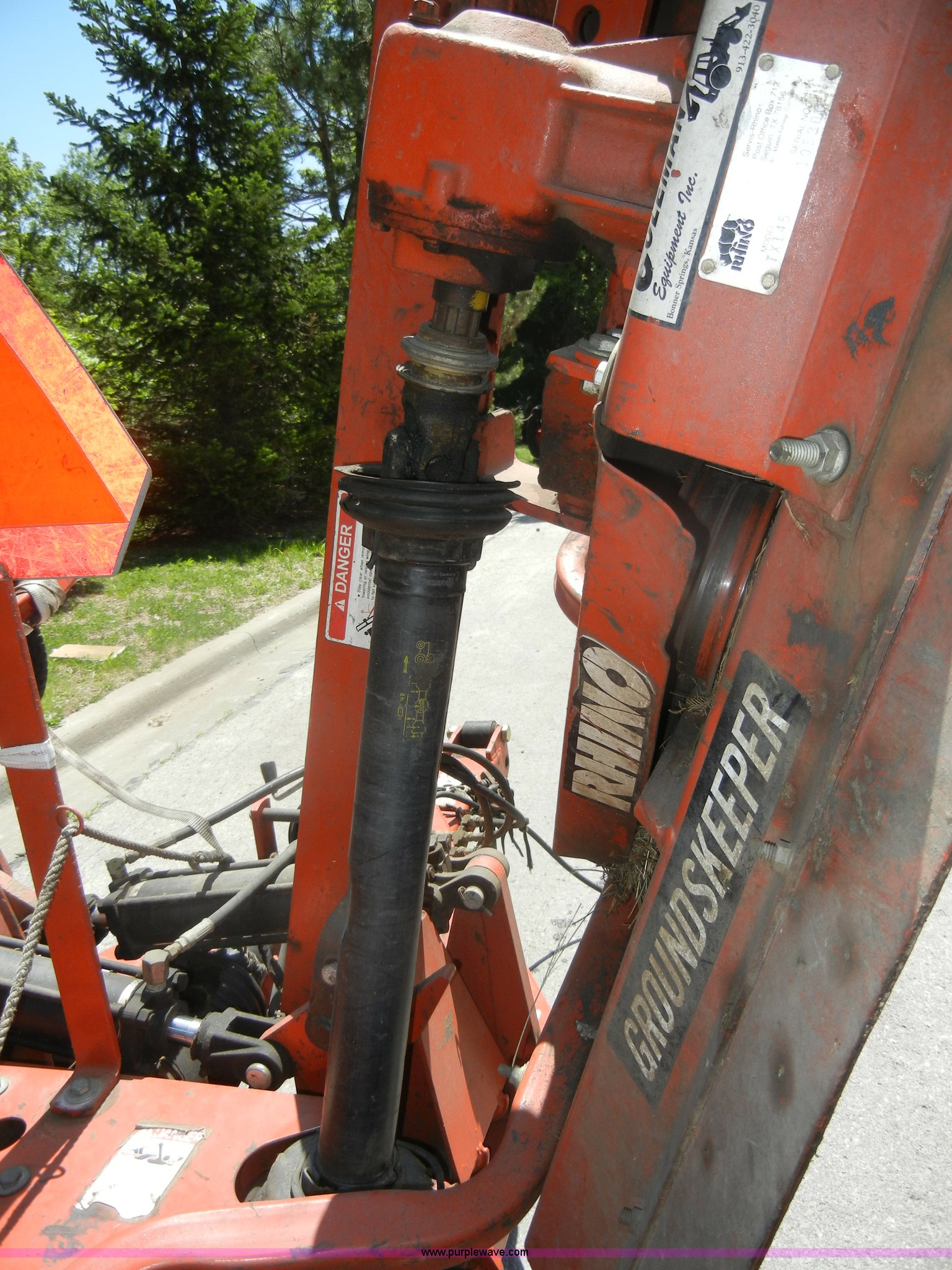 Purple Wave is selling a used Mower, Cutter, Shredder in Kansas. This item is a Rhino TX145 grounds keeper mower with the following: 14.5' cut, (2) 5' side wings, Serials 10530C, 10530A, One PTO shaft broken, 6' rear mower, Serial 10530B, Pin hitch, Hydraulics, 540 PTO, 13.6.50-6 deck tires, Foam filled, 26x12.00-12 main tires, Serial 10530