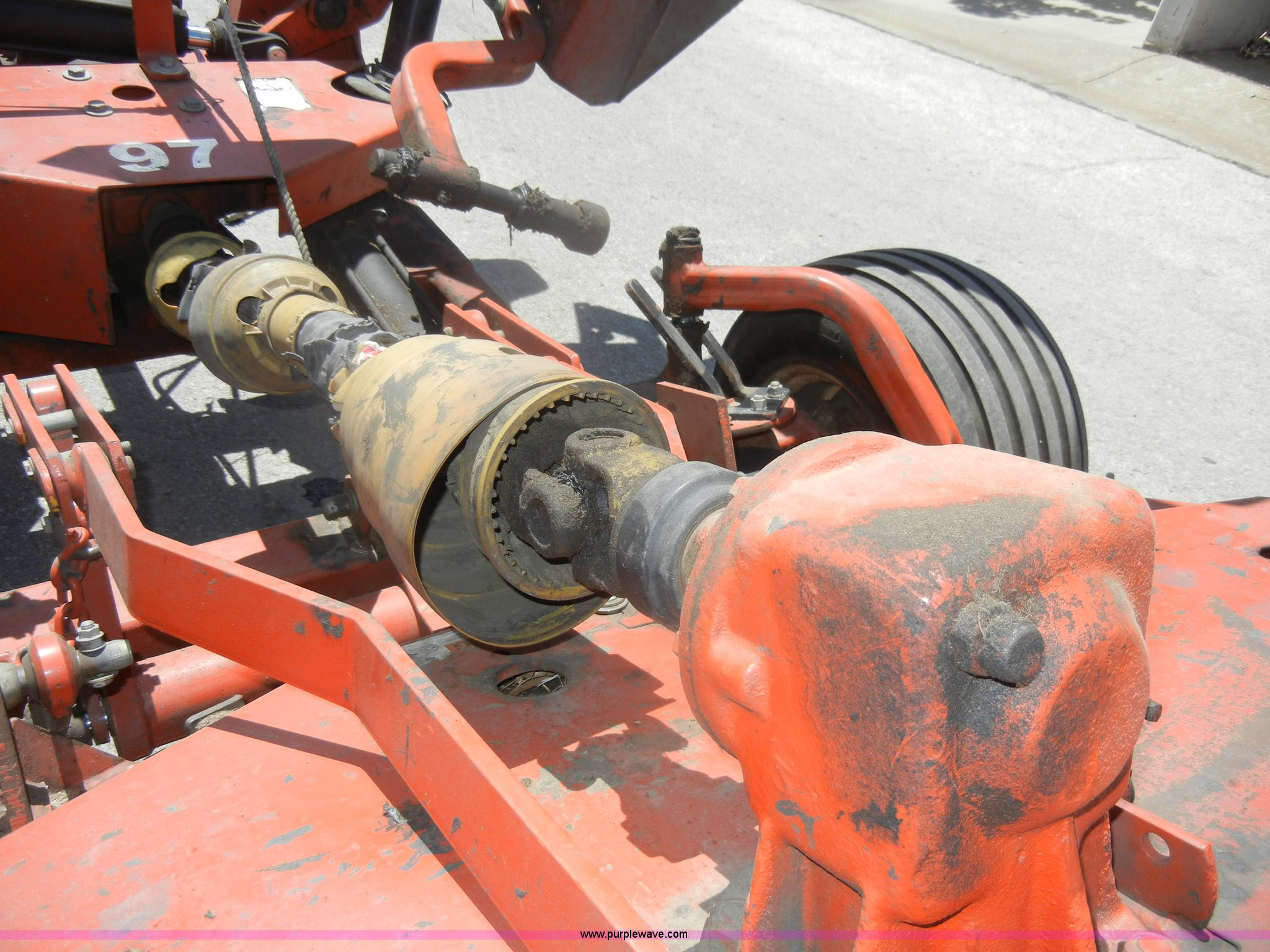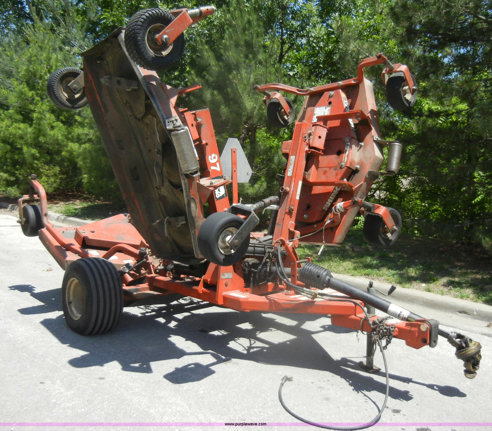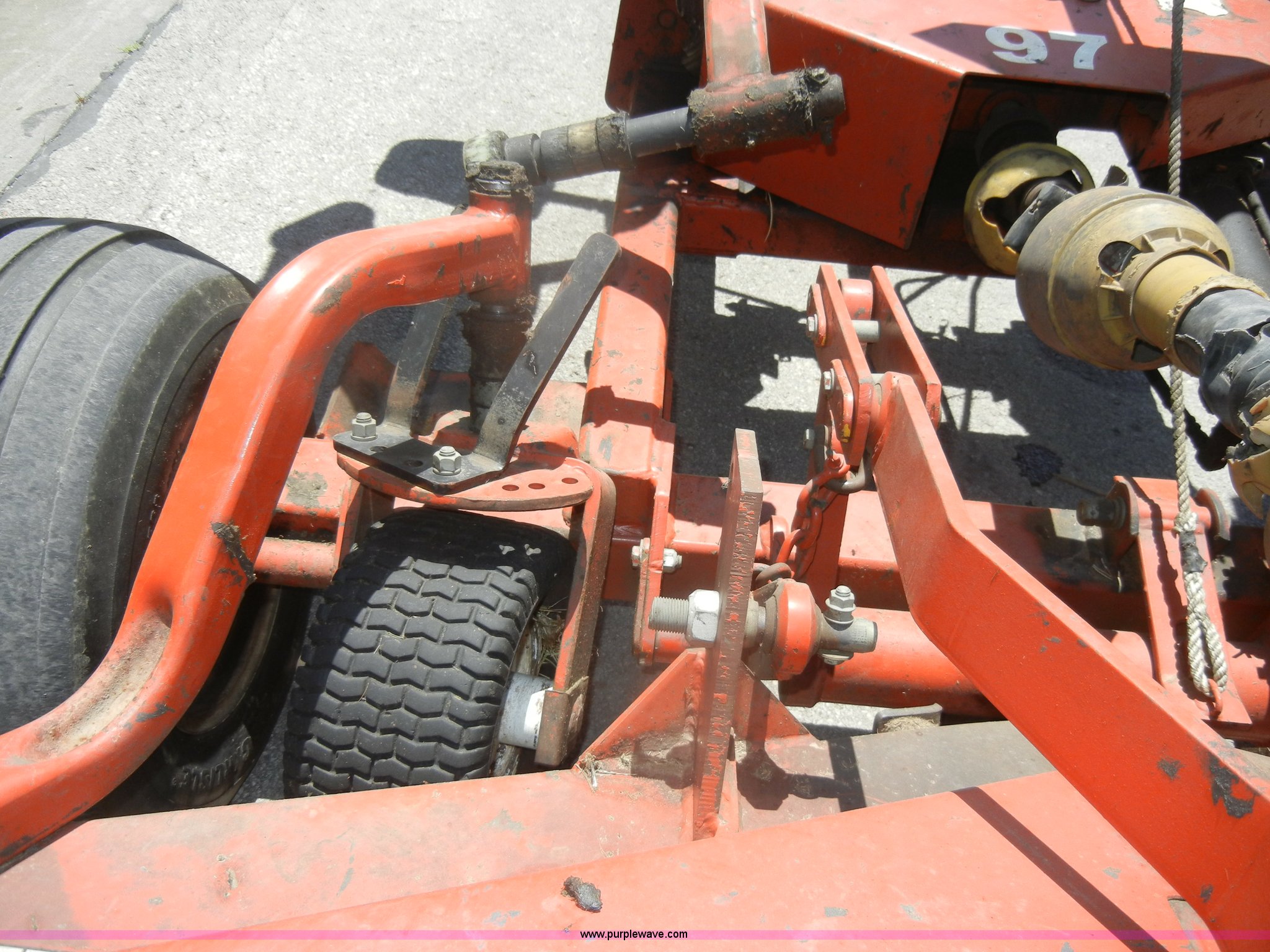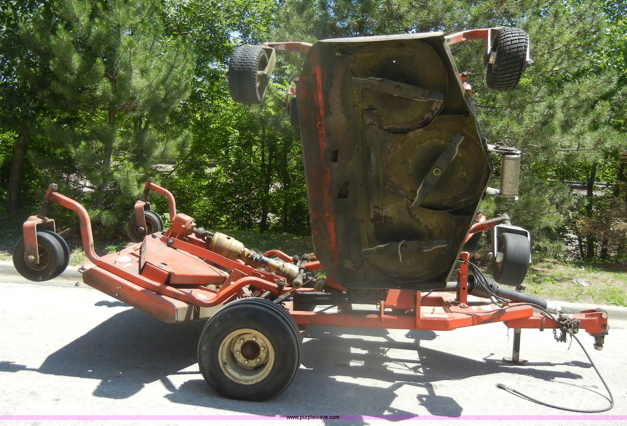 Purple Wave is selling a used Mower, Cutter, Shredder in Kansas. This item is a Rhino TX145 grounds keeper mower with the following: 14.5' cut, (2) 5' side wings, Serials 10530C, 10530A, One PTO shaft broken, 6' rear mower, Serial 10530B, Pin hitch, Hydraulics, 540 PTO, 13.6.50-6 deck tires, Foam filled, 26x12.00-12 main tires, Serial 10530