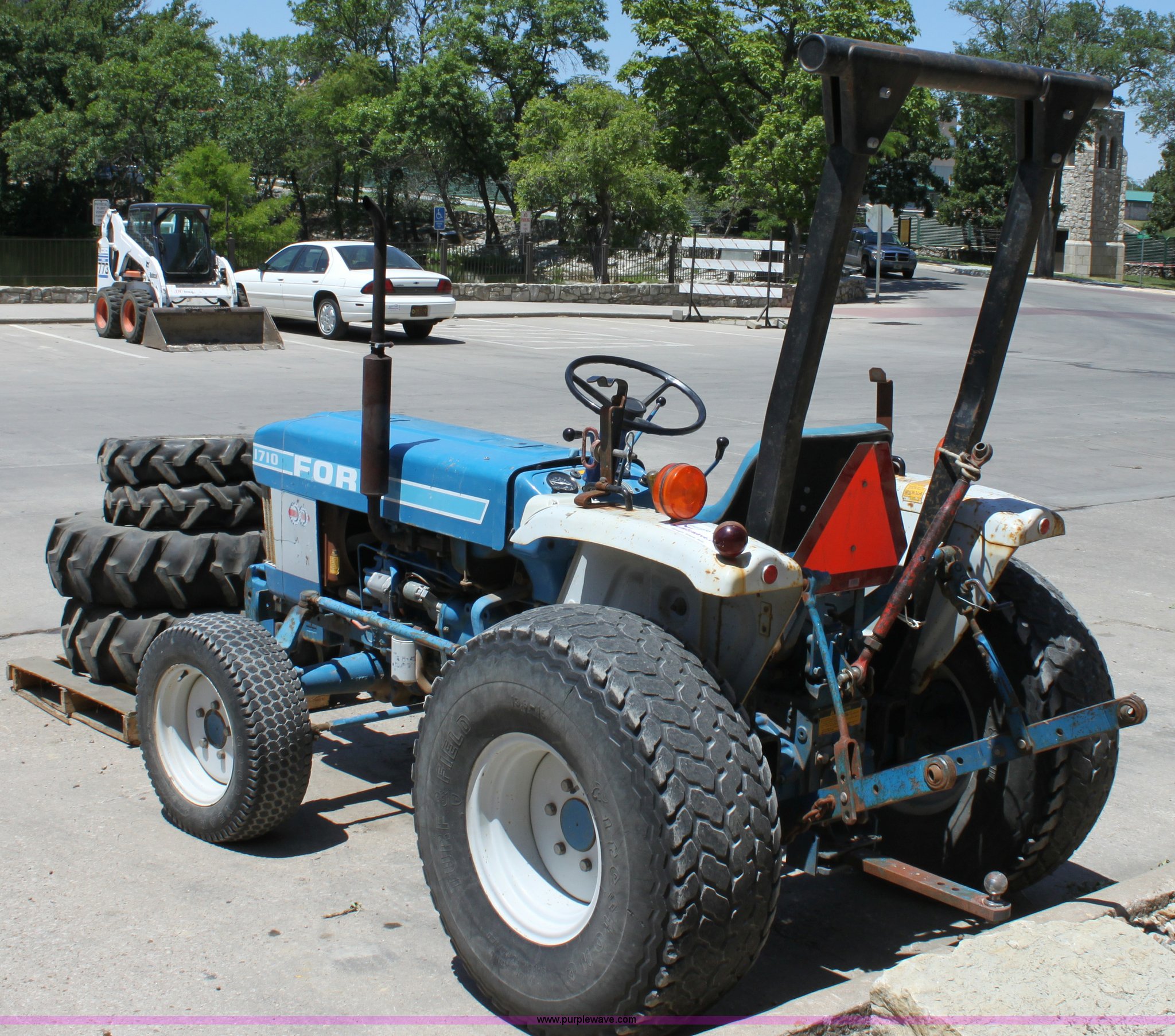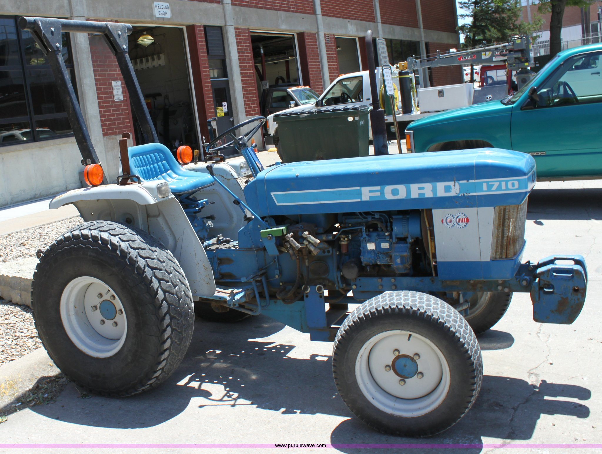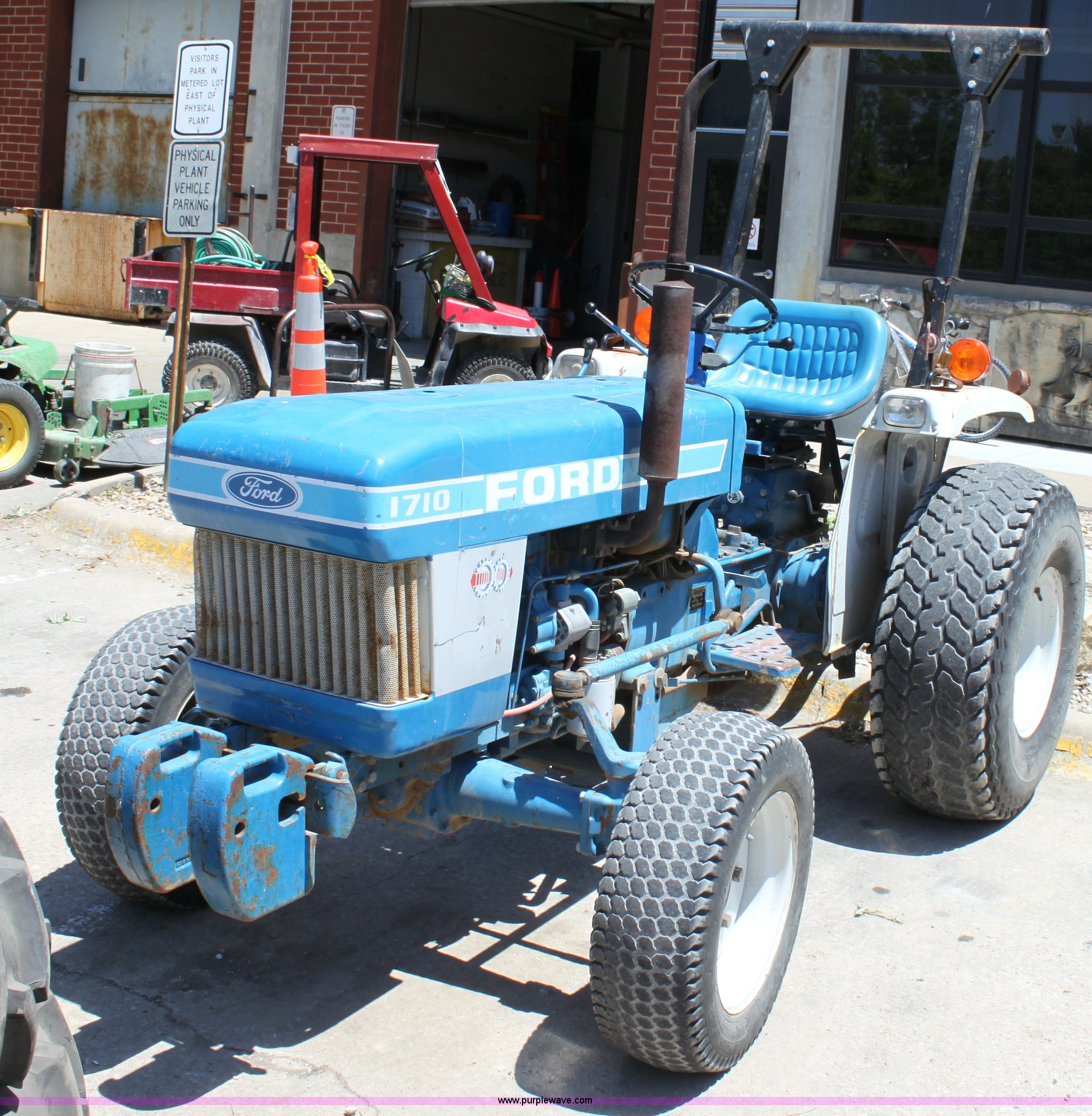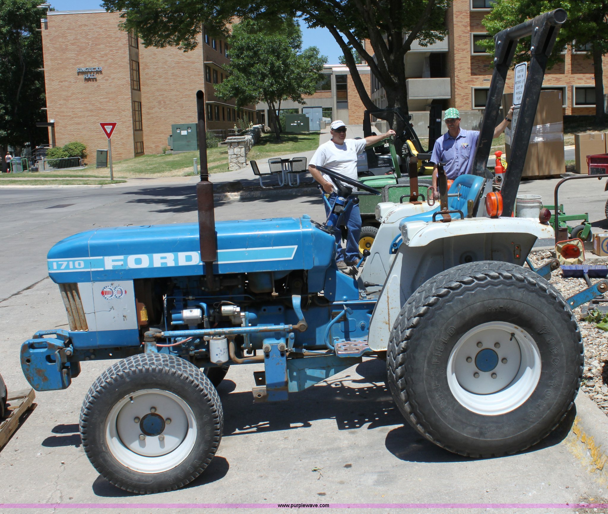 Purple Wave is selling a used Tractor in Kansas. This item is a Ford 1710 tractor with the following: 2,754 hours on meter, Ford three cylinder diesel engine, 12F-4R gears, Four wheel drive, Three point, 540 PTO, Draw bar, Joystick control for auxiliary hydraulics, Front weights, Comfort cover included, New Holland 702C 7' snow plow included, 27x8.50-15NHS front tires, 13.6-16 rear tires, Extra set of front and rear tires included, Casting is cracked, Serial UL17465