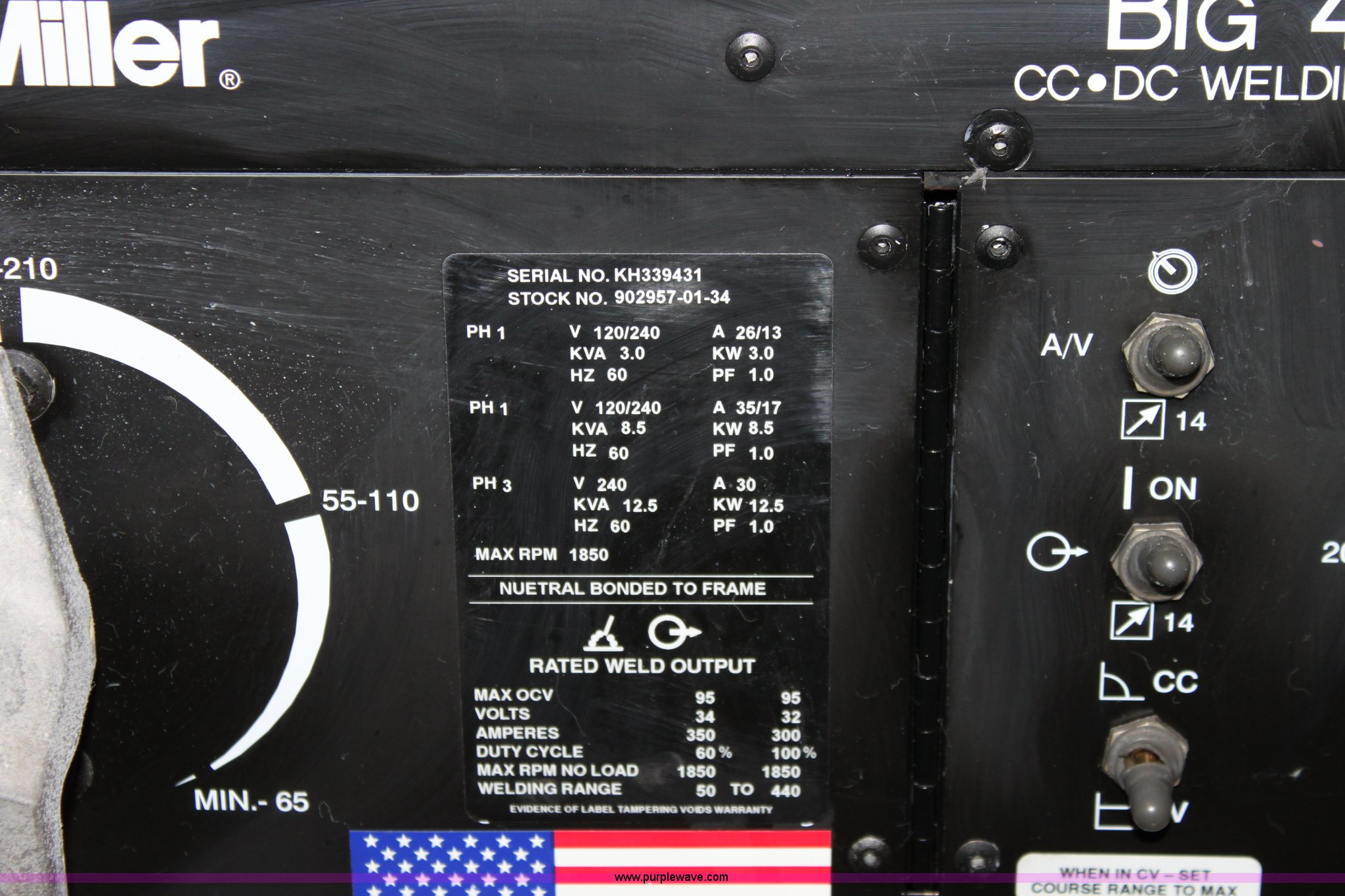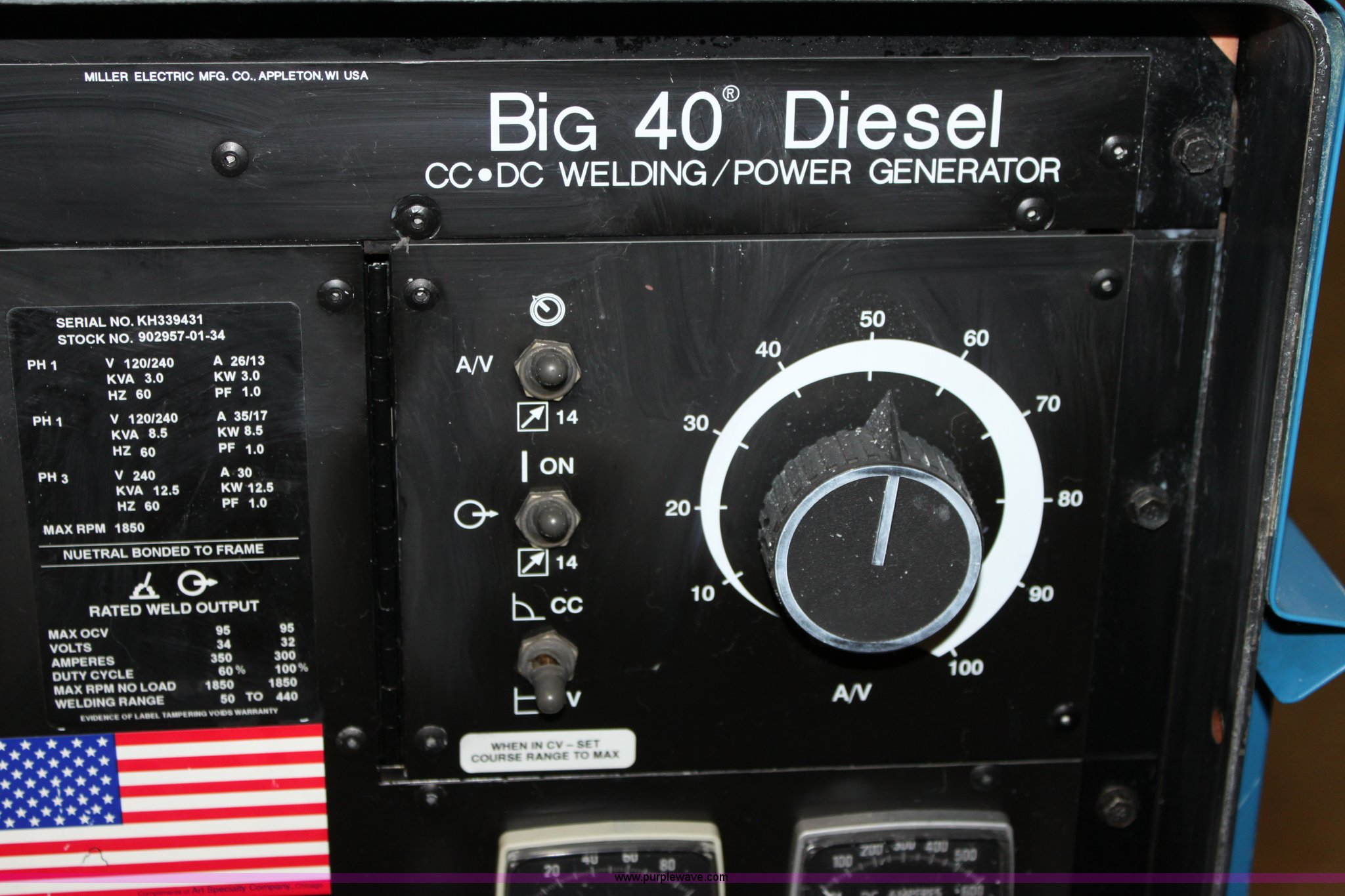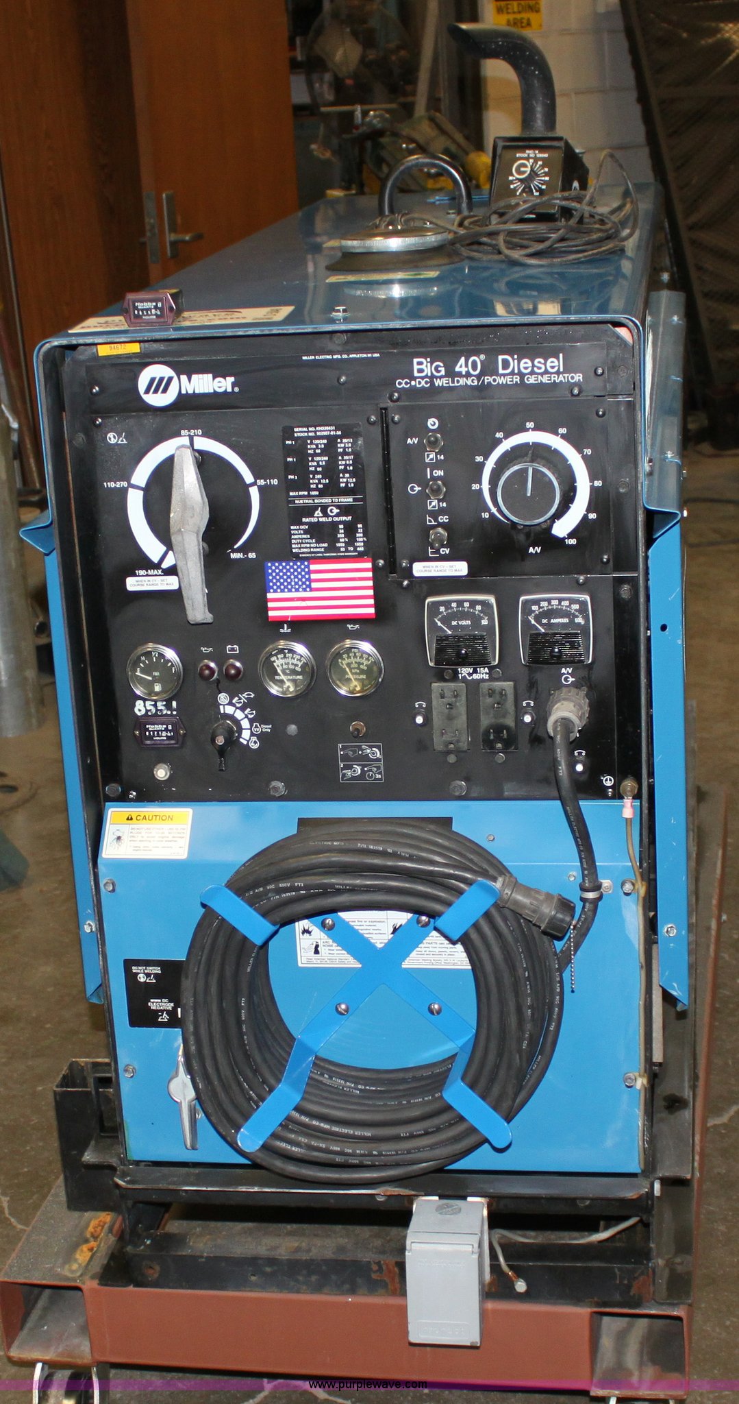 Purple Wave is selling a used Welder (Manual) in Kansas. This item is a Miller Big 40 diesel constant current DC welder/generator with the following: Approx. 976 hours, Continental three cylinder diesel engine, Model TMD20, Serial 96110134, (4) 120v outlets, Contains high KW package, 75' of lead, Remote included, 120/240v, Single three phase outlet, Alternator replaced at 200 hours