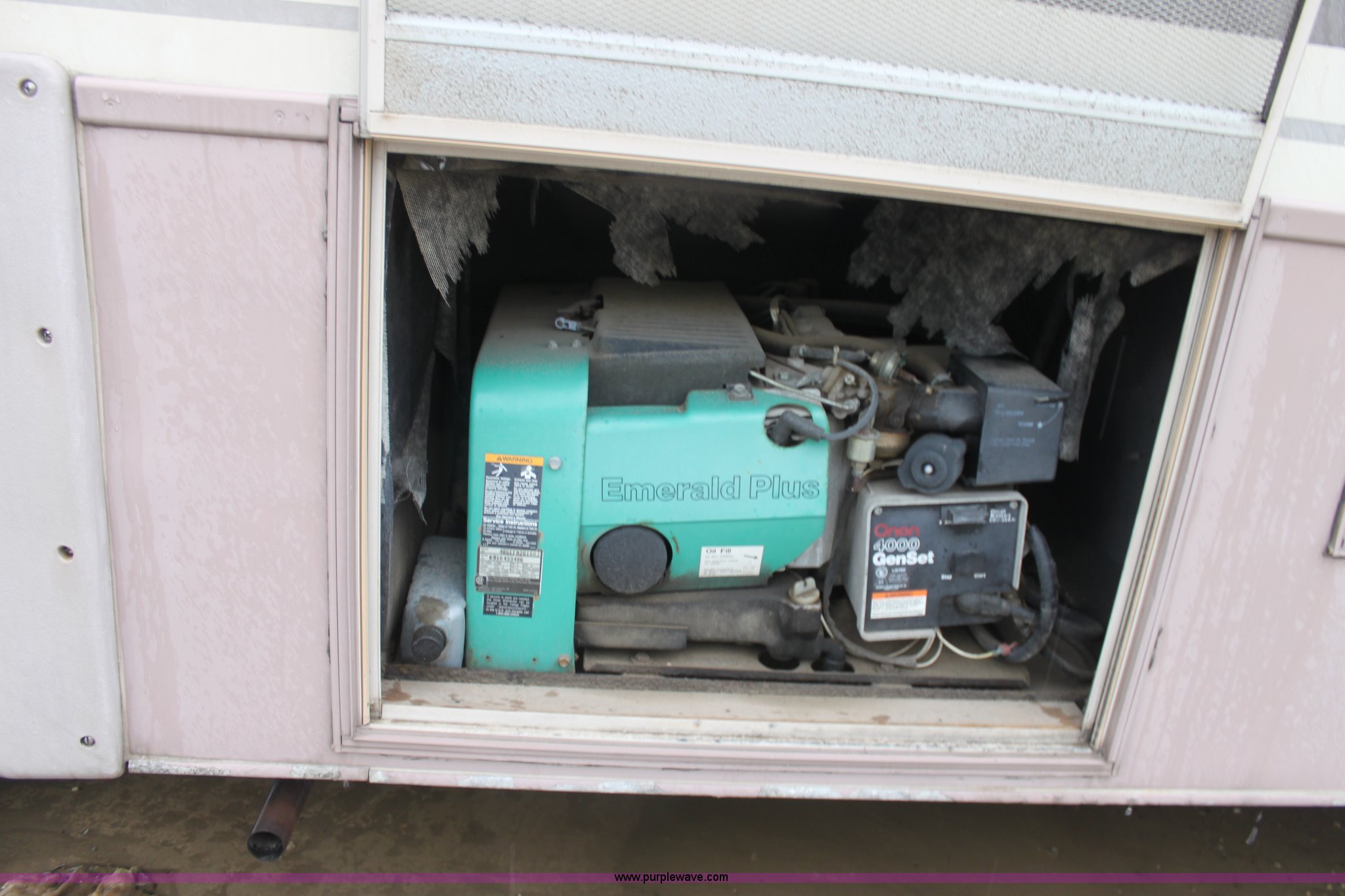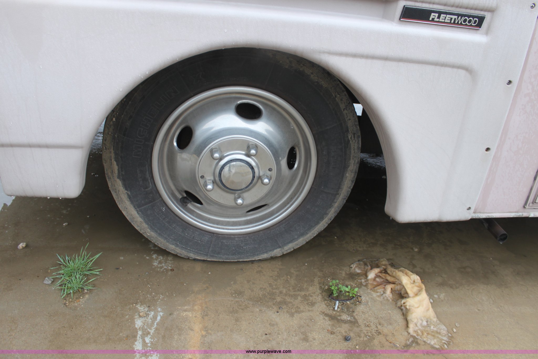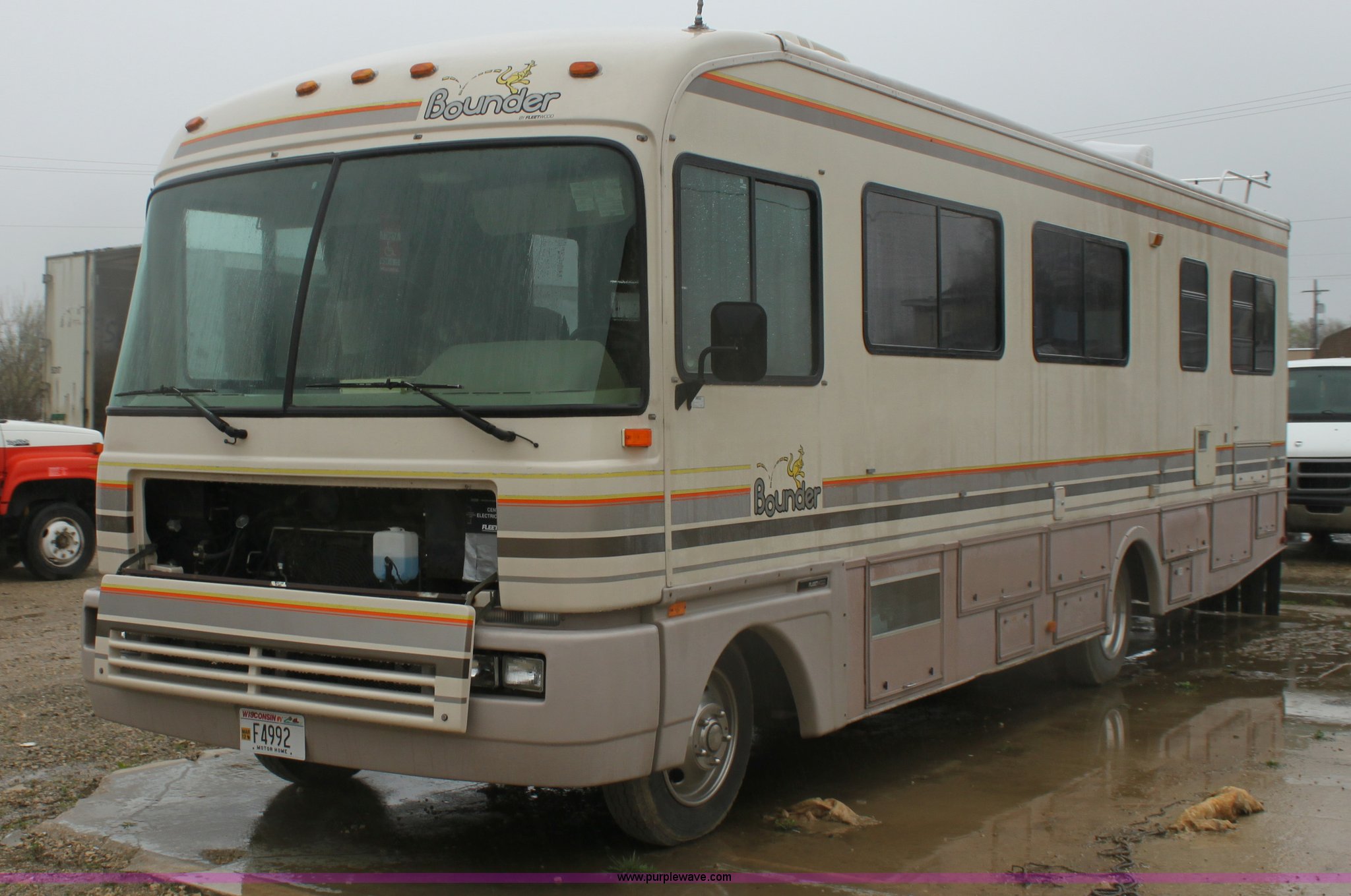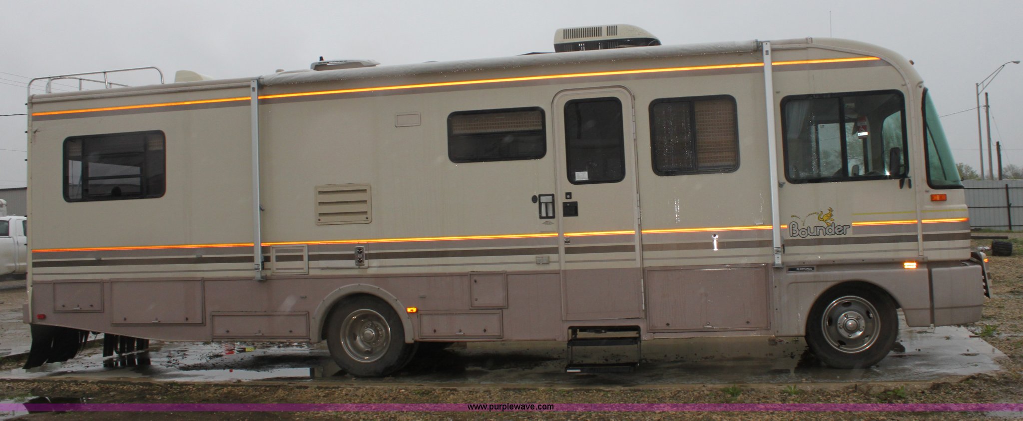 Purple Wave is selling a used RV in Kansas. This item is a 1992 Fleetwood Bounder RV camper with the following: 90,188 miles on odometer, 141 hours on meter, 7.4L gas engine, Automatic transmission, AC and heat, AM/FM/Cassette, Tilt, Cruise, (2) holding tanks, Onan 4,000 watt generator, Electric start, Panasonic 13" television, Folding kitchen table, Magic Chef microwave, Magic Chef four burner oven, Dometic freezer and refrigerator, Tub/shower, Full size master bed, Awning, 8F-R19.5 tires, Winterized for storage