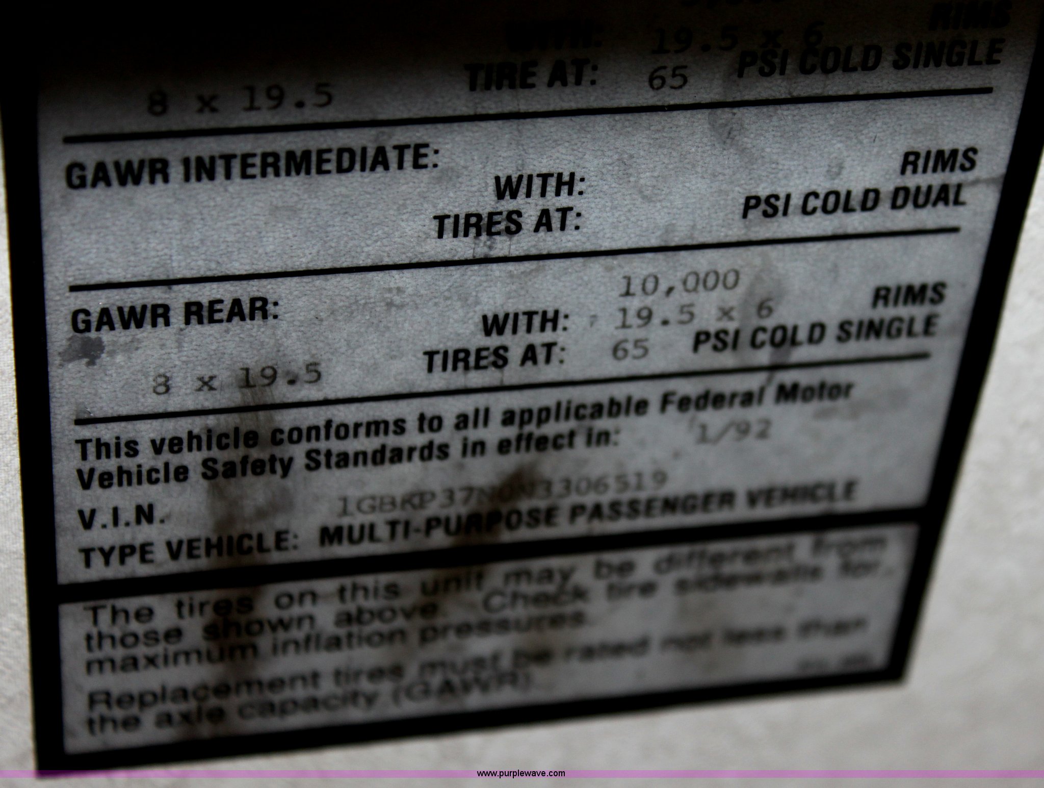 1992 Fleetwood Bounder RV camper. 90,188 miles on odometer, 141 hours on meter, 7.4L gas engine, Automatic transmission, AC and heat, AM/FM/Cassette, Tilt, Cruise, (2) holding tanks, Onan 4,000 watt generator Electric start, Panasonic 13" television, Folding kitchen table, Magic Chef microwave, Magic Chef four burner oven, Dometic freezer and refrigerator , Tub/shower, Full size master bed, Awning, 8F-R19.5 tires, Winterized for storage. Title distribution may be delayed up to 14 days from verification of funds. 1GBKP37N0N3306519. Lyon County Sheriff. 500 S Prairie. Emporia, KS 66801