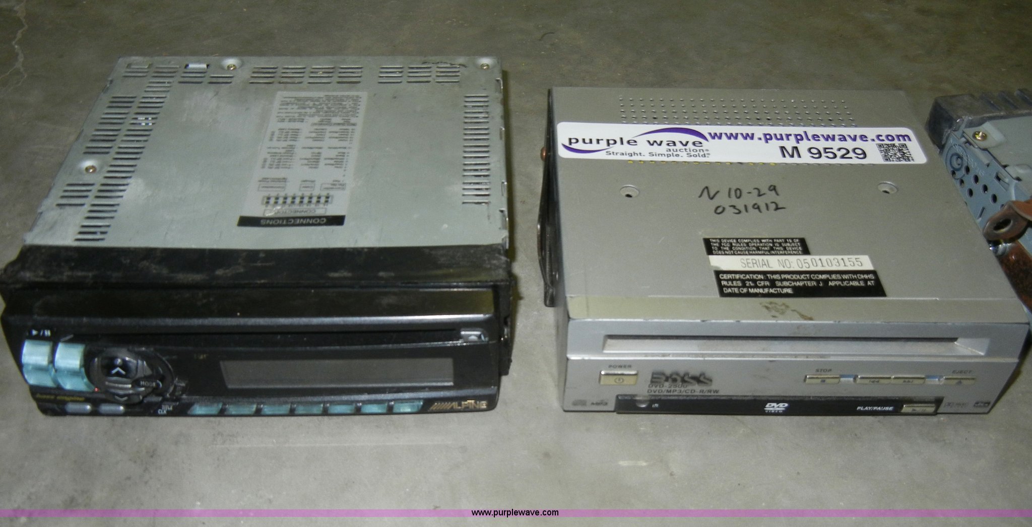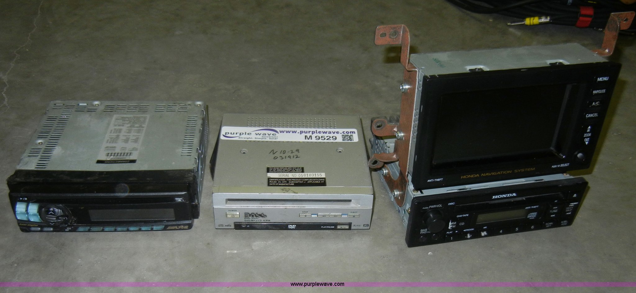 Purple Wave is selling a used Electronics in Kansas. This item is a Assorted electronics with the following: Honda CD player with navigation system, Alpine CD player, Boss CD player