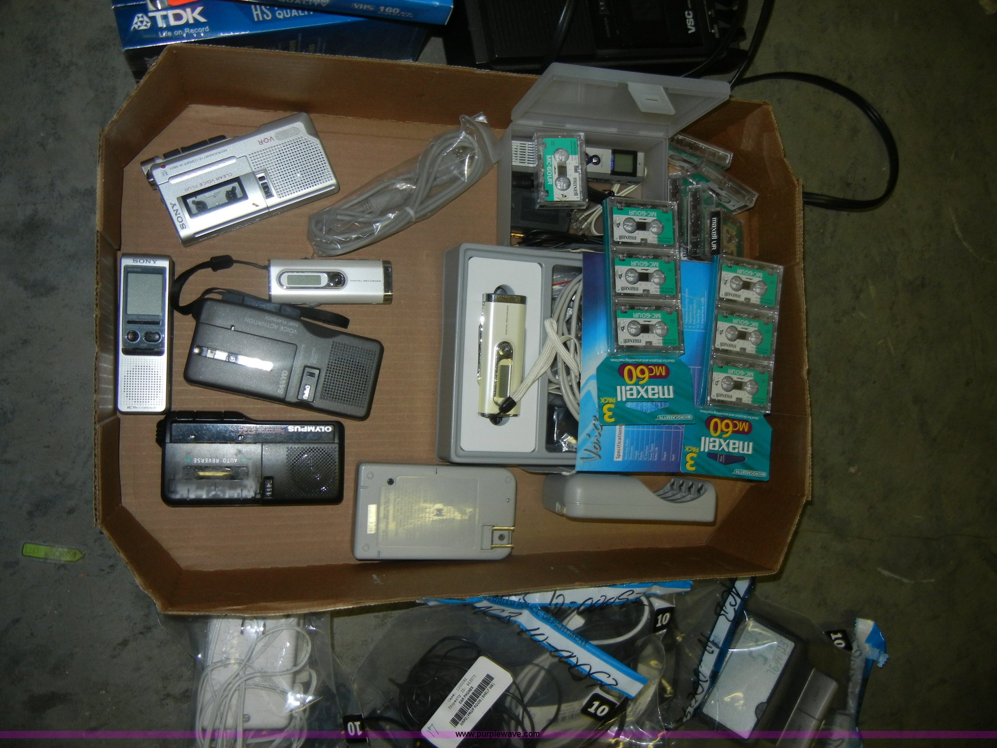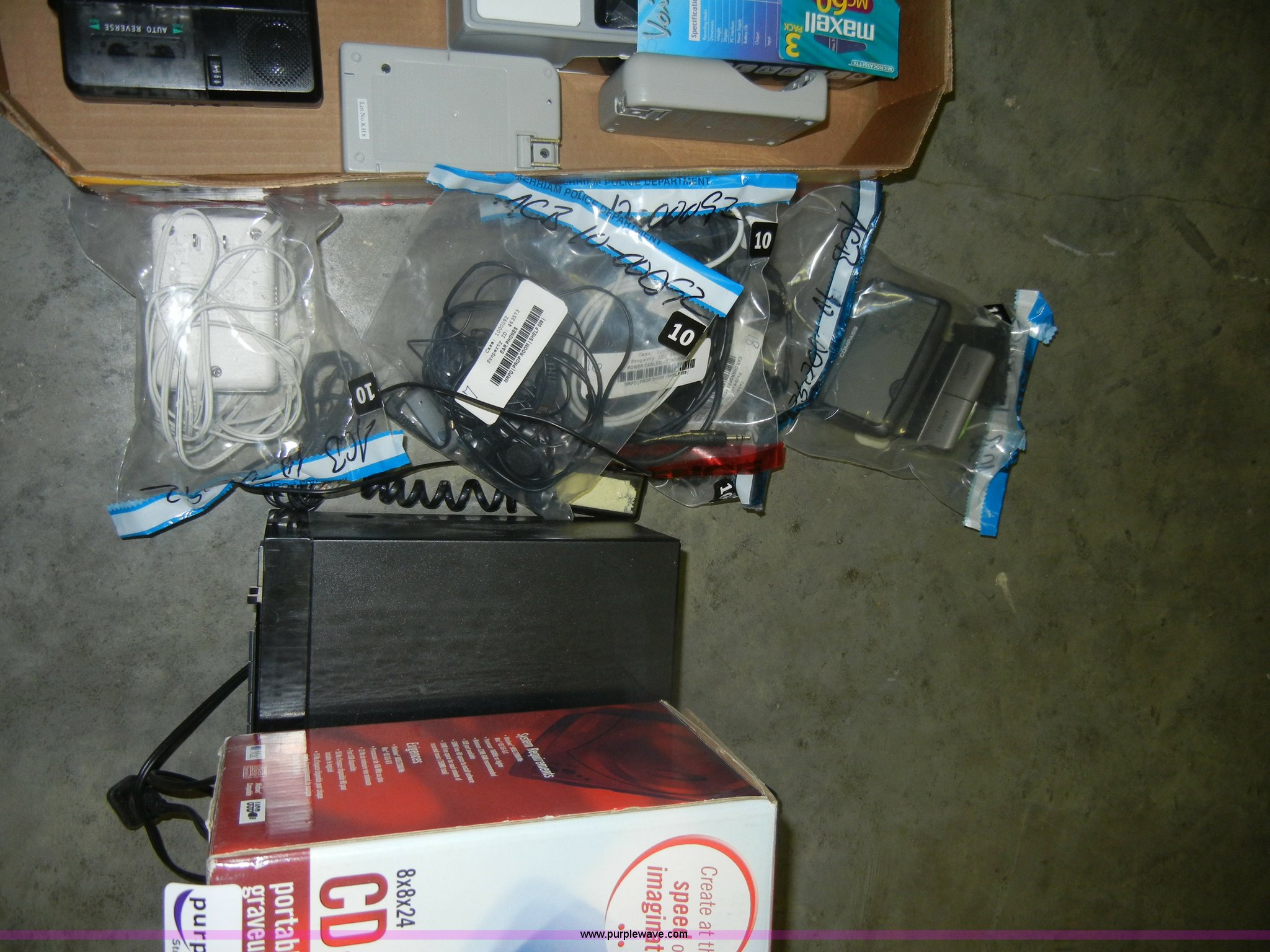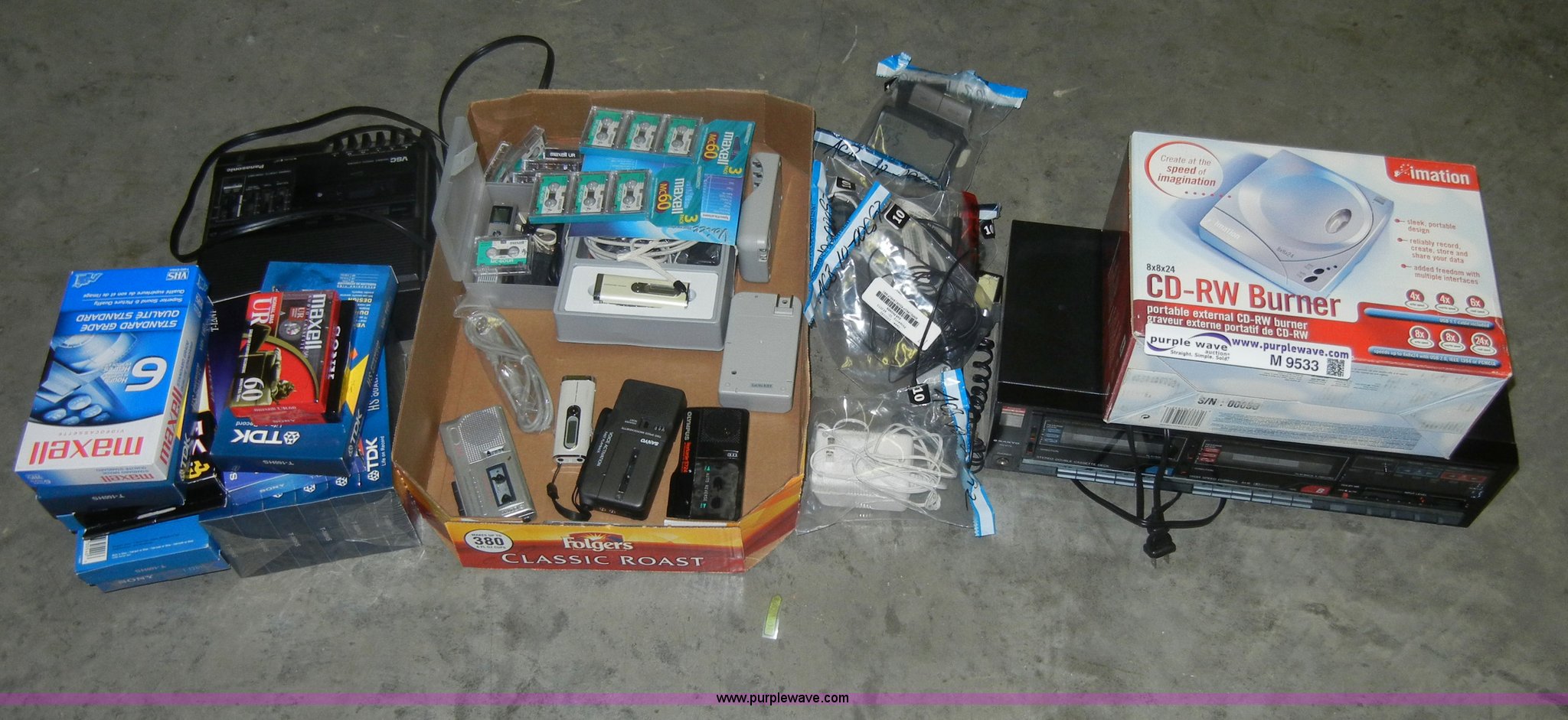 Purple Wave is selling a used Electronics in Kansas. This item is a Assorted items with the following: Imation CD-RW burner, Sanyo RDW79 cassette player, Assorted chargers, (6) recorders, Cassette and VHS tapes, VSC cassette player