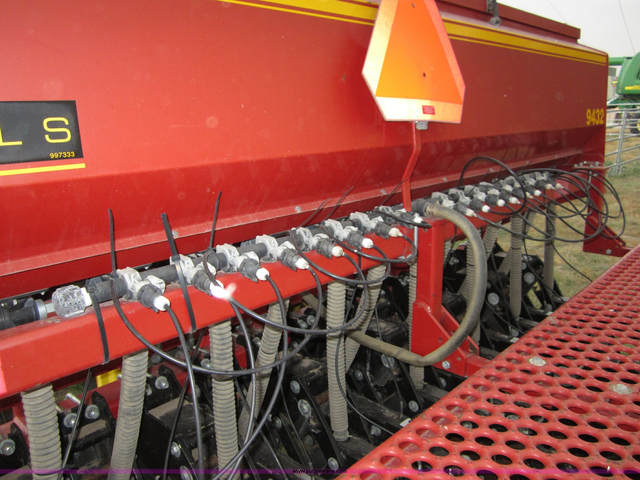 Purple Wave is selling a used Grain Drill or Seeder in Kansas. This item is a Sunflower 9432-30 grain drill with the following: 30', 7.5" spacing, Double disk, Three point, Markers, Liquid fertilizer tubes, Folding width is 13'W, 400 gallon fertilizer tank, 11L-15 road tires, 9.5L-15SL planting tires, Currently set to bypass tank on drill by using saddle tanks from tractor to run fertilizer