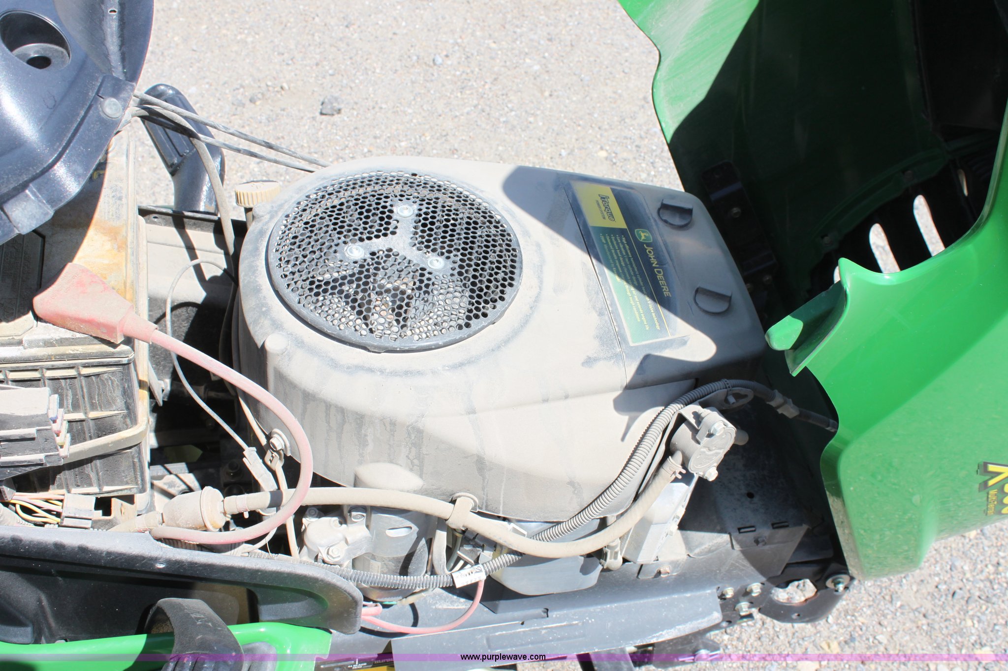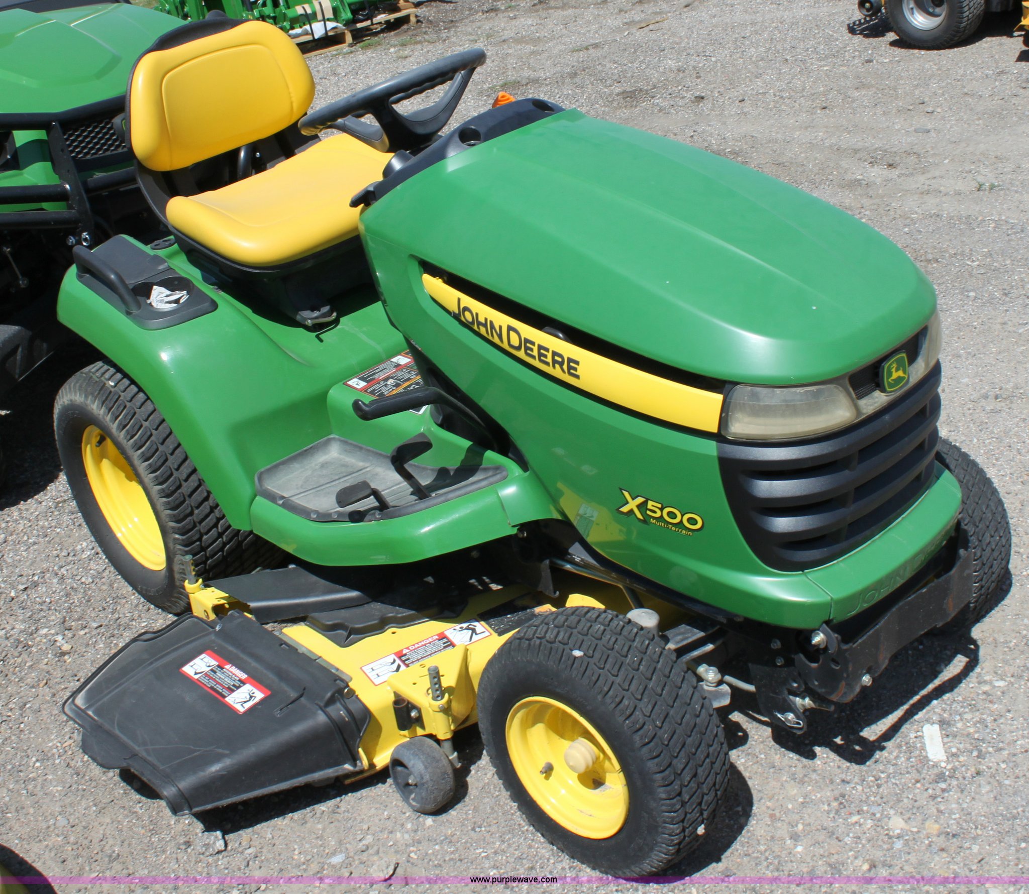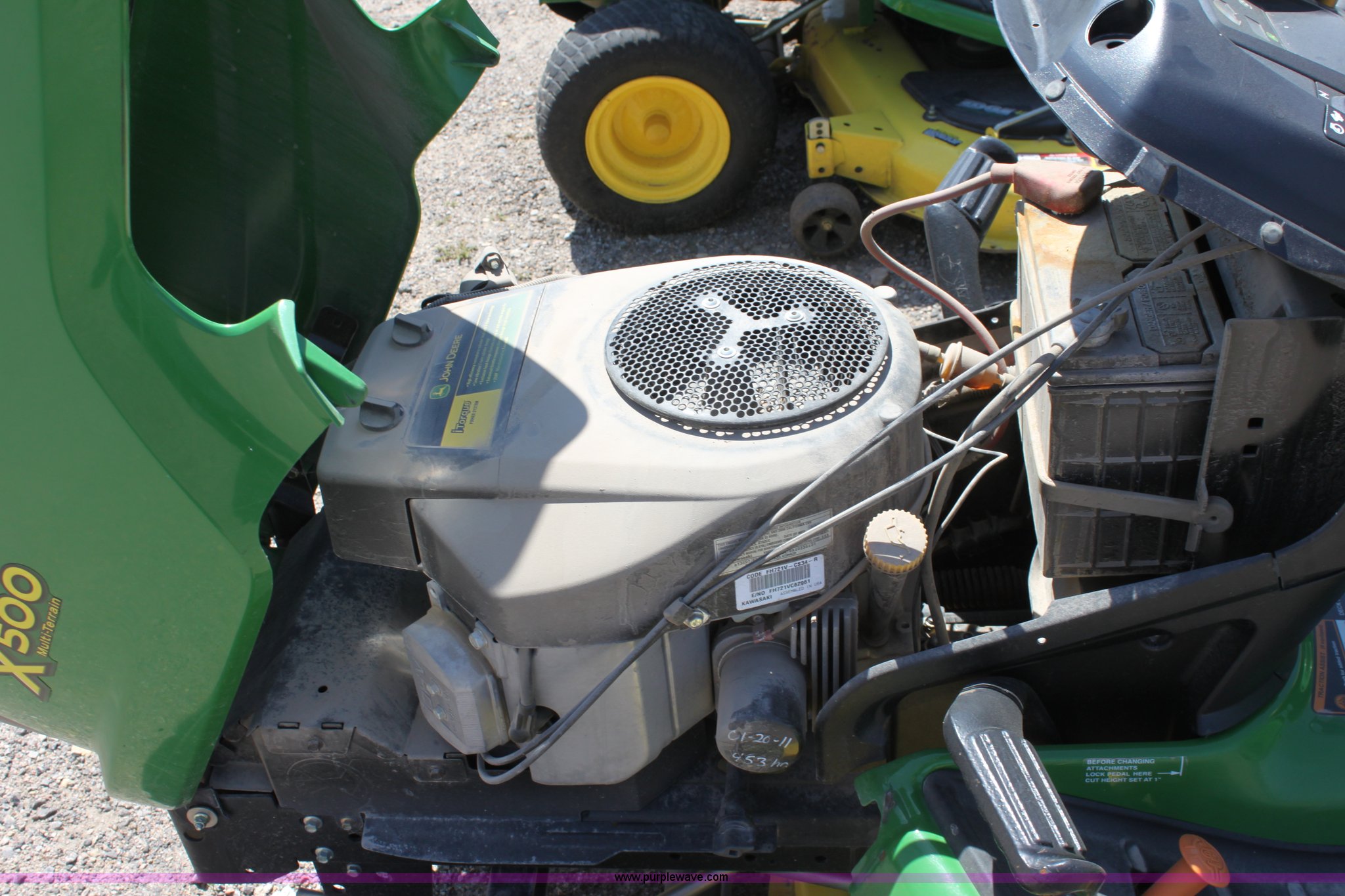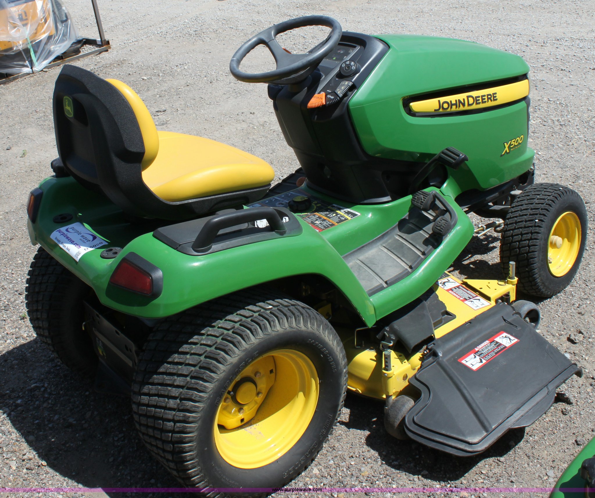 Purple Wave is selling a used Lawn Mower in Kansas. This item is a 2008 John Deere X500 mower with the following: 455 hours on meter, 48" cut, Kawasaki gas engine, Hydrostatic transmission, Deck leveling gauge, Locking differential, Hydraulic deck height adjustment, Front work lights, Cup holder, Hood is cracked, PIN M0X500A033507, Stock# 68561