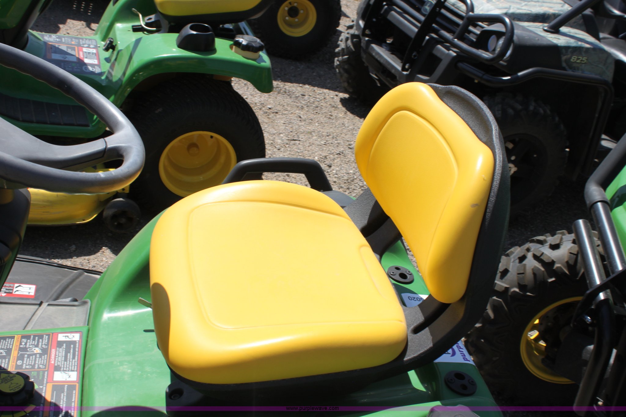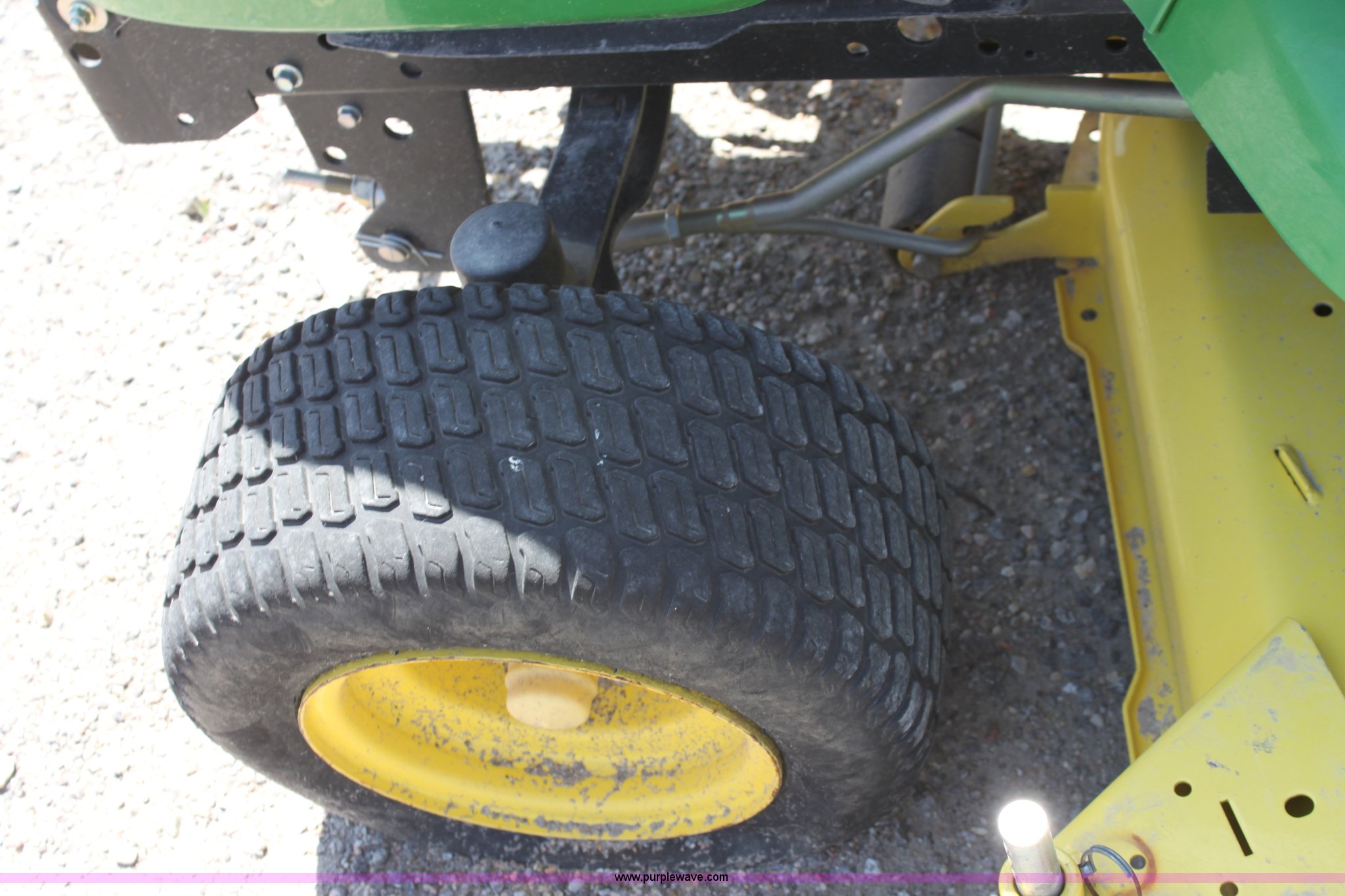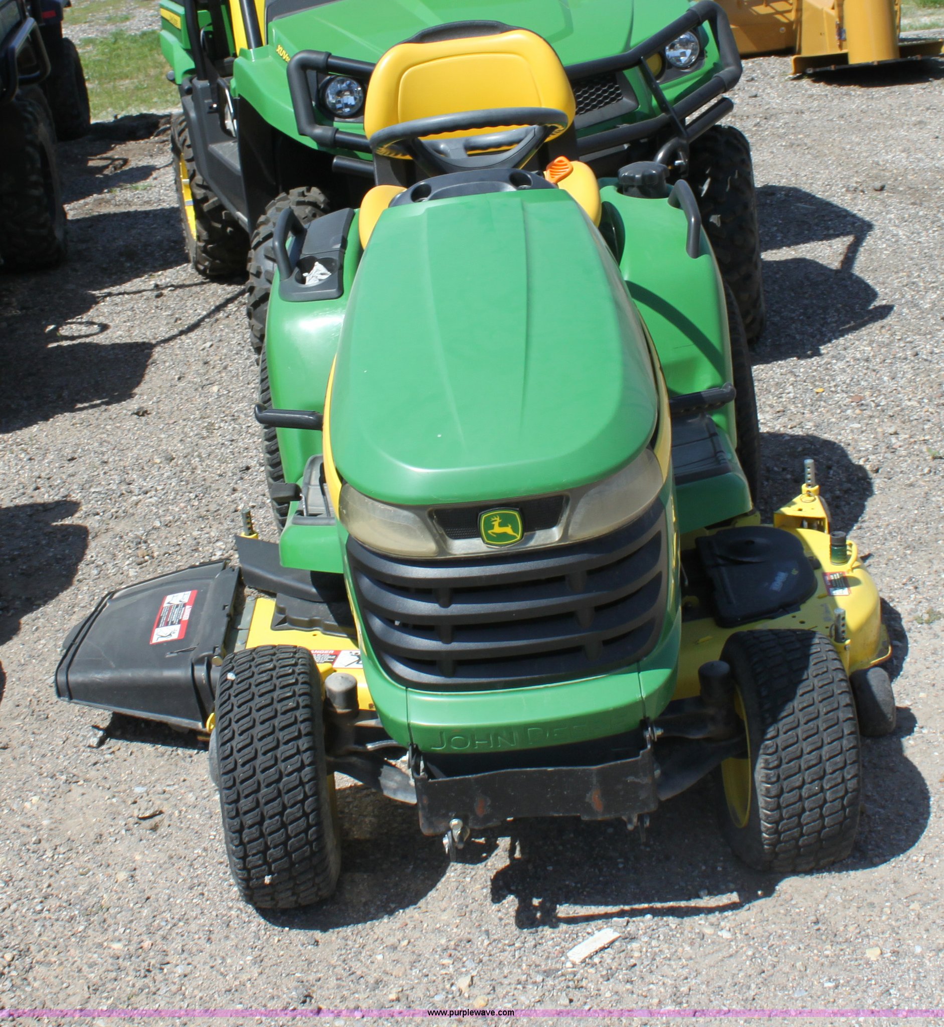 Purple Wave is selling a used Lawn Mower in Kansas. This item is a 2008 John Deere X500 mower with the following: 455 hours on meter, 48" cut, Kawasaki gas engine, Hydrostatic transmission, Deck leveling gauge, Locking differential, Hydraulic deck height adjustment, Front work lights, Cup holder, Hood is cracked, PIN M0X500A033507, Stock# 68561