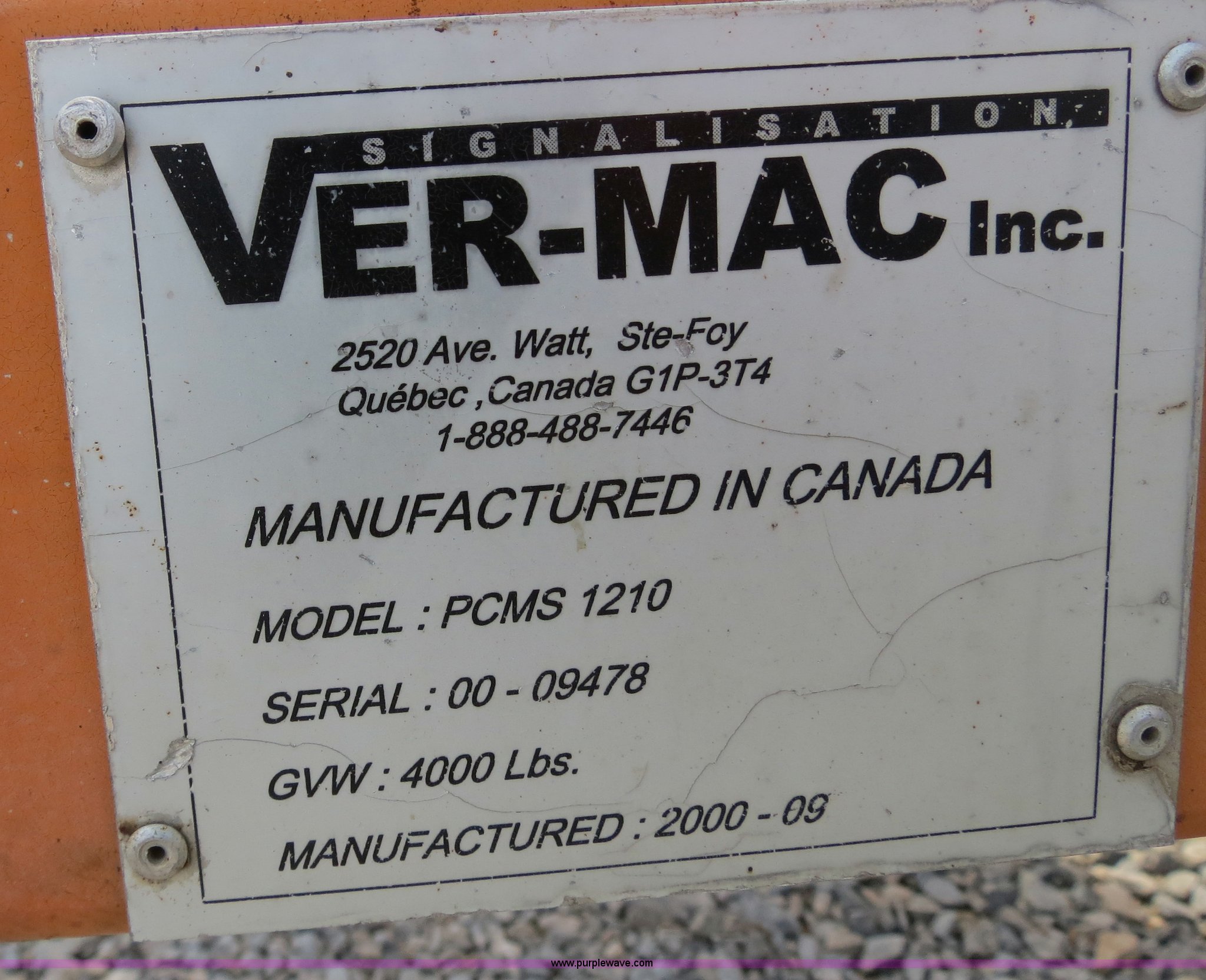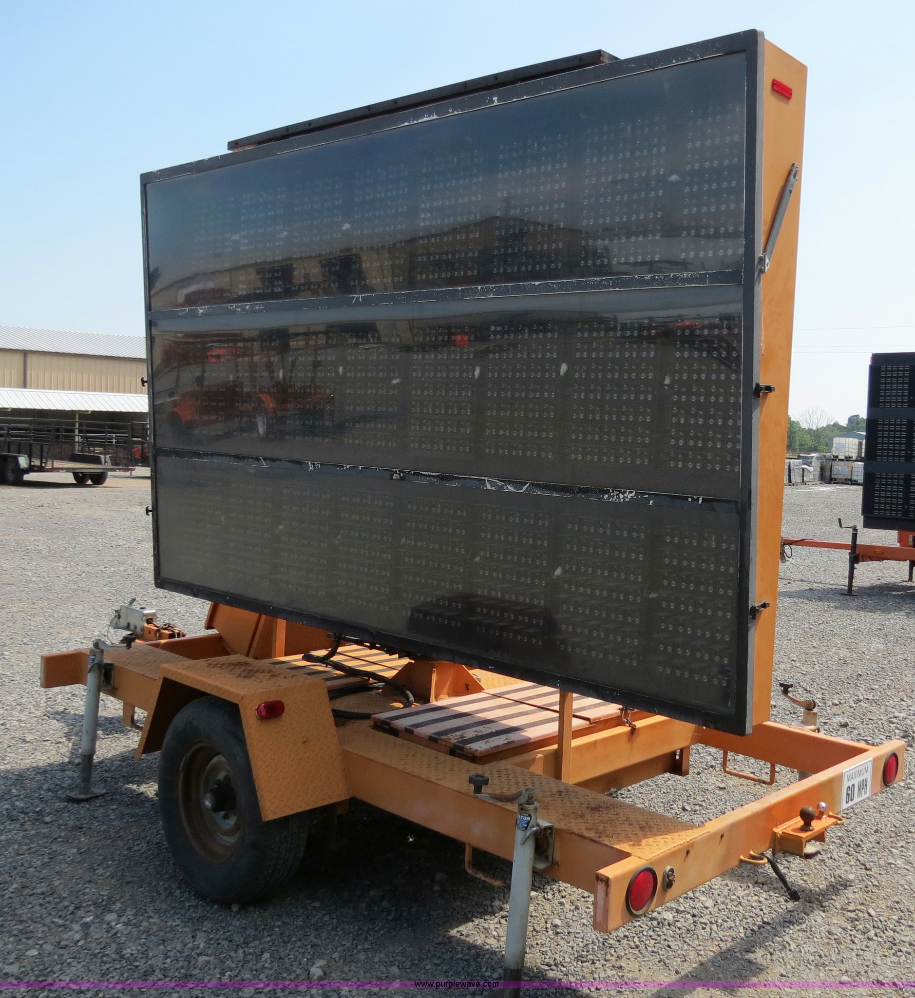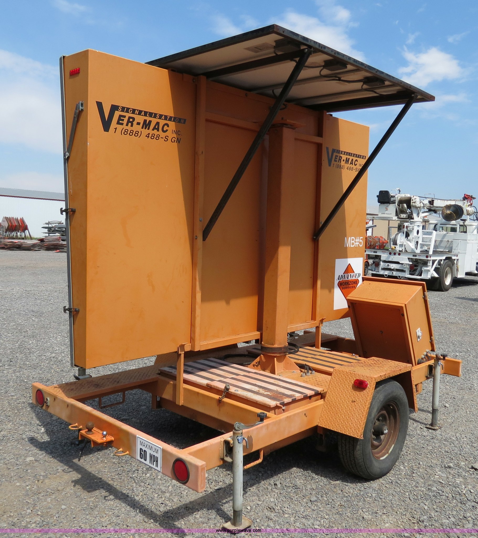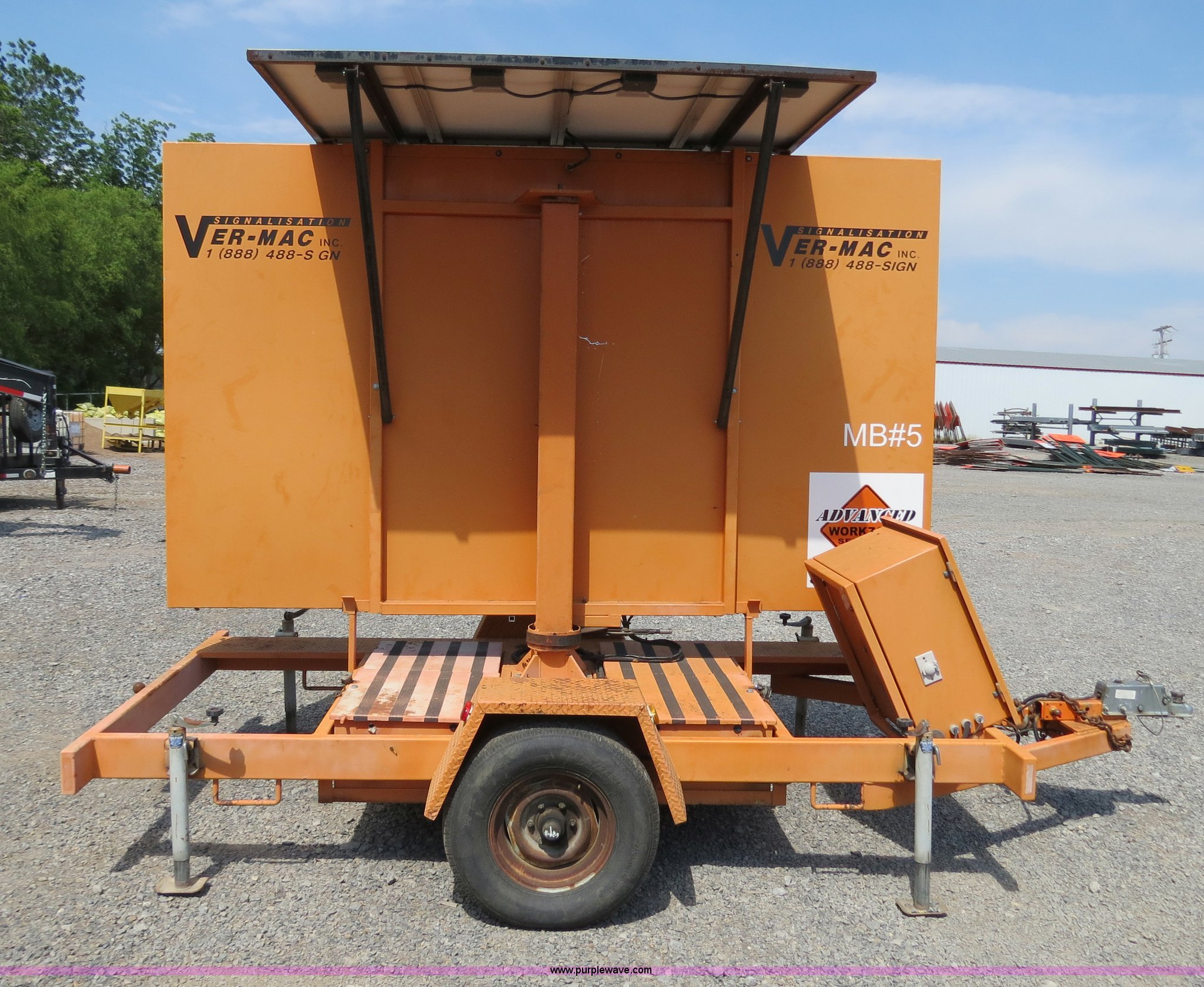 Purple Wave is selling a used Road Safety Equip. in Oklahoma. This item is a 2000 Ver-Mac PCMS-1210 portable message board with the following: 79" x 131" LED message board, 3 lines, 8 characters, Battery powered, Solar charged, (3) Siemens SP75 solar panels, Hydraulic sign lift jack, Trailer mounted, 2" ball receiver hitch, 4-pin trailer wiring, Rear ball hitches, (4) corner stabilizing jacks, Trailer lights, ST225/75R15 tires, GVWR 4,000 lbs, Serial 00-09478, MB# 5