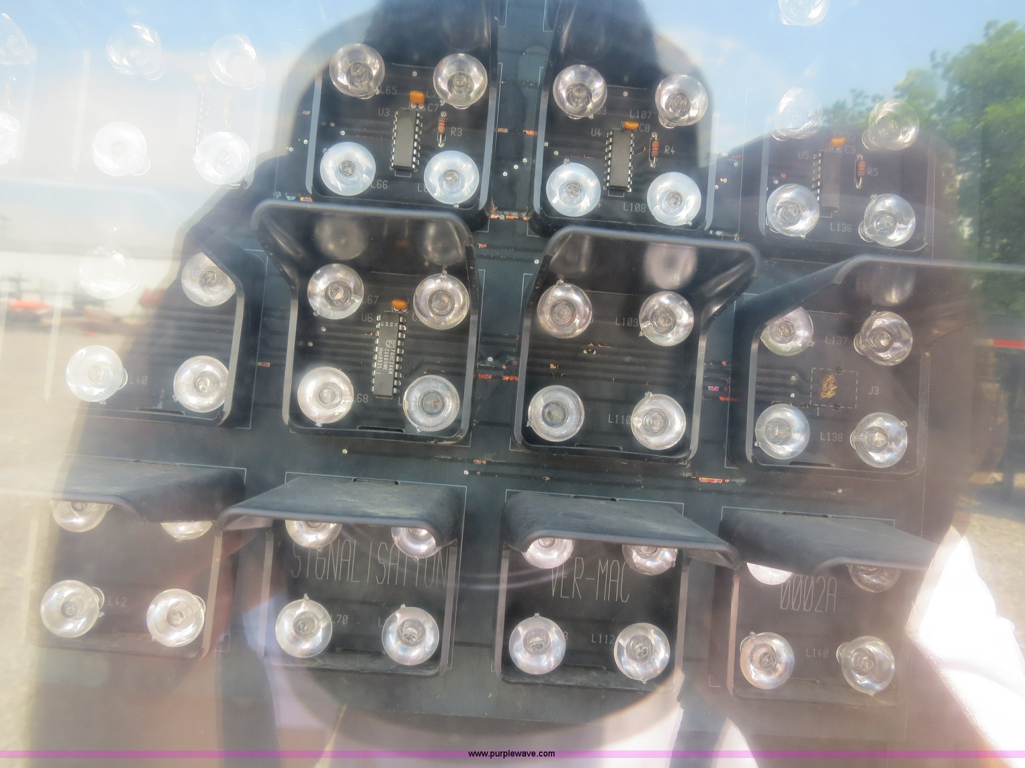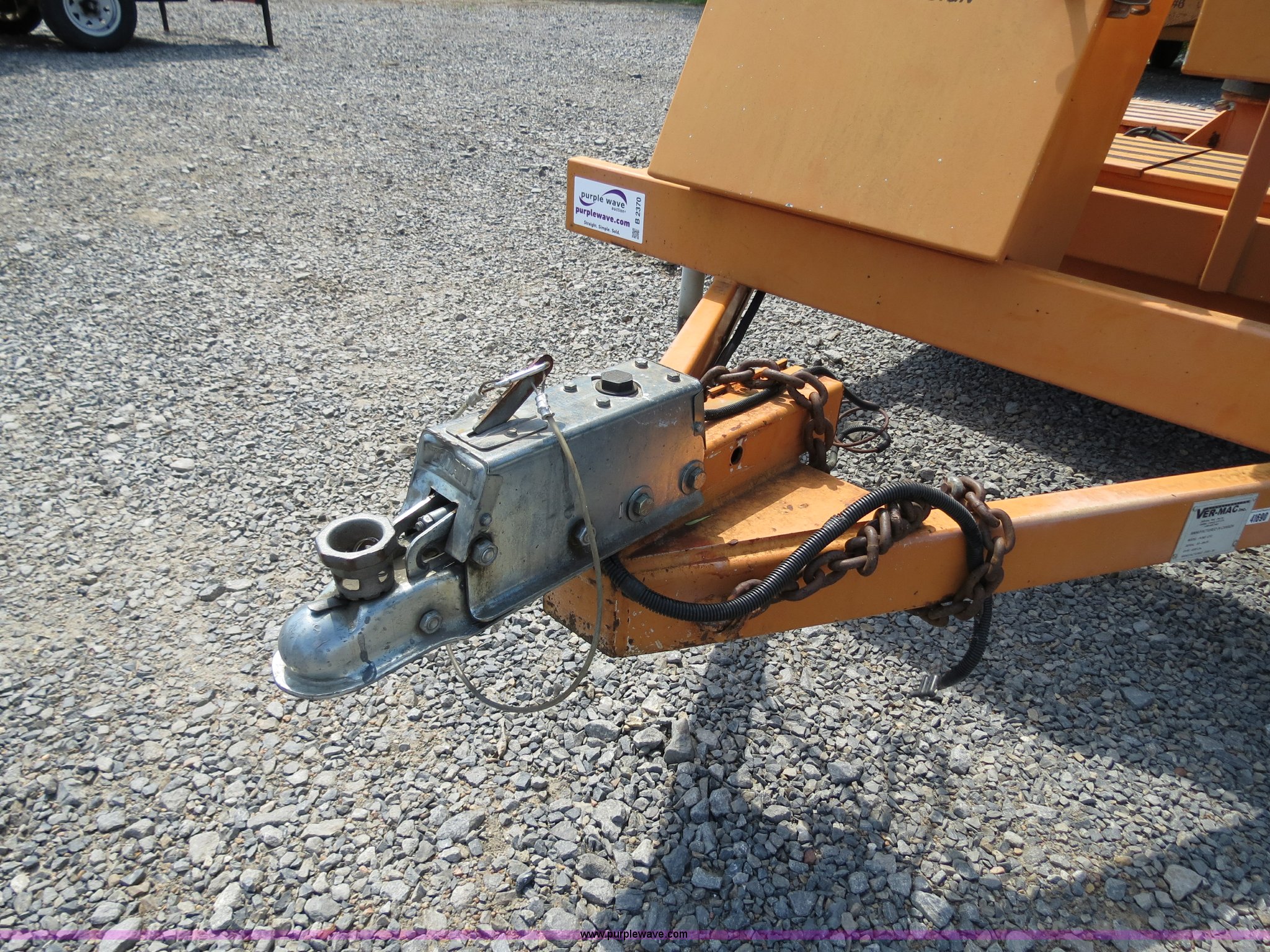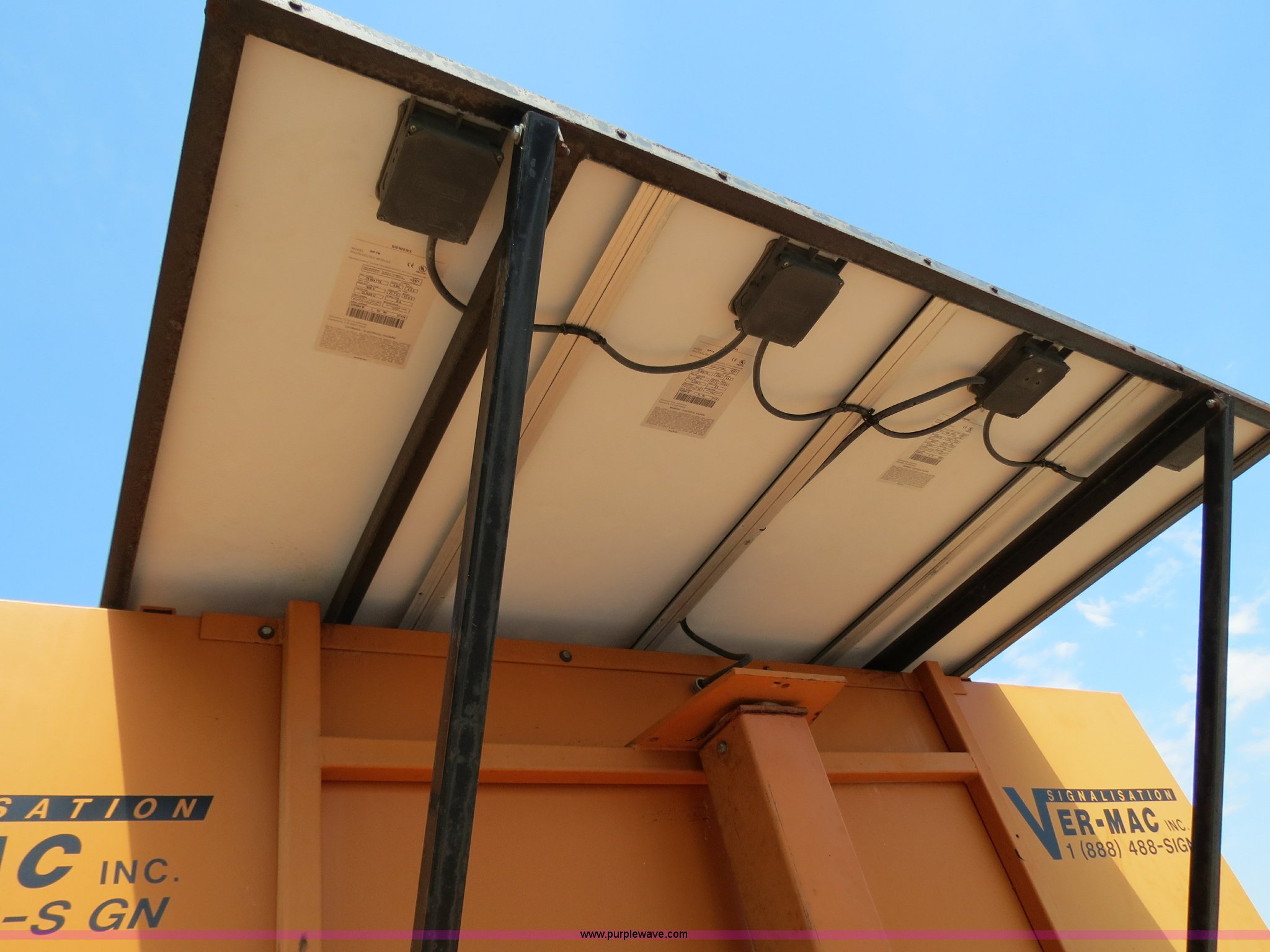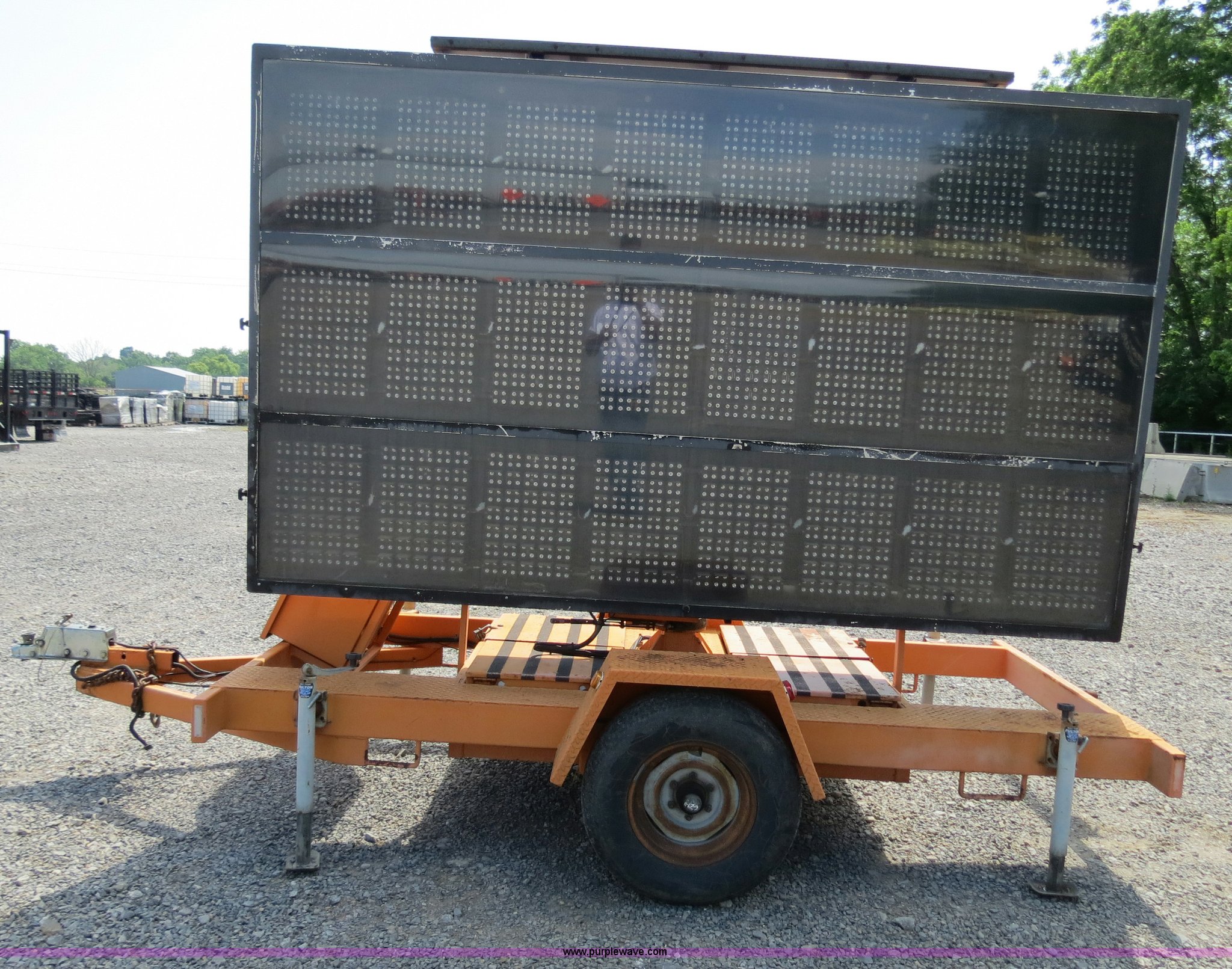 Purple Wave is selling a used Road Safety Equip. in Oklahoma. This item is a 2000 Ver-Mac PCMS-1210 portable message board with the following: 79" x 131" LED message board, 3 lines, 8 characters, Battery powered, Solar charged, (3) Siemens SP75 solar panels, Hydraulic sign lift jack, Trailer mounted, 2" ball receiver hitch, 4-pin trailer wiring, Rear ball hitches, (4) corner stabilizing jacks, Trailer lights, ST225/75R15 tires, GVWR 4,000 lbs, Serial 00-09478, MB# 5