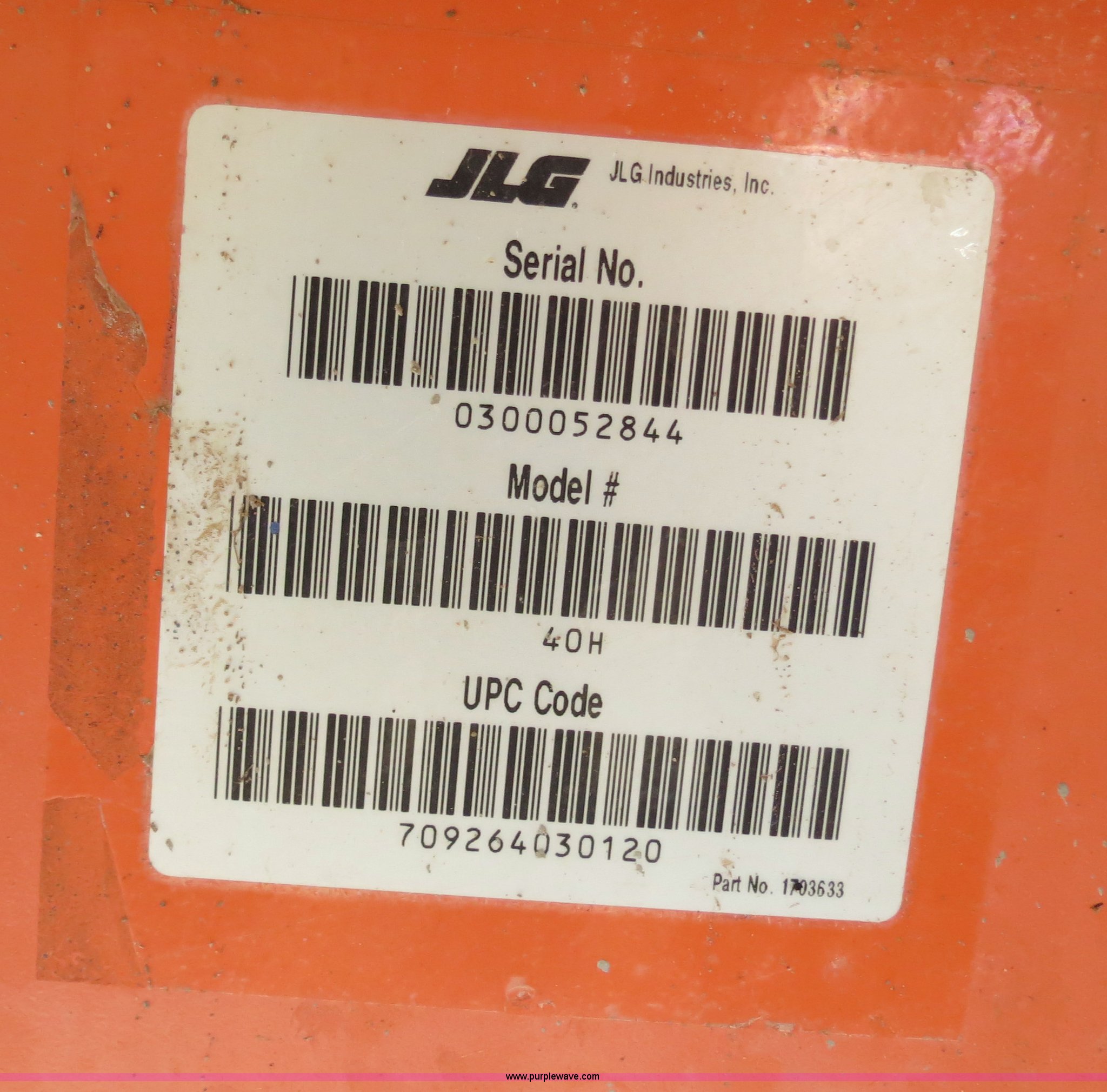 Purple Wave is selling a used Boom Lift in Oklahoma. This item is a 2000 JLG 40H boom lift with the following: 3,168 hours on meter, Ford four cylinder gas/LP engine, Model LRG-425I-6005-A, Serial 67761-1-03-00, 6' platform, 1,000 lb maximum capacity, 40' maximum platform height, 33' horizontal reach, Foot control, 12.5L-15SL tires, Needs new battery, Serial 300052844