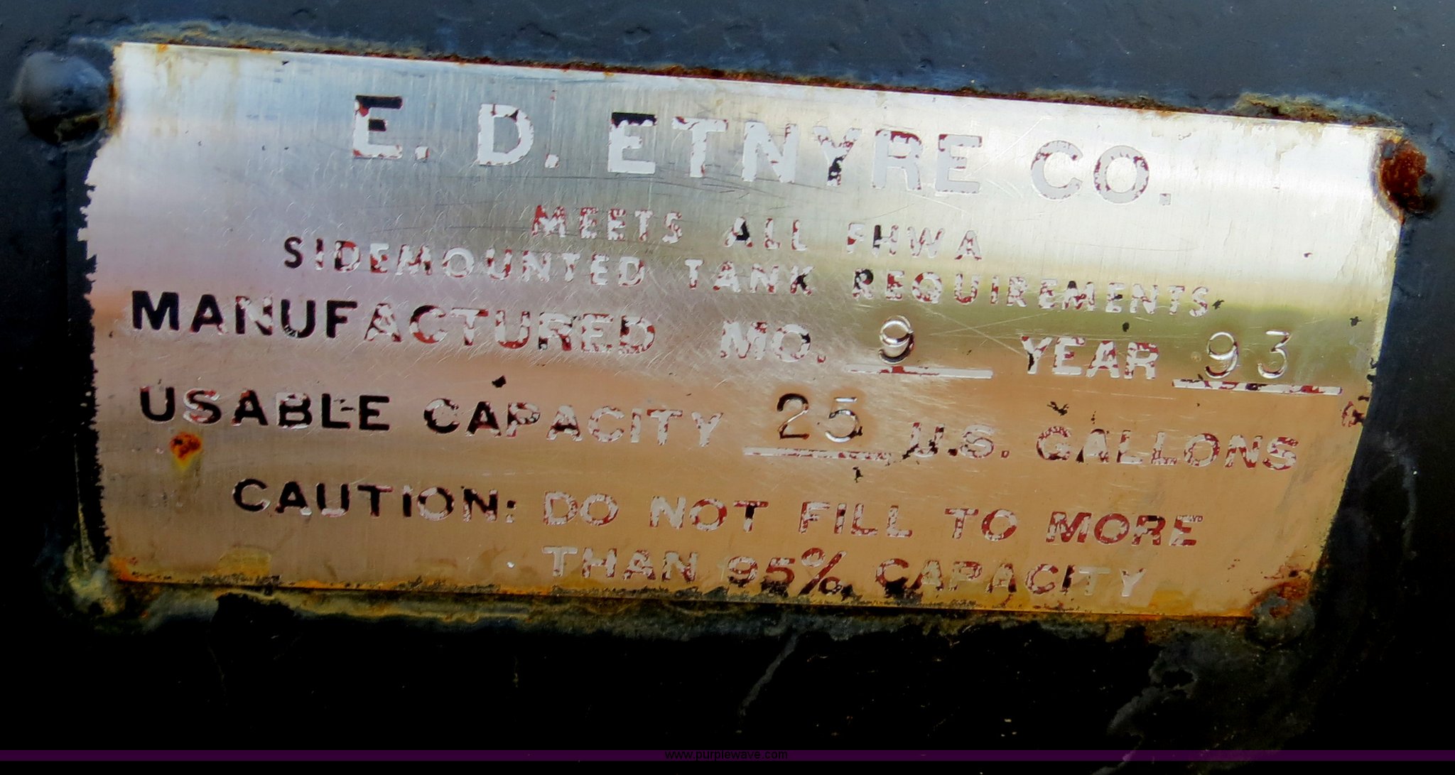 Purple Wave is selling a used Oil Distributor Truck in Oklahoma. This item is a 1994 Ford F700 asphalt distributor truck with the following: 156,026 miles on odometer, 1,285 hours on meter, Cummins 5.9L six cylinder diesel engine, 5+2 manual transmission, AC and heat, AC inoperable, AM/FM/Cassette, Spring suspension, Air brakes, 50 gallon fuel tank, Etnyre S-2000 blacktopper, 2,000 gallon tank capacity, Cab mounted control box, Rear control box, 10'W spray bar, Hydraulic lift, Hydraulic spray bar side shift, Serial S-1189, 11R22.5 tires, GVWR 33,000 lbs, FAWR 12,000 lbs, RAWR 21,000 lbs