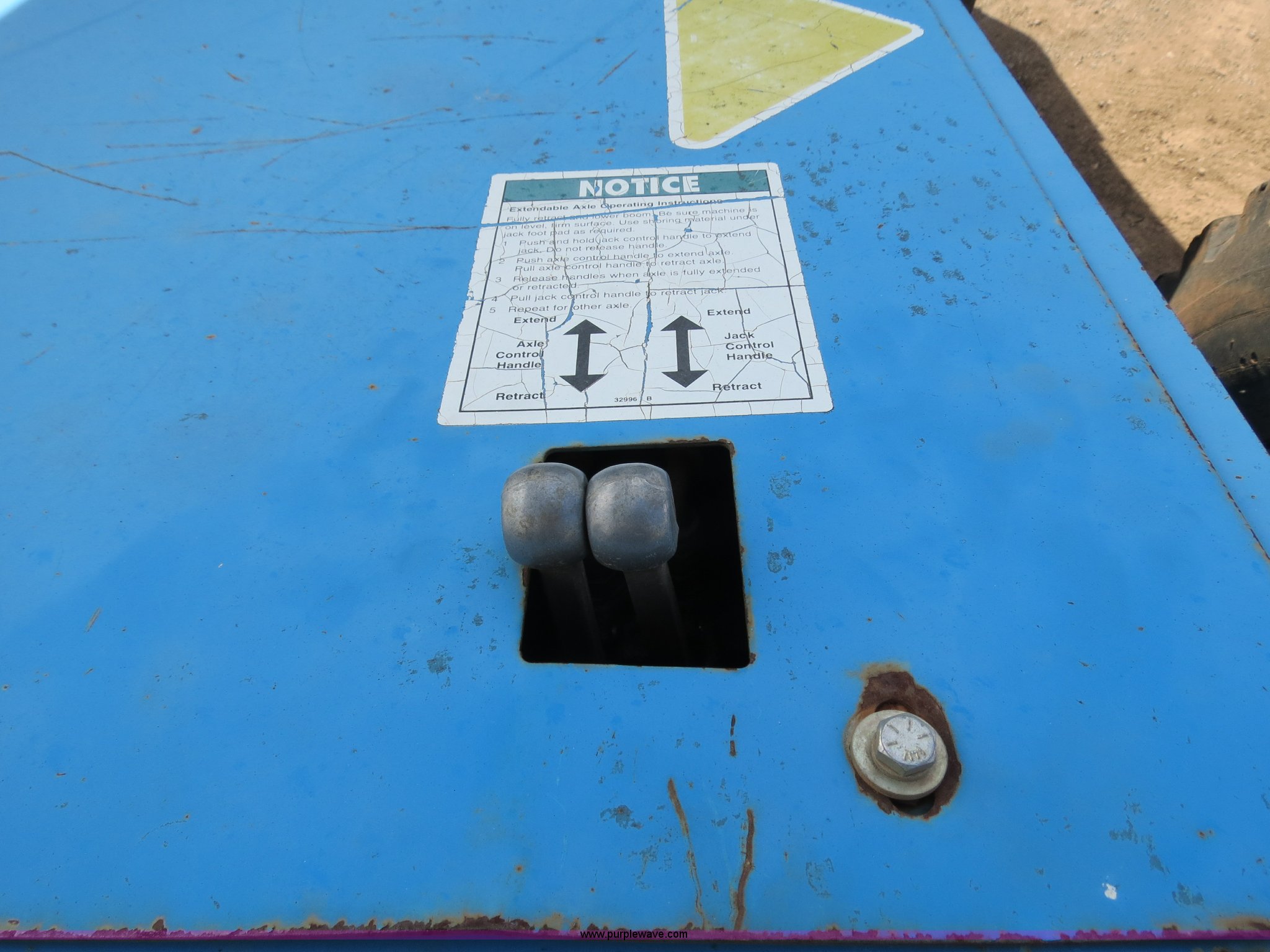 Purple Wave is selling a used Boom Lift in Oklahoma. This item is a 1999 Genie S85 boom lift with the following: 5,003 hours on meter, Duetz four cylinder diesel engine, 74 HP, Self-propelled, Four wheel drive, 85' maximum platform height, 76.4' maximum horizontal reach, 6' jib boom, 6'L basket, 500 lb lift capacity, 360 degree turn table, 160 degree platform rotation, Extendable front and rear axles, Front and rear hydraulic lift jack, Foot control, 15-22.5 tires, 35,680 lbs. base operating weight, Serial 1208