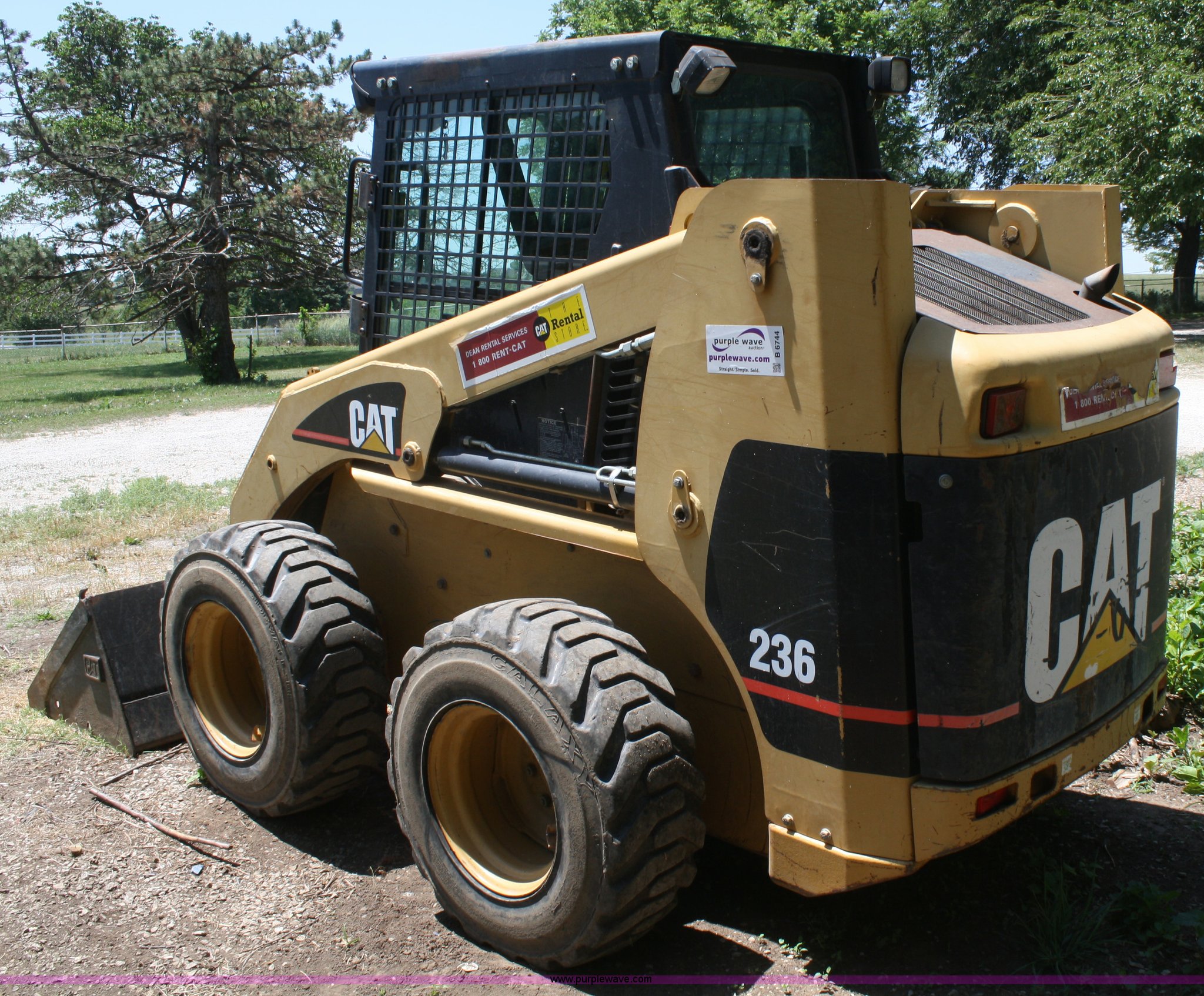 Purple Wave is selling a used Skid Steer Loader in Kansas. This item is a 2001 Caterpillar 236 skid steer with the following: 1,077 hours on meter, Caterpillar 3034 four cylinder diesel engine, 64 HP, Enclosed cab, Heat, Auxiliary hydraulics, 72" bucket, 0.57 cu. yd. capacity, 1,750 lb lift capacity, 6,860 lbs. base operating weight, 12-16.5 tires, Serial 4YZ02500