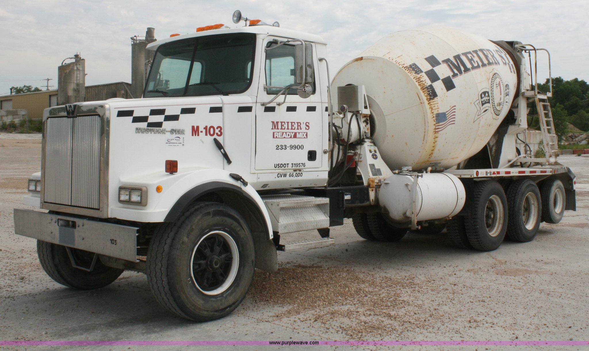 Purple Wave is selling a used Ready Mix or Pump Truck in Kansas. This item is a 2000 Western Star 4864FX concrete mixer truck with the following: 185,250 miles on odometer, Cummins ISM 10.8L L6 turbo diesel engine, 335 HP, Eaton Fuller nine speed manual transmission, Lo and Lo-Lo gears, Full screw, Heat, Cruise, Air suspension seat, Exterior visor, Block heater, 47 gallon fuel tank, CBMW 10.5 cu. yd. mixer, Serial 90A6102758, 125 gallon water tank, (3) 4' chute extensions, Engine driven hydraulic pump, Beam suspension, Air brakes, Jake brakes, 13,000 lb air up/down tag axle with adjustable load valve, 425/65R22.5 front tires, 11R24.5 rear tires, 10R17.5 tag axle tires, GVWR 62,000 lbs, FAWR 16,000 lbs, IAWR 23,000 lbs, RAWR 23,000 lbs, Unit# M103