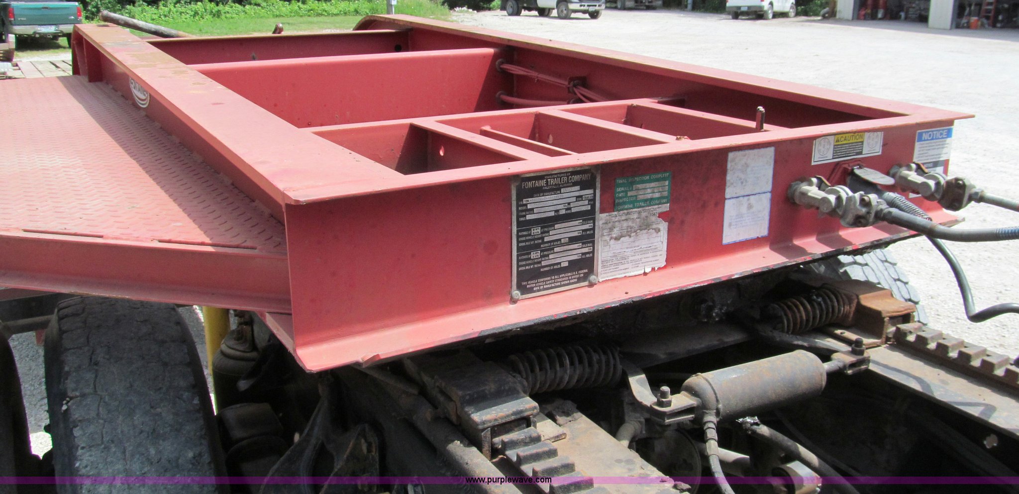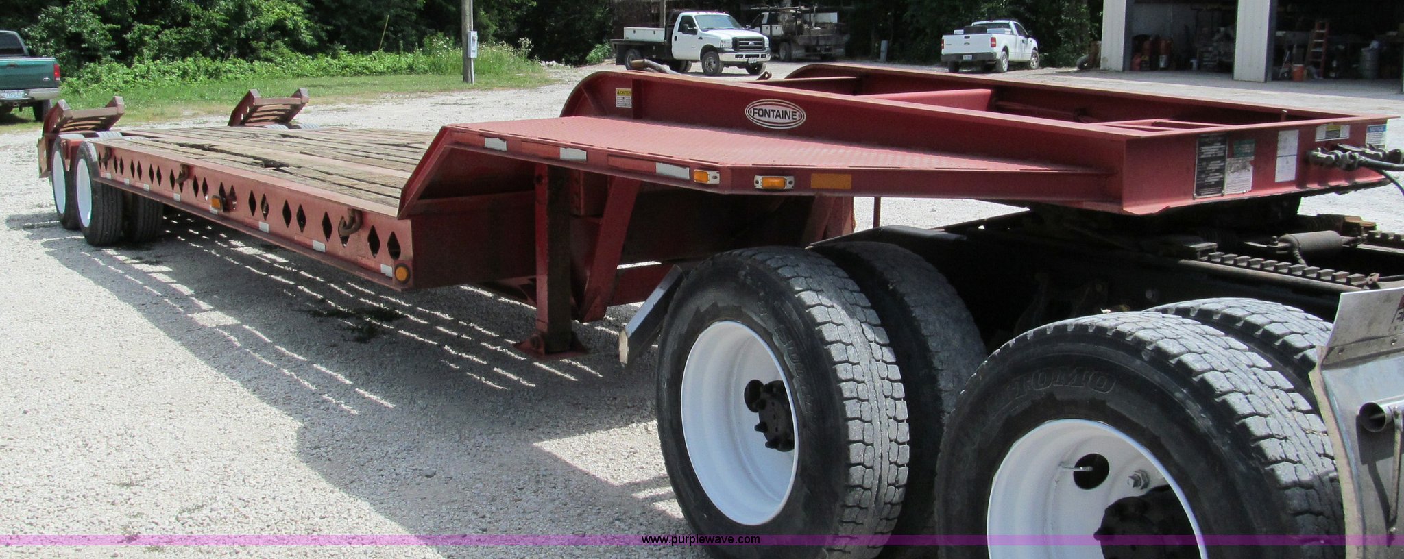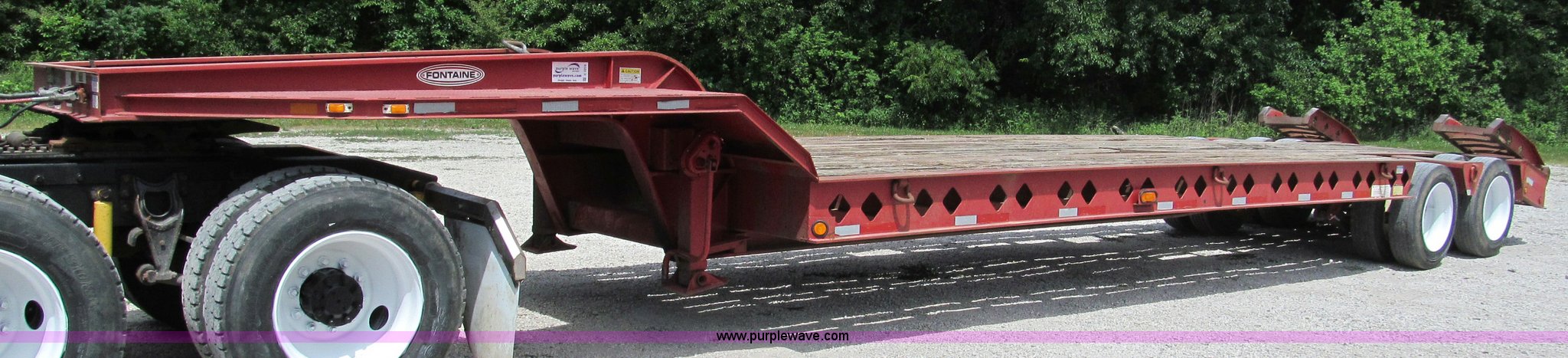 Purple Wave is selling a used Equip. Trailer in Missouri. This item is a 2004 Fontaine lowboy trailer with the following: 29' flat, 10' top deck, 28" dovetail, 102"W, (2) fold down ramps, 4.5'L x 22"W, D-rings on each side, Front chain storage, Two speed landing gear, Air brakes, Spring suspension, Frame rating 70,000 lbs, Dual 20,000 lb axles, Model FLT-735H8TW, Truck not included