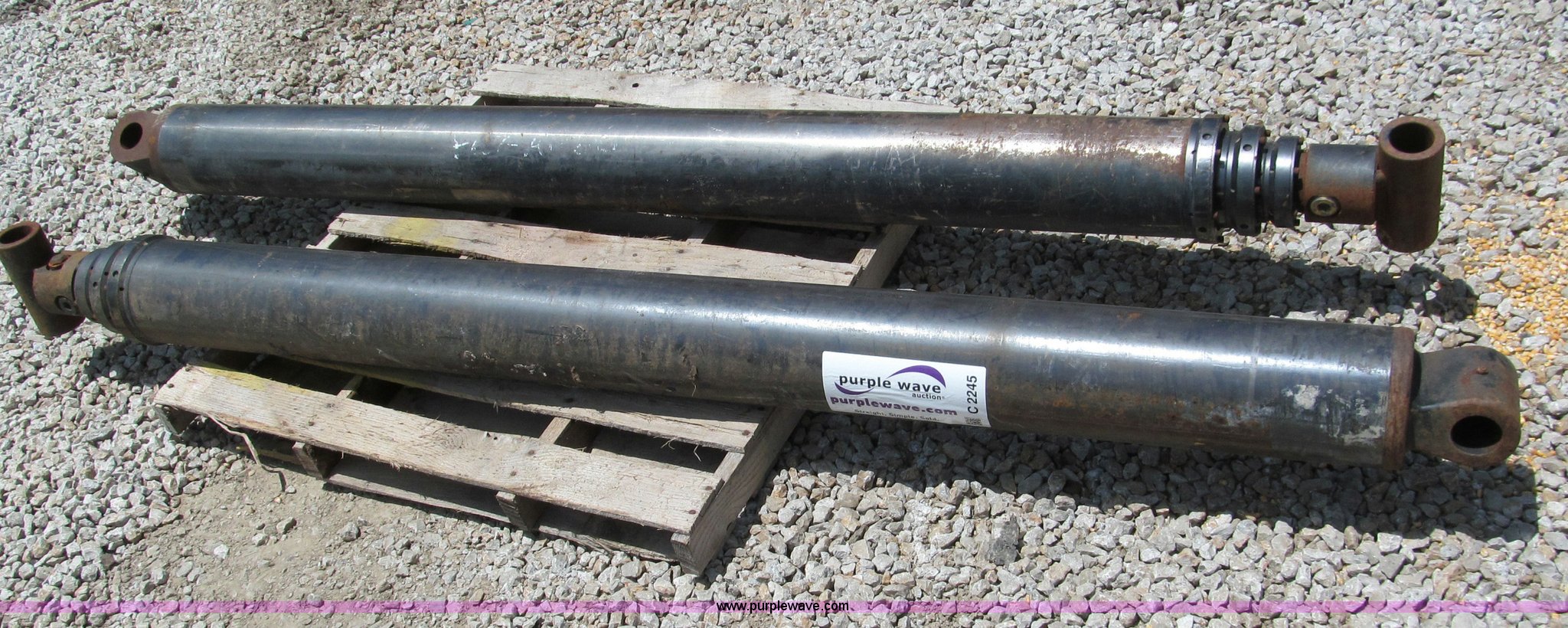 Purple Wave is selling a used Tools in Missouri. This item is a (2) three stage hydraulic lift cylinders with the following: 7'L compressed, Approx. 18'L when extended, 6" diameter, 2" diameter pin hole, Dual acting