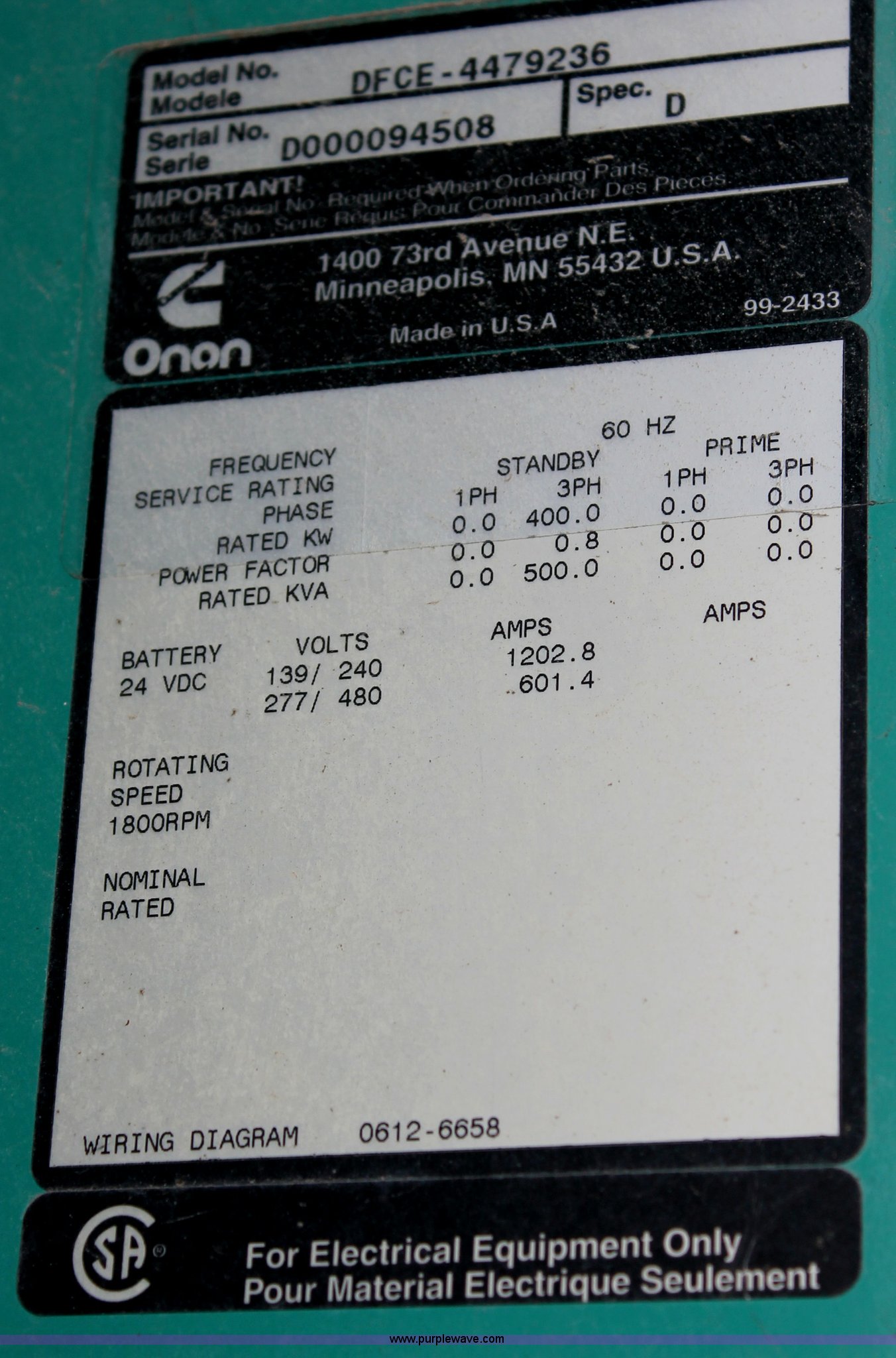 Onan DFCE generator. 2,600 hours on meter, Cummins NTA855-G5 14.0L I6 turbo diesel engine 605 HP, Serial 30364242, 156"L x 56"W x 108"H, 400 KW, 500 KVA, 480/277V, 60 Hz, 1,800 RPM, Three phase, PowerCommand with AmpSentry Protection control system, Skid mounted, Serial D000094508. Shipping quotes available. American Catastrophe. 13850 Wyandotte St. Kansas City, MO 64145