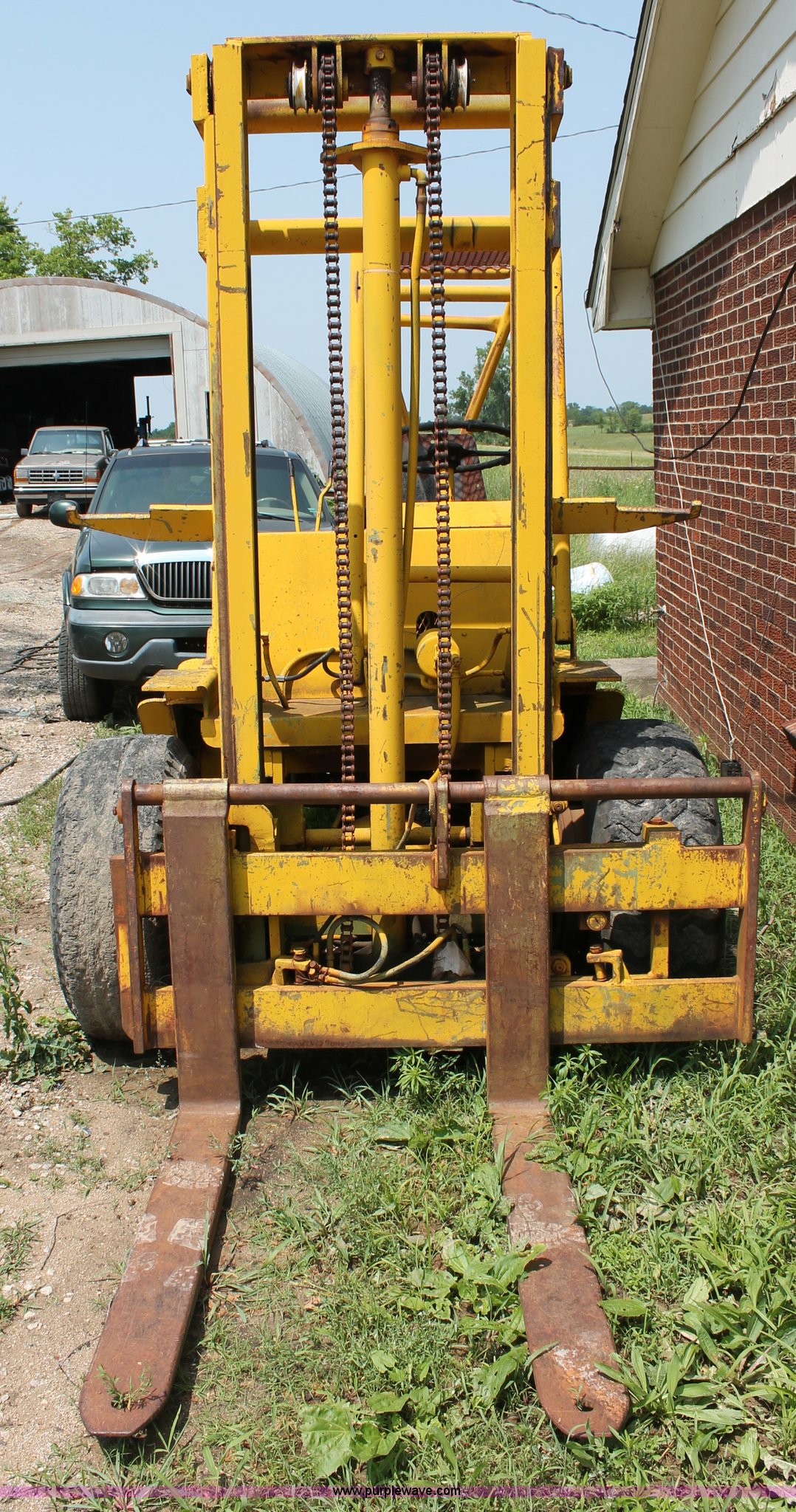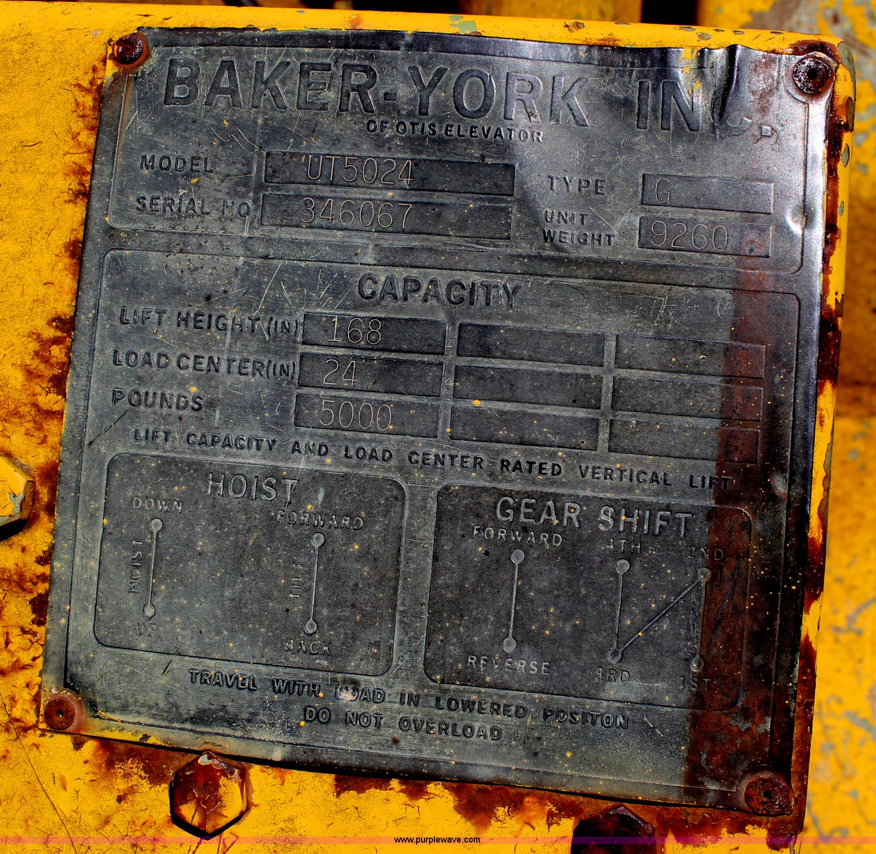 Purple Wave is selling a used Cushion Tire or Pneumatic Forklift in Missouri. This item is a Baker-york VT5024 forklift with the following: Canopy, 5,000 lb lift capacity, 168" lift height, 48" forks, 9,260 lbs. base operating weight, Solid tires, Serial 346067