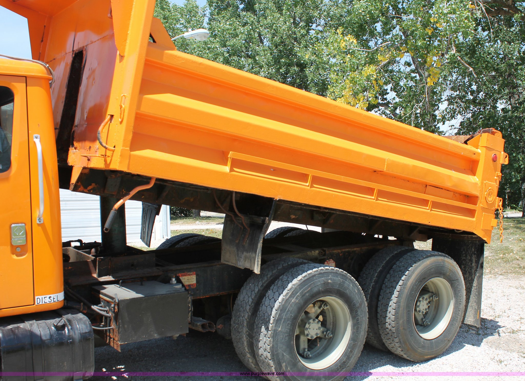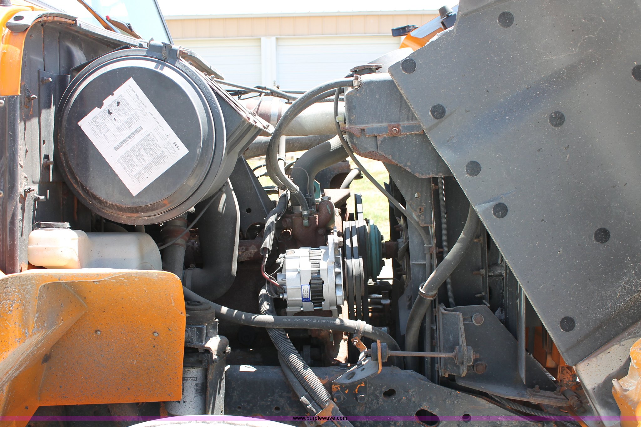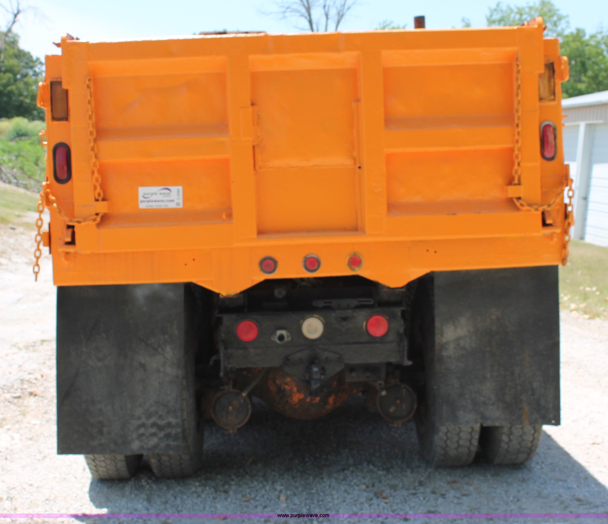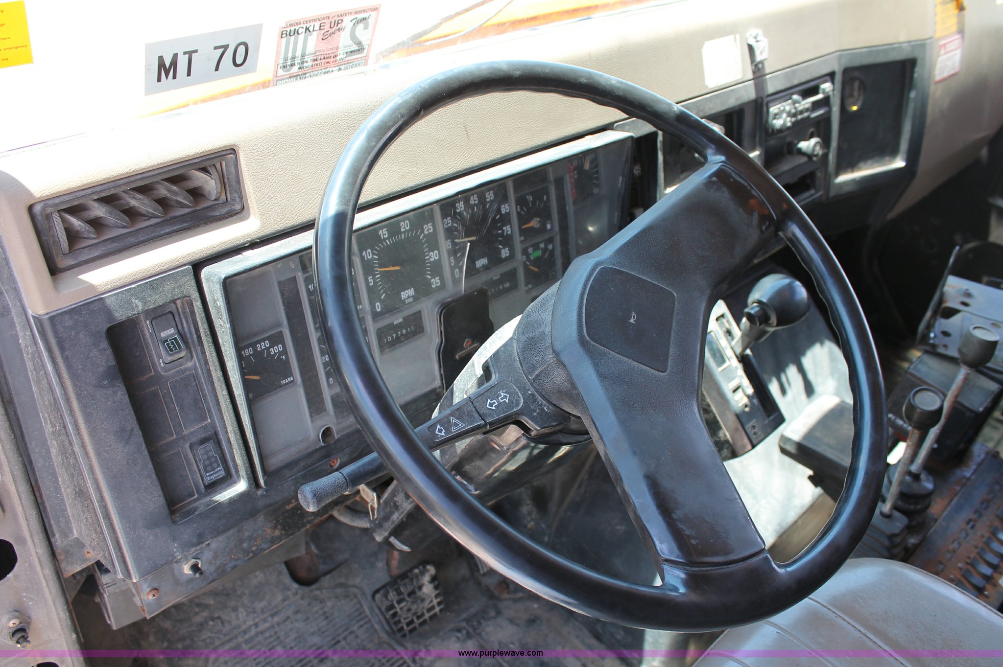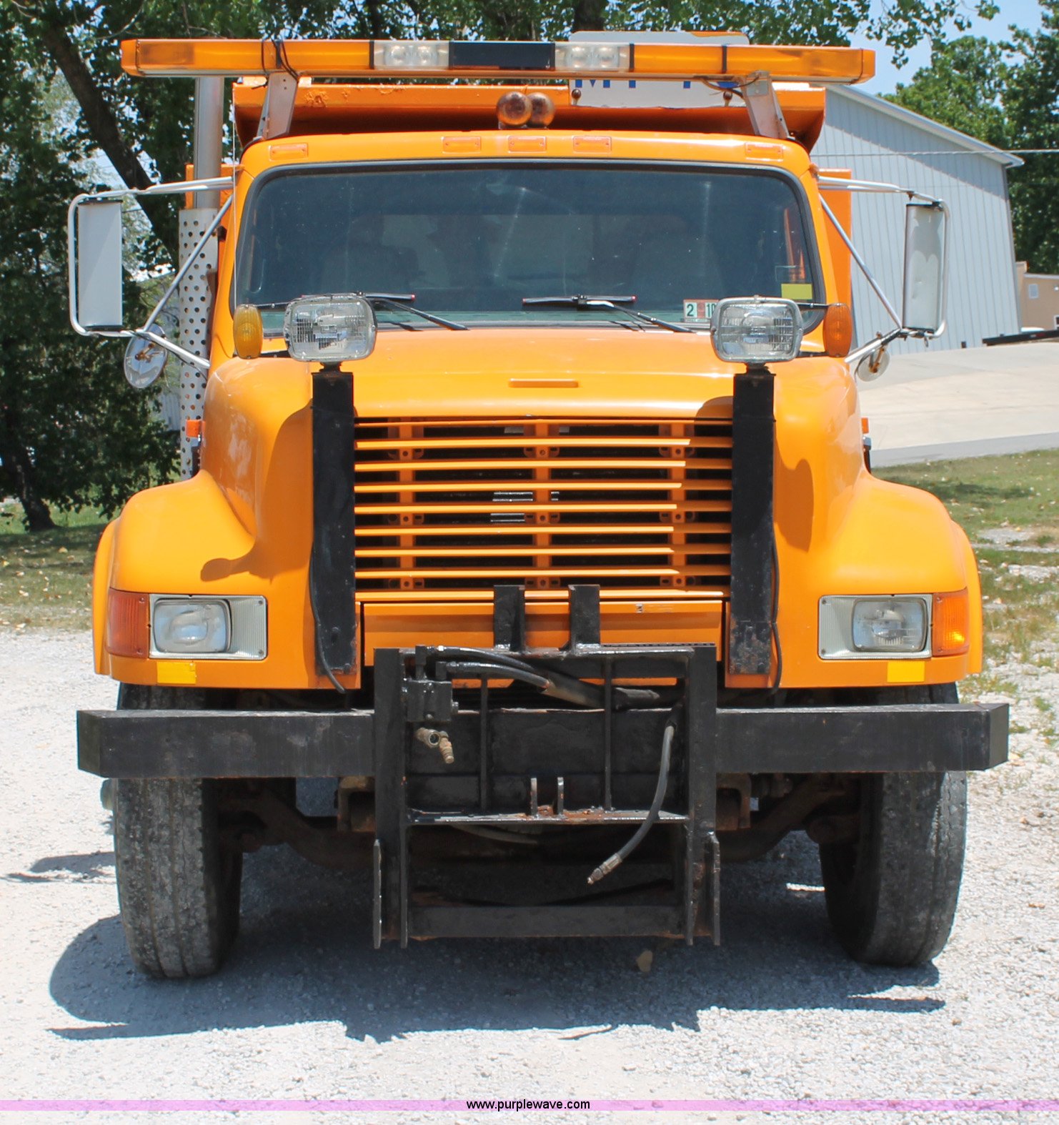 Purple Wave is selling a used Construction Dump Truck in Missouri. This item is a 1993 International 4900 dump truck with the following: 157,155 miles on odometer, 7.6L L6 turbo diesel engine, 460 HP, Allison automatic transmission, Twin screw, Differential lock, Heat, Cruise, AM/FM/Cassette, Air suspension seat, Heated mirrors, Air horn, In-cab snow plow controls, Roof-mounted warning beacons, Block heater, Trailer wiring, Pintle hitch, 14' dump bed, Manual end gate, Single ram, Dual fuel tanks, 30 and 50 gallon, Hendrickson suspension, Front hydraulics snow plow setup, Rear hydraulics spreader setup, Single exhaust stack, PTO, Air brakes, 170" wheelbase, 11R22.5 tires, GVWR 52,000 lbs, FAWR 12,000 lbs, IAWR 20,000 lbs, RAWR 20,000 lbs, Recently replaced alternator, Hydraulic leak