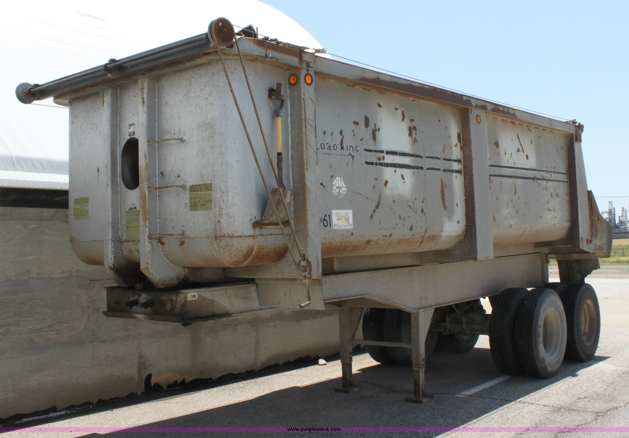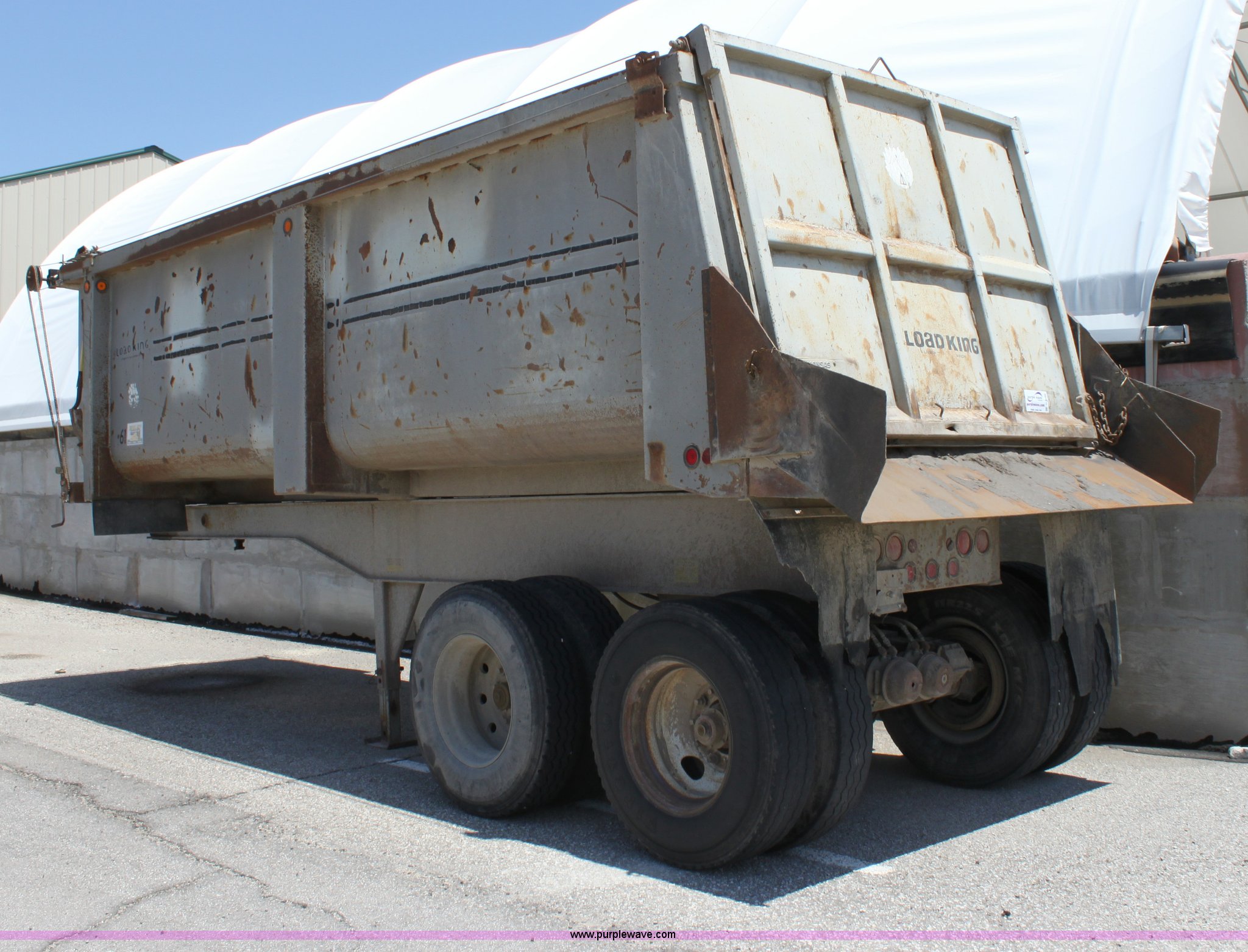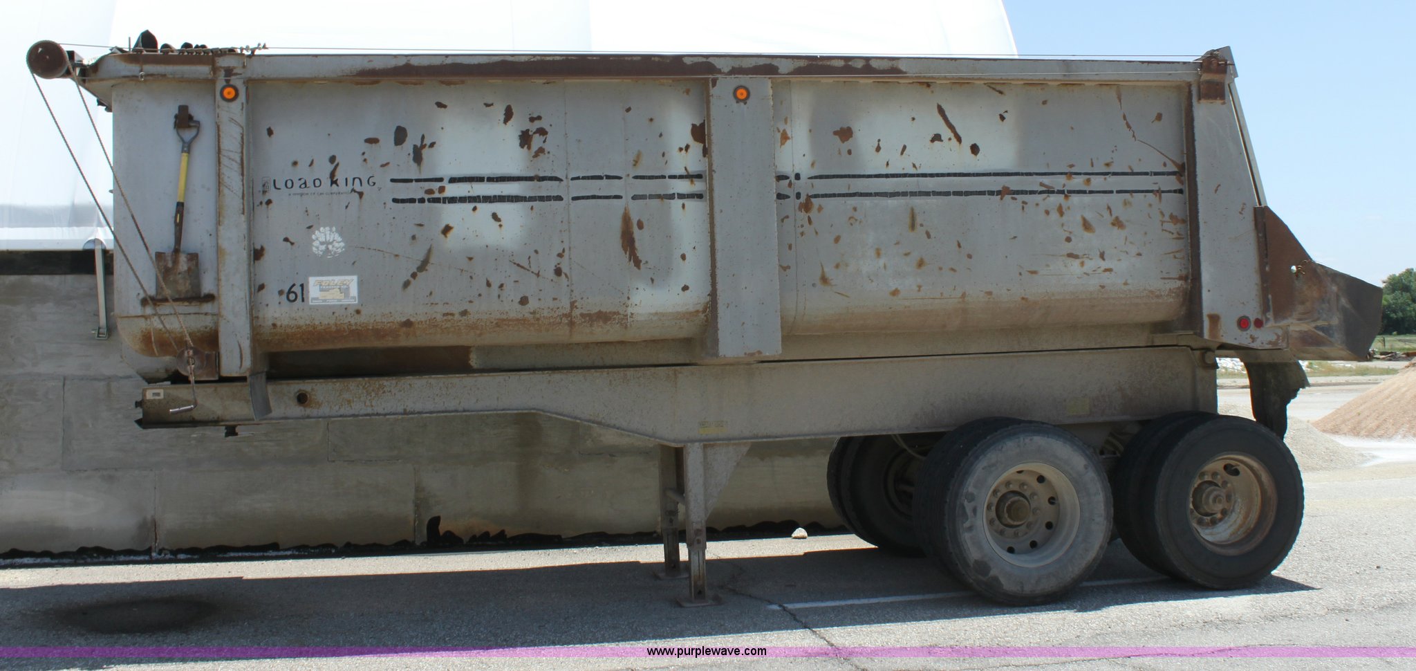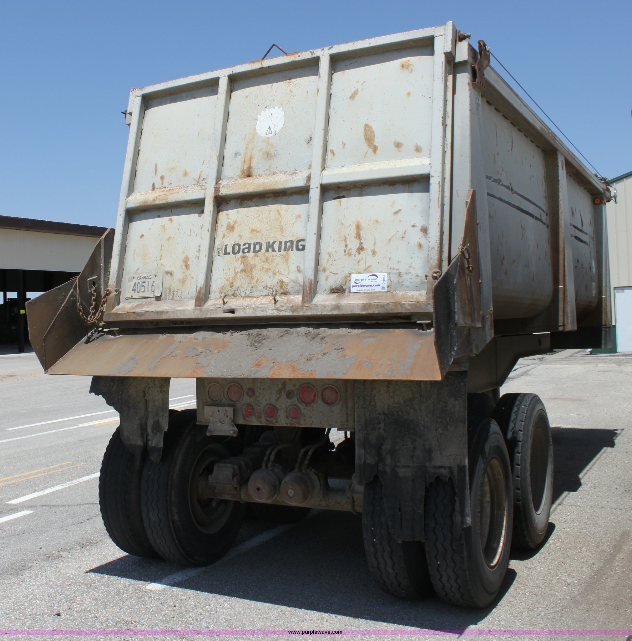 Purple Wave is selling a used End Dump Rock Trailer in Kansas. This item is a 1993 Load King 20' tandem axle dump trailer with the following: 60" side walls, Four stage single mast, Manual rollover tarp, Tarp missing, Air brakes, Watson Chalin 44,000 lb spring suspension, Air end gate, 11R22.5 tires, Unit# 61