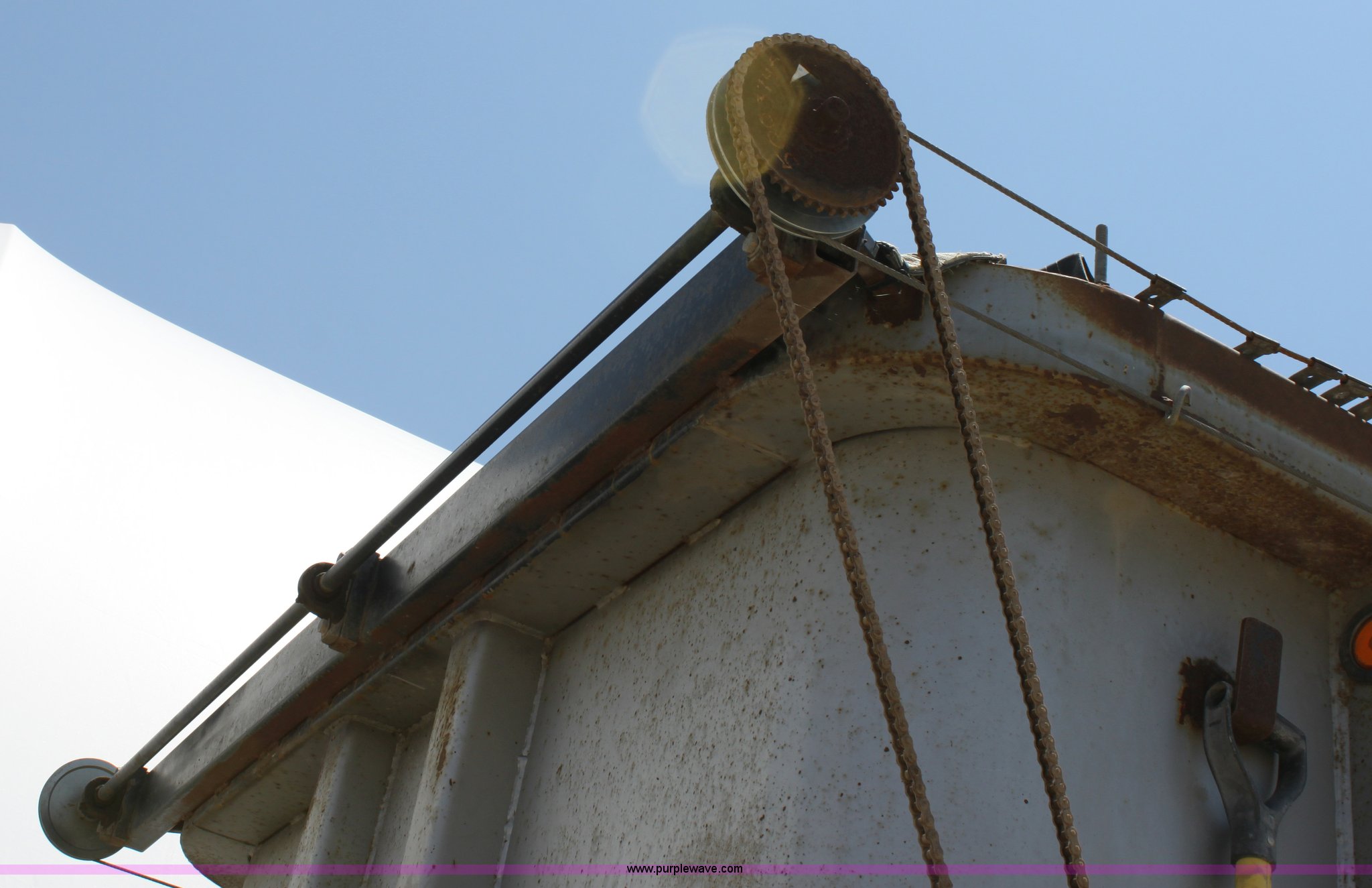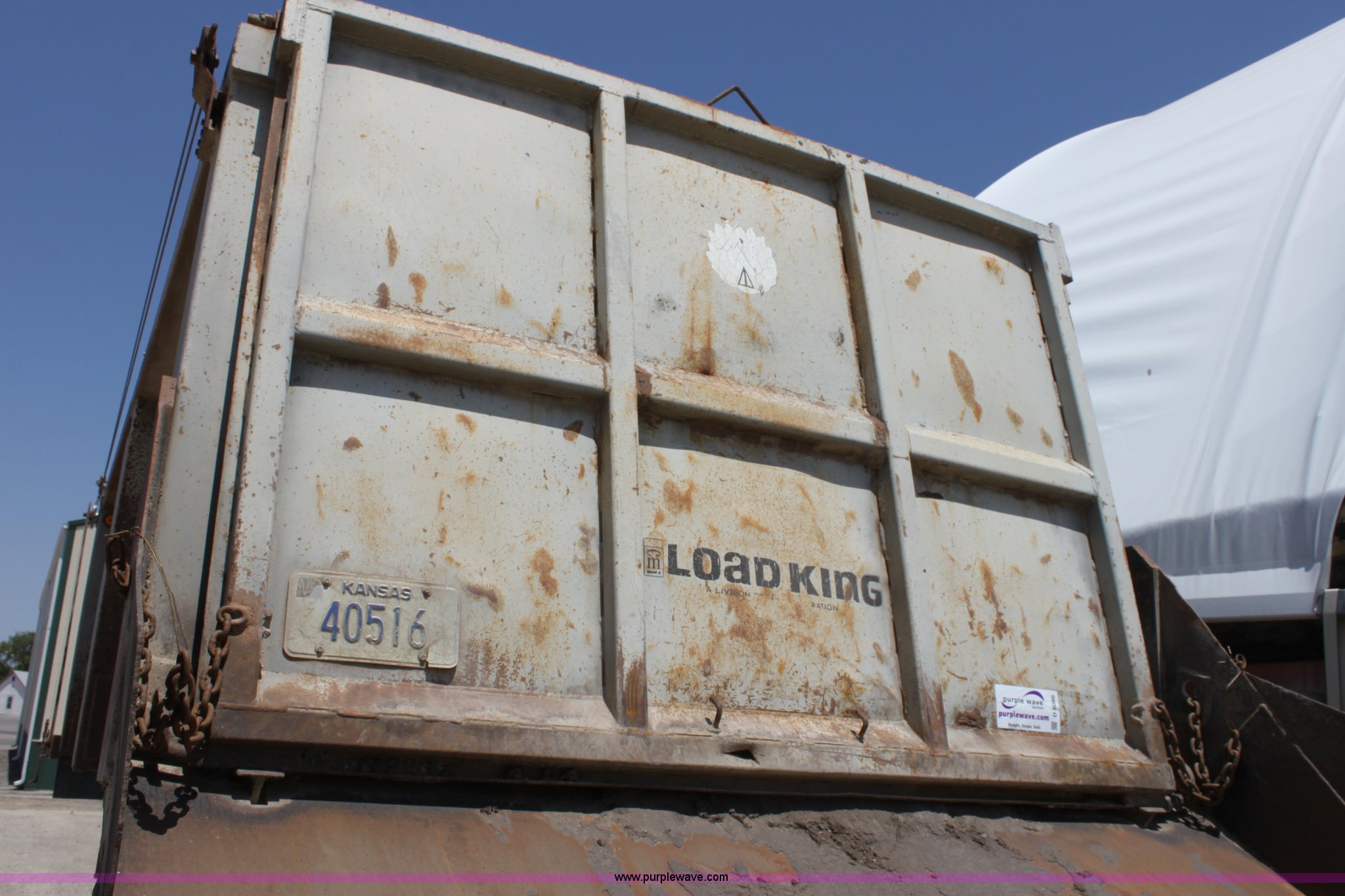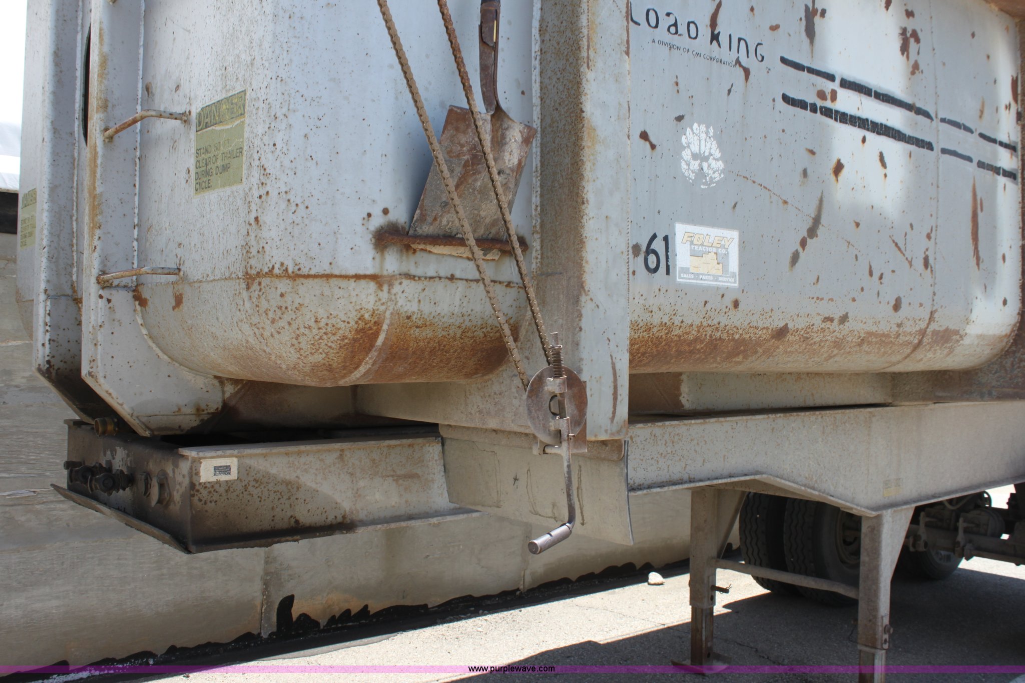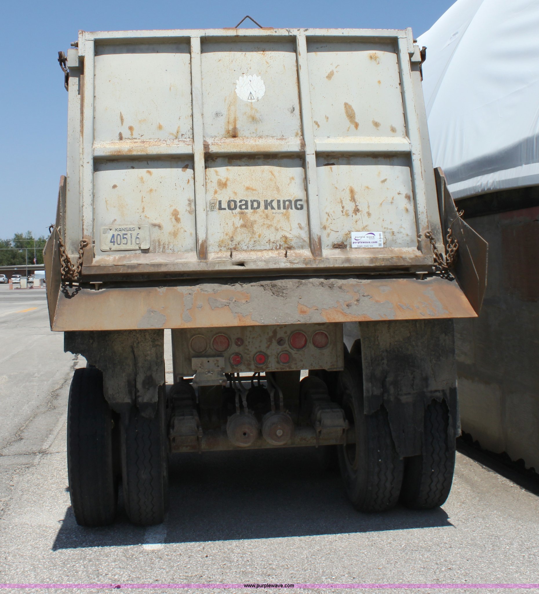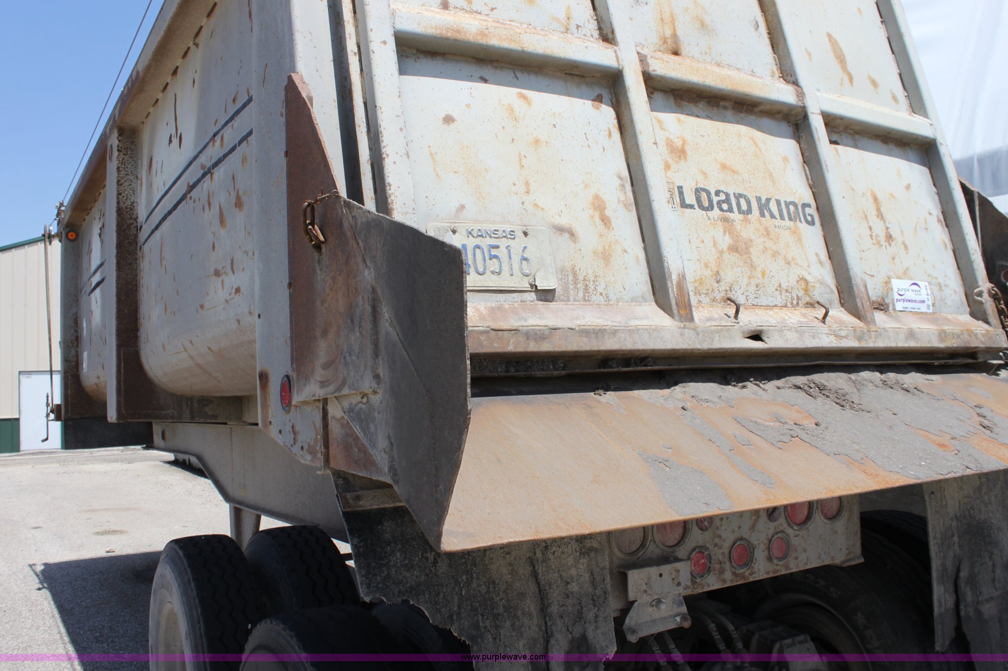 Purple Wave is selling a used End Dump Rock Trailer in Kansas. This item is a 1993 Load King 20' tandem axle dump trailer with the following: 60" side walls, Four stage single mast, Manual rollover tarp, Tarp missing, Air brakes, Watson Chalin 44,000 lb spring suspension, Air end gate, 11R22.5 tires, Unit# 61