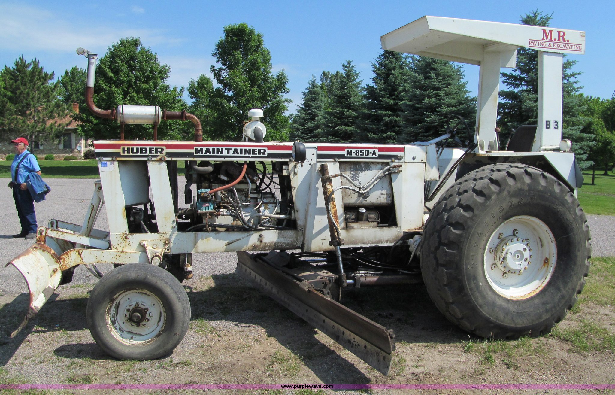 Purple Wave is selling a used Industrial Loader Tractor in Minnesota. This item is a Huber M-850-A Maintainer grader with the following: 2,522 hours on meter, John Deere three cylinder diesel engine, Hydrostatic transmission, 10' moldboard, 6-way control, 6' front hydraulic leveling blade, Canopy, Draw bar, 7.50-16 front tires, 23.1-26 rear tires, Model, Serial M162