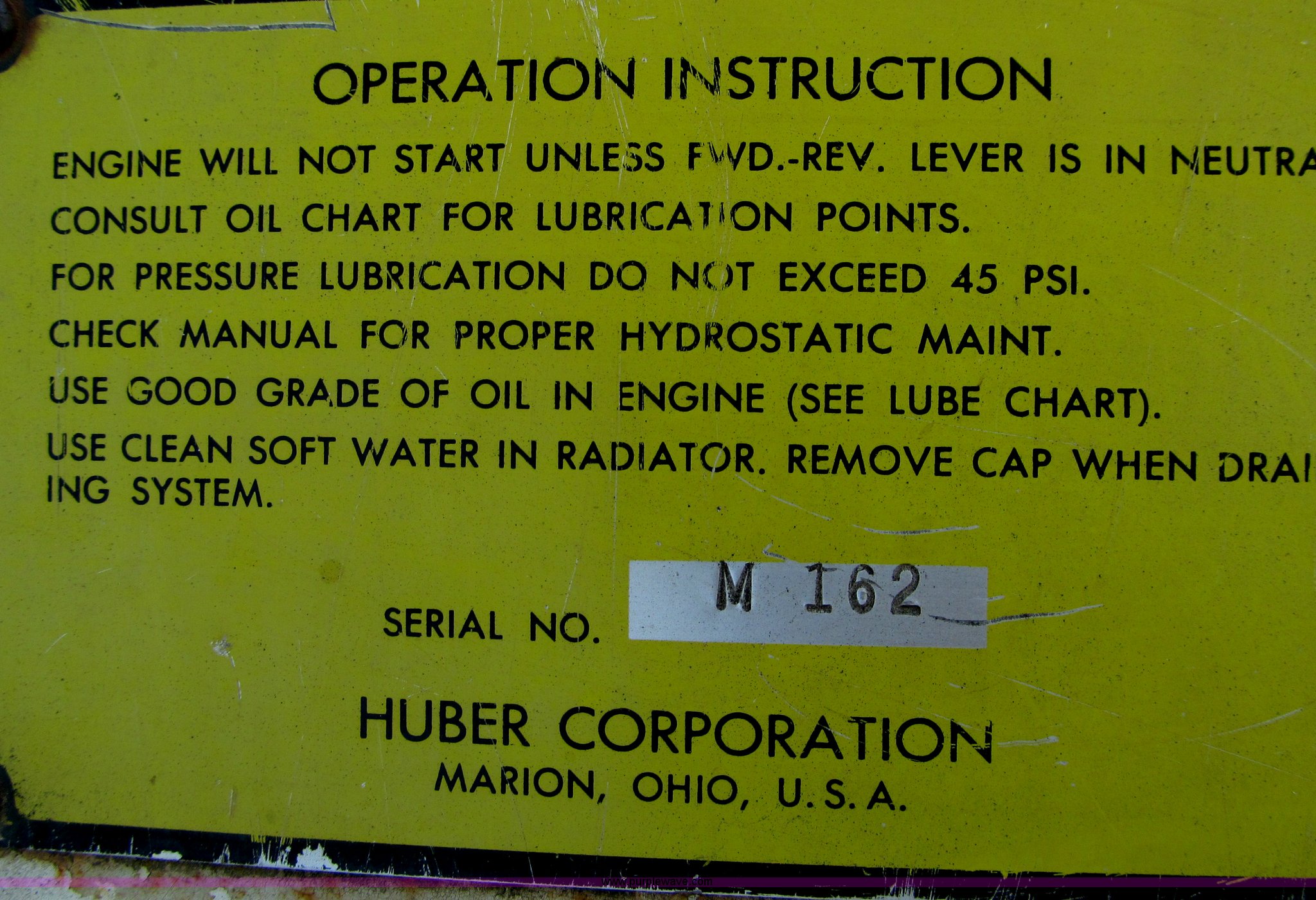 Huber M-850-A Maintainer grader. 2,522 hours on meter, John Deere three cylinder diesel engine, Hydrostatic transmission, 10' moldboard 6-way control, 6' front hydraulic leveling blade, Canopy , Draw bar, 7.50-16 front tires, 23.1-26 rear tires, Model, Serial M162. View equipment video. Shipping quotes available. 16925 County Rd 40. Carver, MN 55315