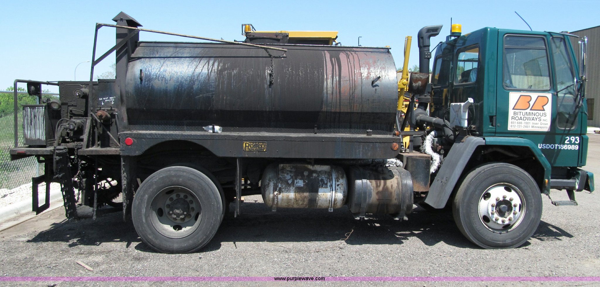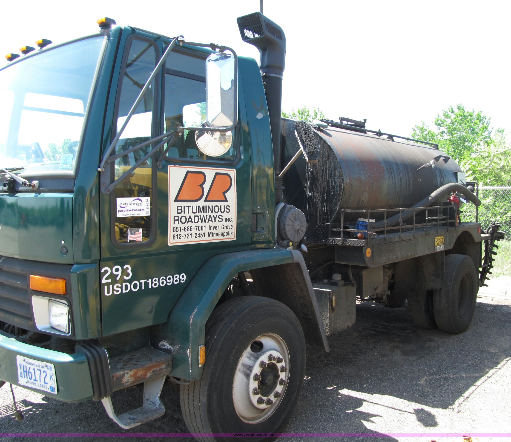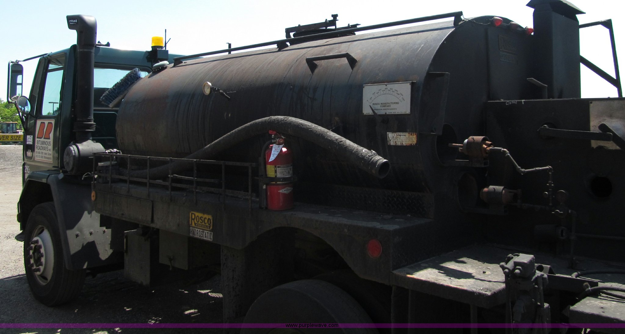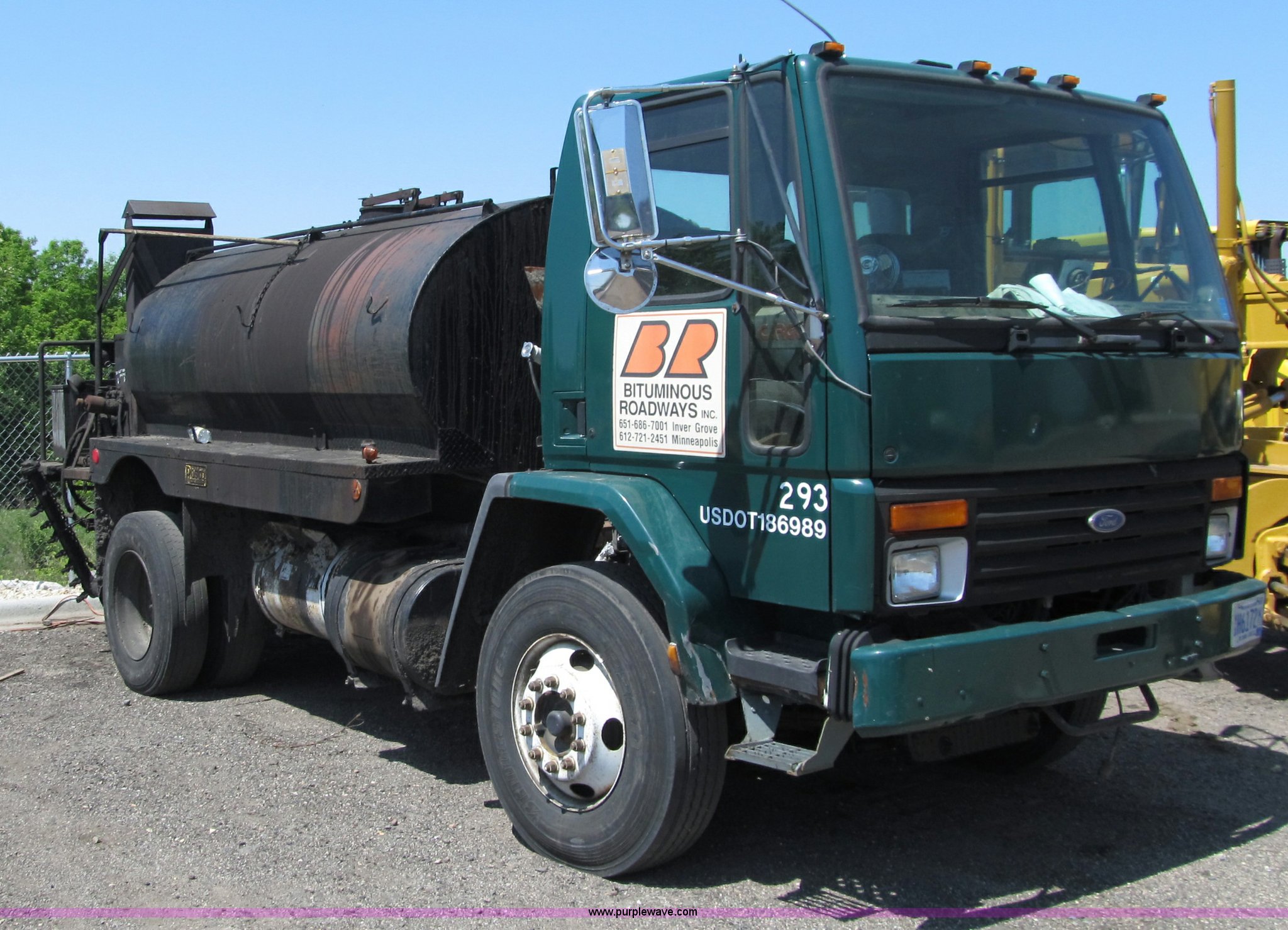 Purple Wave is selling a used Oil Distributor Truck in Minnesota. This item is a 1994 Ford CF7000 asphalt distribution truck with the following: 56,820 miles on odometer, Cummins 8.3L diesel engine, Eaton Fuller 5+2 transmission, Heat, AM/FM, Wet kit, Strobe light, Rosco distributor, 1,300 gallon tank, Cab controls with curb, spray, bar, and side shift, Transfer hose, 12' spray bar, LP heater, Hydrostatic asphalt pump, Pump heated by engine cooling system, 11R22.5 tires, Bent side shift bar, needs repair