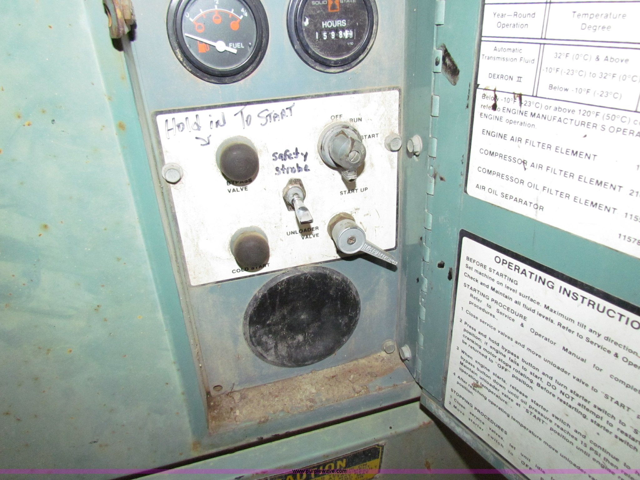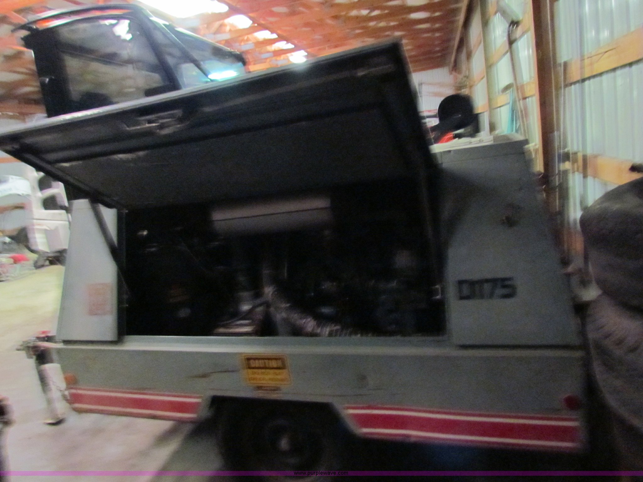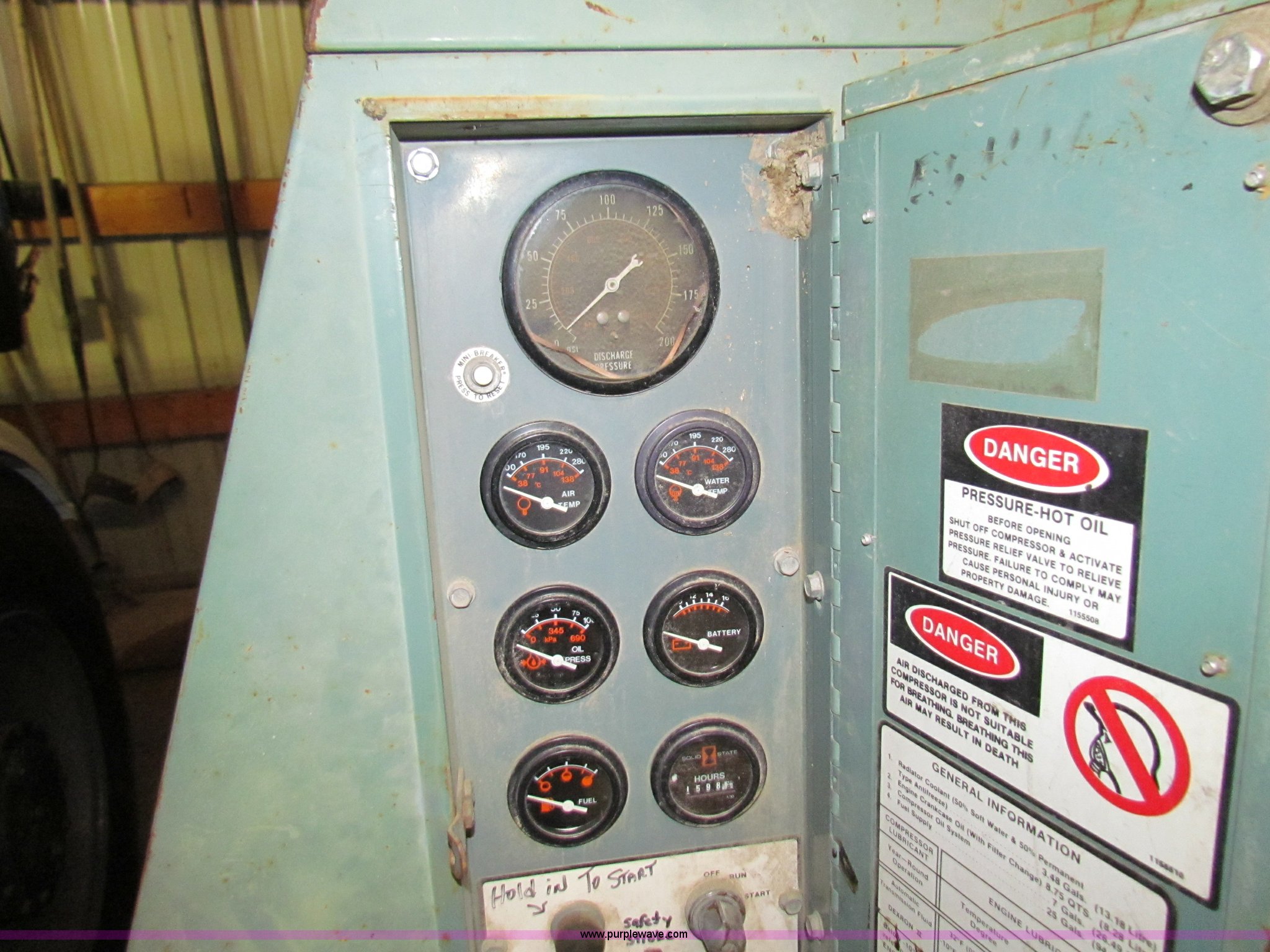 Purple Wave is selling a used Air Compressor in Kansas. This item is a Gardner Denver air compressor with the following: 1,598 hours on meter, Four cylinder diesel engine, 2,025 RPM maximum, 175 CFM capacity, 100 PSI maximum pressure, Pintle hitch, Hammer and 1" hose included, 15" tires, Recently replaced battery, Model D017SPR1A, Serial 1703522