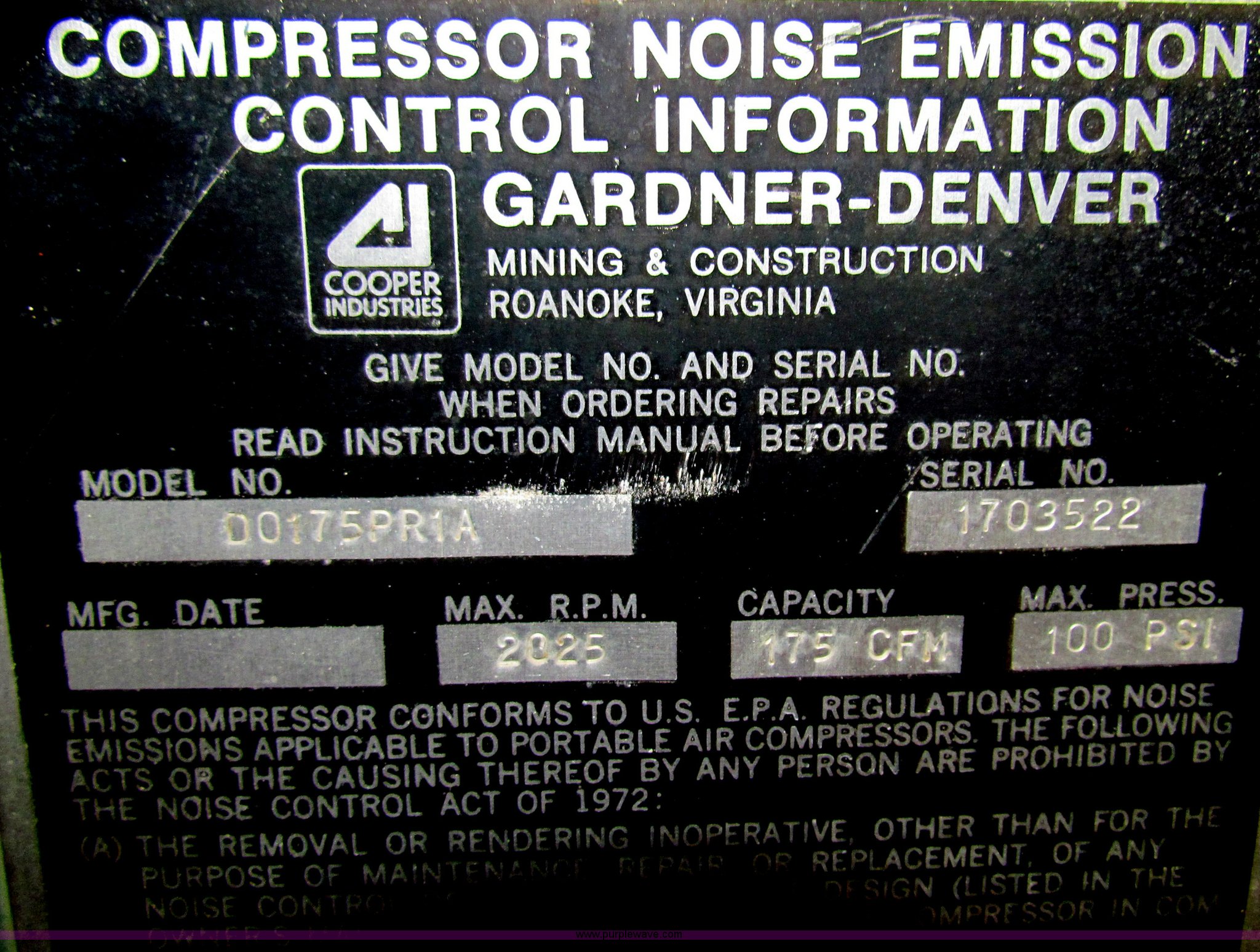 Gardner Denver air compressor. 1,598 hours on meter, Four cylinder diesel engine, 2,025 RPM maximum, 175 CFM capacity, 100 PSI maximum pressure, Pintle hitch, Hammer and 1" hose included, 15" tires, Recently replaced battery, Model D017SPR1A, Serial 1703522. Minneha Township. Andover, KS 67002